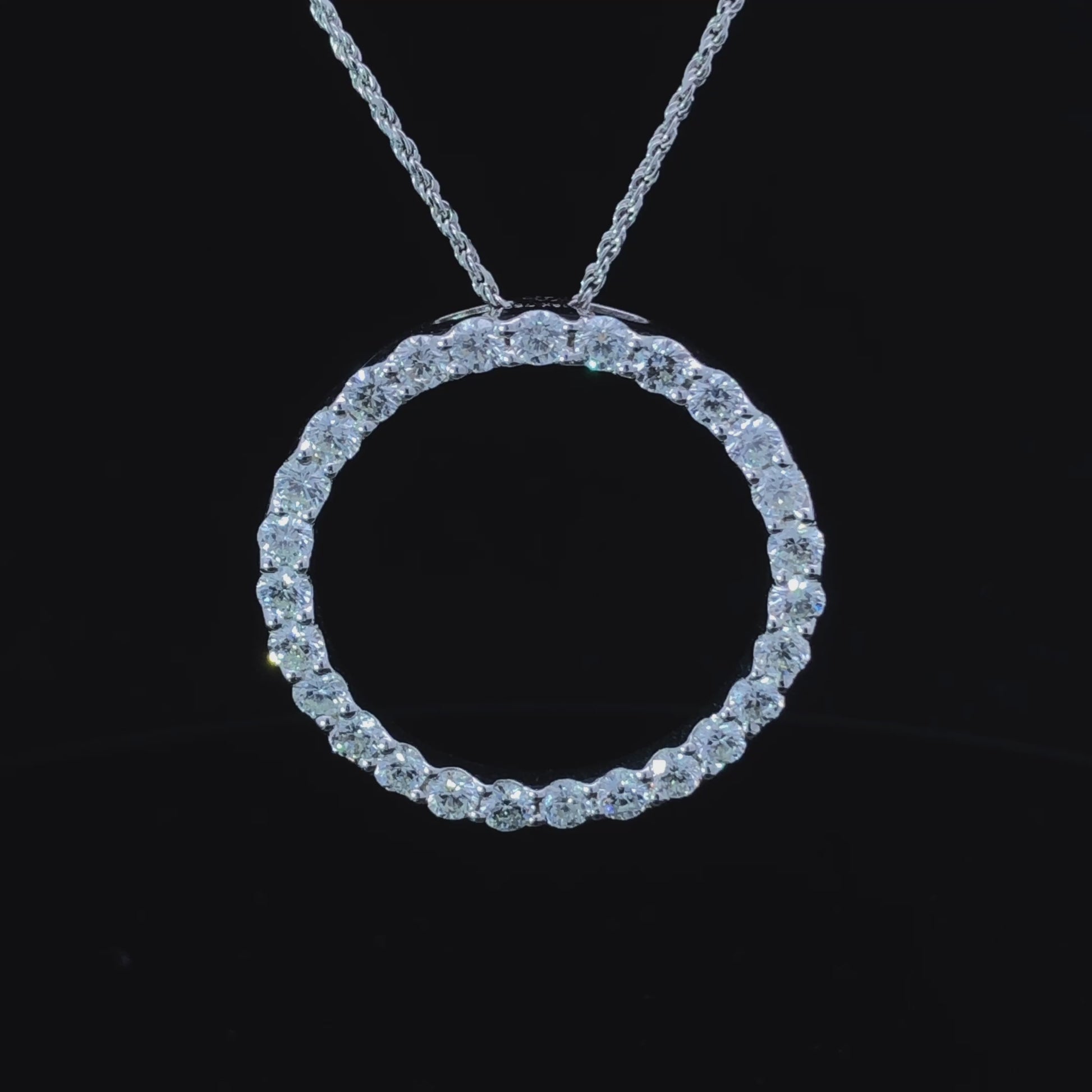 This sparkling diamond circle pendant set in 18kt white gold features 2.46ctw of diamond brilliance, sure to make an eye-catching statement. Its timeless design is crafted from premium 18kt white gold, making it the perfect piece of jewelry for any occasion. Chain is not included.