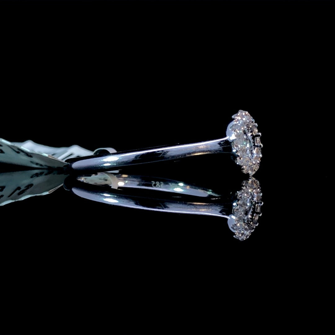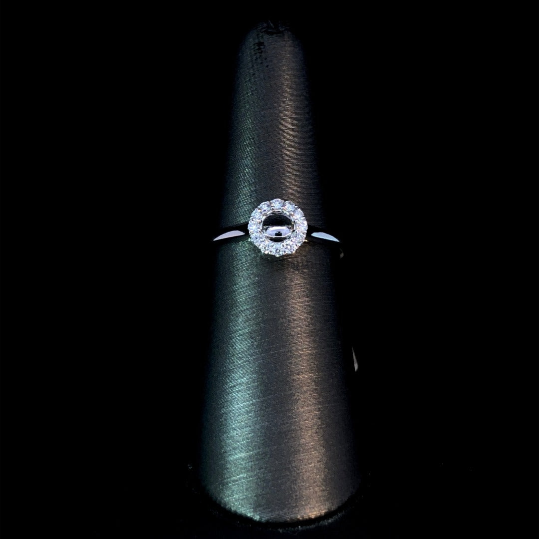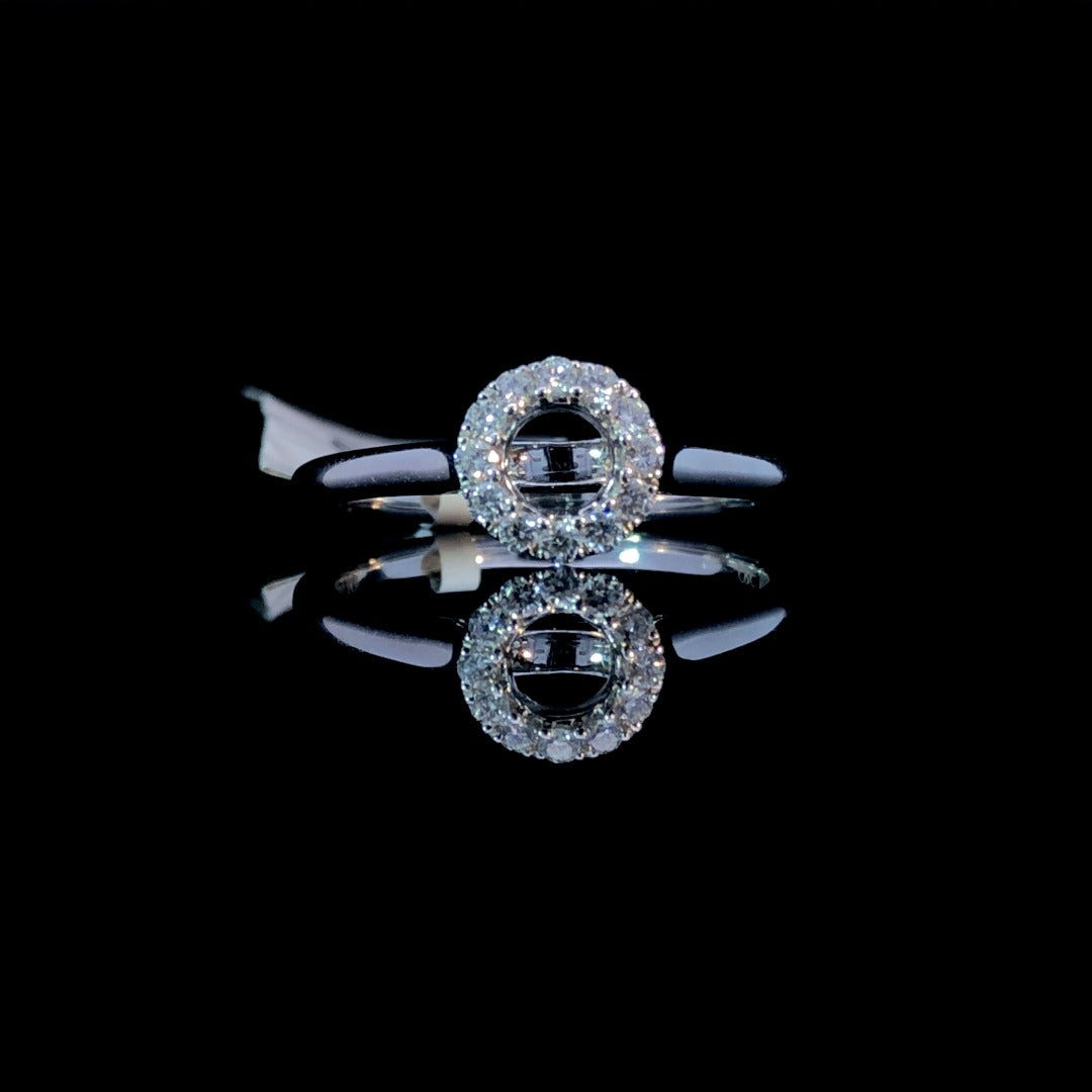 Indulge in luxury with our timeless diamond semi mount. With a .18ctw round diamond halo and smooth 14kt white gold band, this piece exudes sophistication and elegance. Personalize it with your choice of round center stone for a truly special touch. Price is for the semi mount only. Center stone will be added at an additional cost. This ring is a size 6.5. If that size is not a perfect fit, first time sizing is free at the time of purchase. Additional sizing fees may apply.