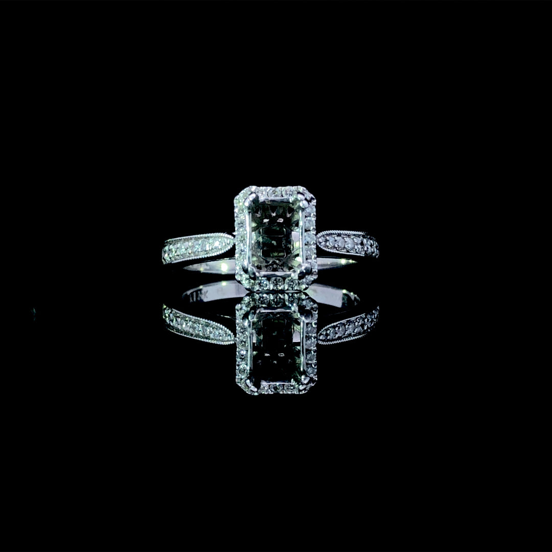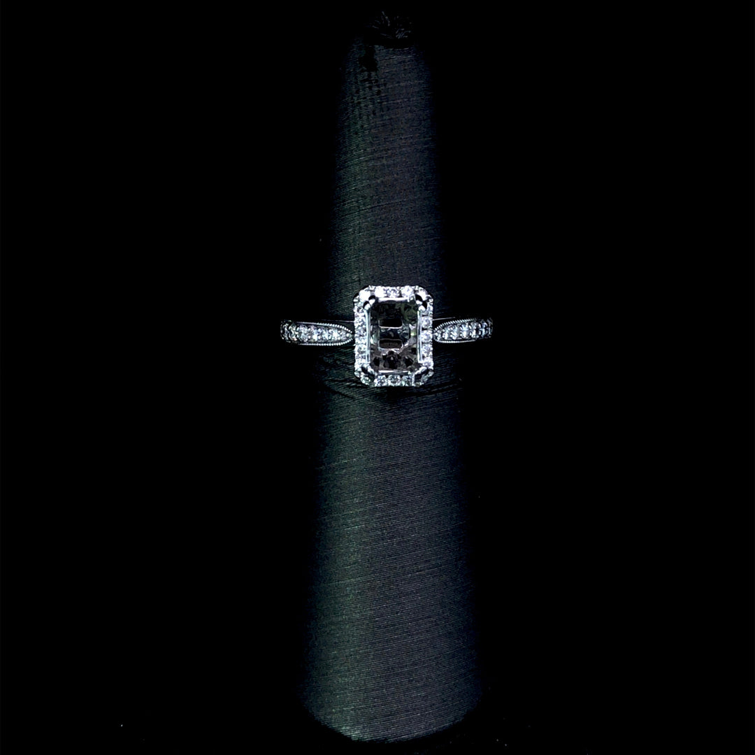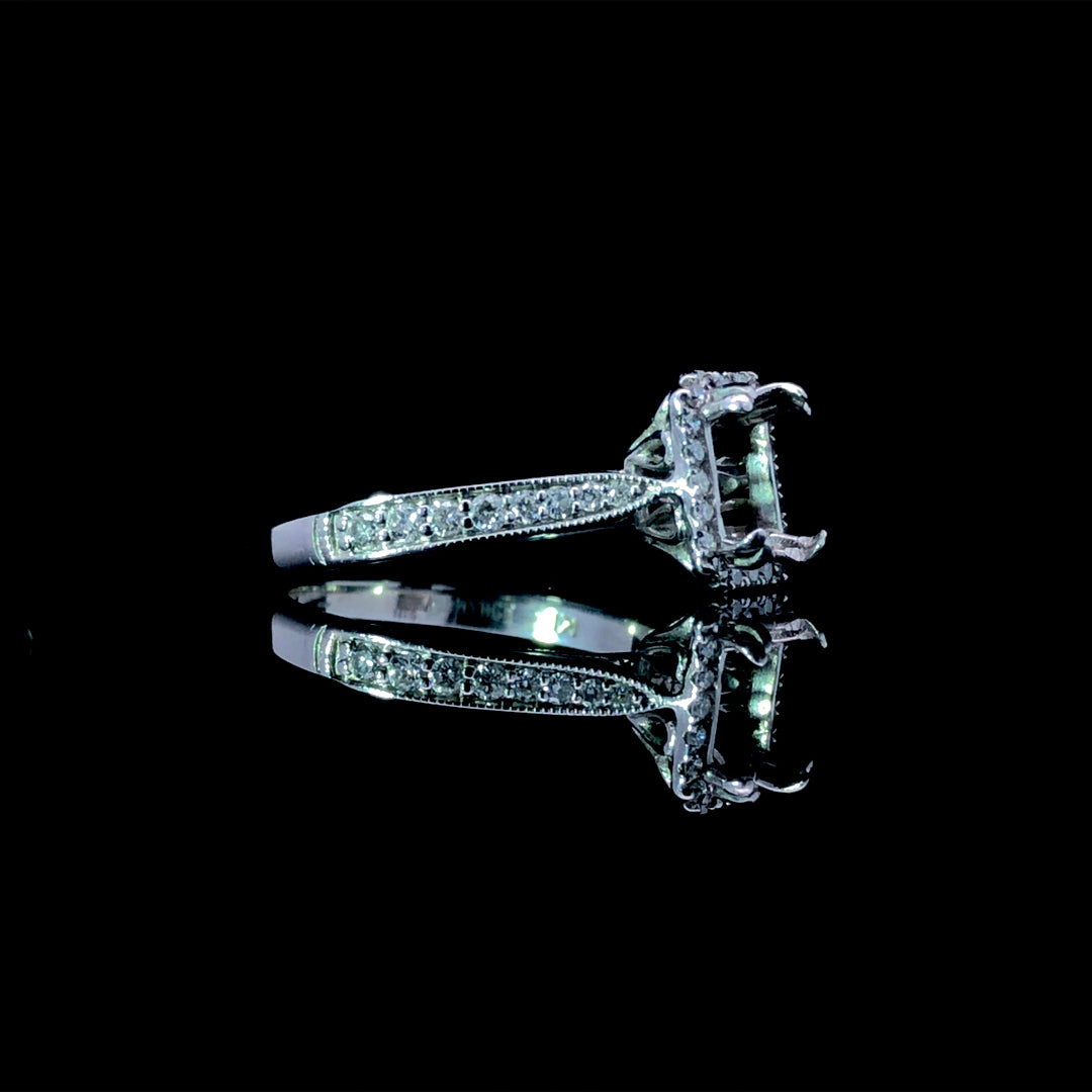 Discover the perfect canvas for your dream diamond with this elegant semi mount. Featuring a rectangular halo design and cathedral-style band, this 14kt white gold setting showcases .34ctw of sparkling round diamonds accented with delicate milgrain detailing. The sophisticated architecture of this piece provides the ideal frame for your chosen center stone. Browse our extensive collection of loose diamonds to find the perfect match and create a truly personalized engagement ring that reflects your unique style and vision. Price is for the semi mount only. Center stone will be added at an additional cost. This ring is a size 6. If that size is not a perfect fit, first time sizing is free at the time of purchase. Additional sizing fees may apply.