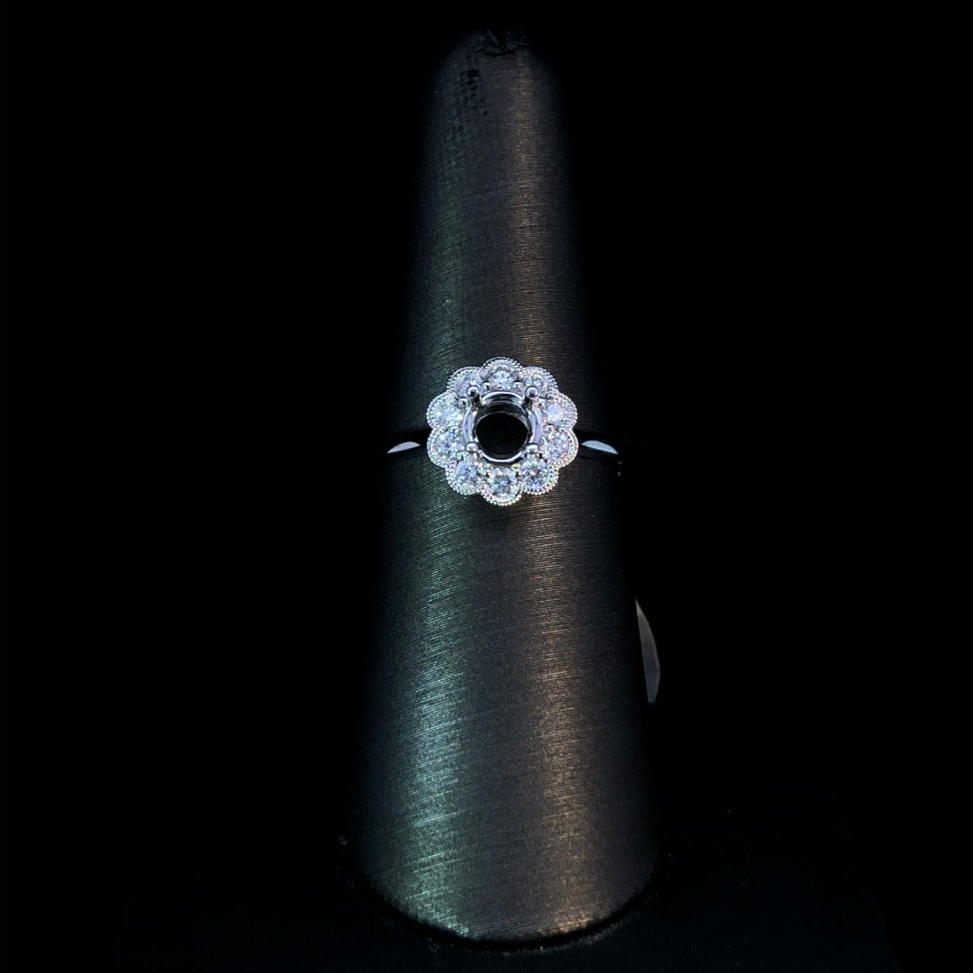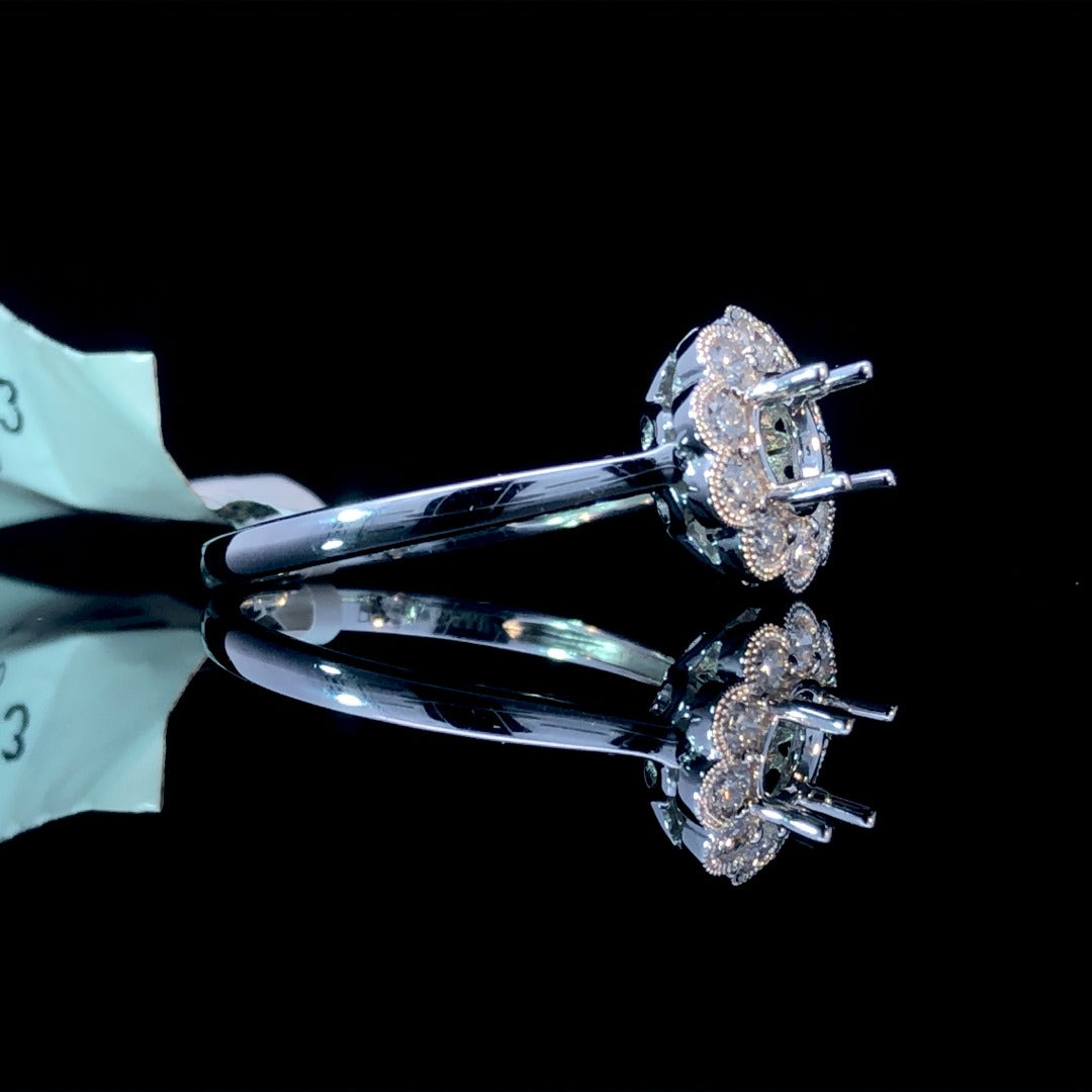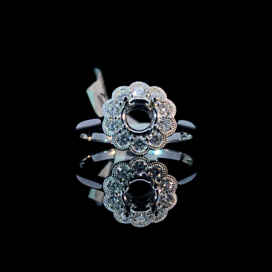 Elevate your style with this a chic diamond semi mount. Its decorative halo, featuring .34ctw of round diamonds and milgrain detailing, rests atop a sleek 14kt white gold band. Choose the perfect round center stone from our unbeatable selection to complete this exquisite piece. Price is for the semi mount only. Center stone will be added at an additional cost. This ring is a size 6.75. If that size is not a perfect fit, first time sizing is free at the time of purchase. Additional sizing fees may apply.