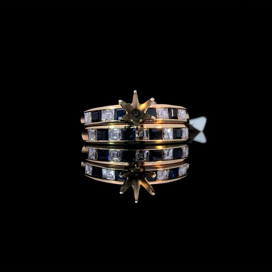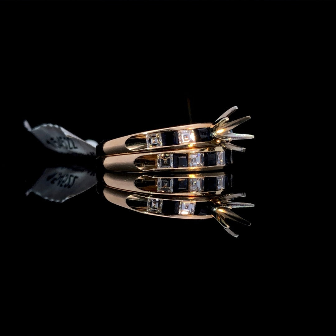 Indulge in true luxury with our gorgeous semi mount and band. Featuring a stunning pattern of princess cut diamonds and sapphires on 14kt yellow gold, this set exudes sophistication and elegance. Choose your center stone from our collection of loose stones to complete the look. Price is for the semi and band only. Center stone will be added at an additional cost. This ring is a size 7. If that size is not a perfect fit, first time sizing is free at the time of purchase. Additional sizing fees may apply.