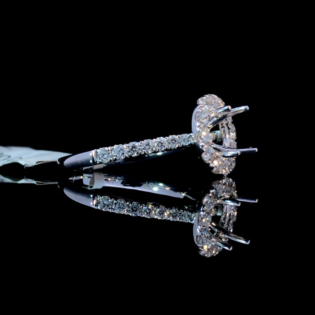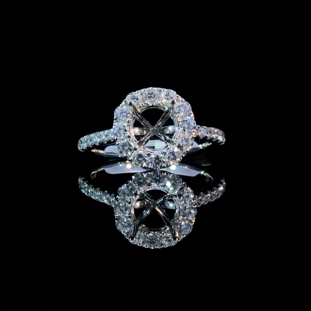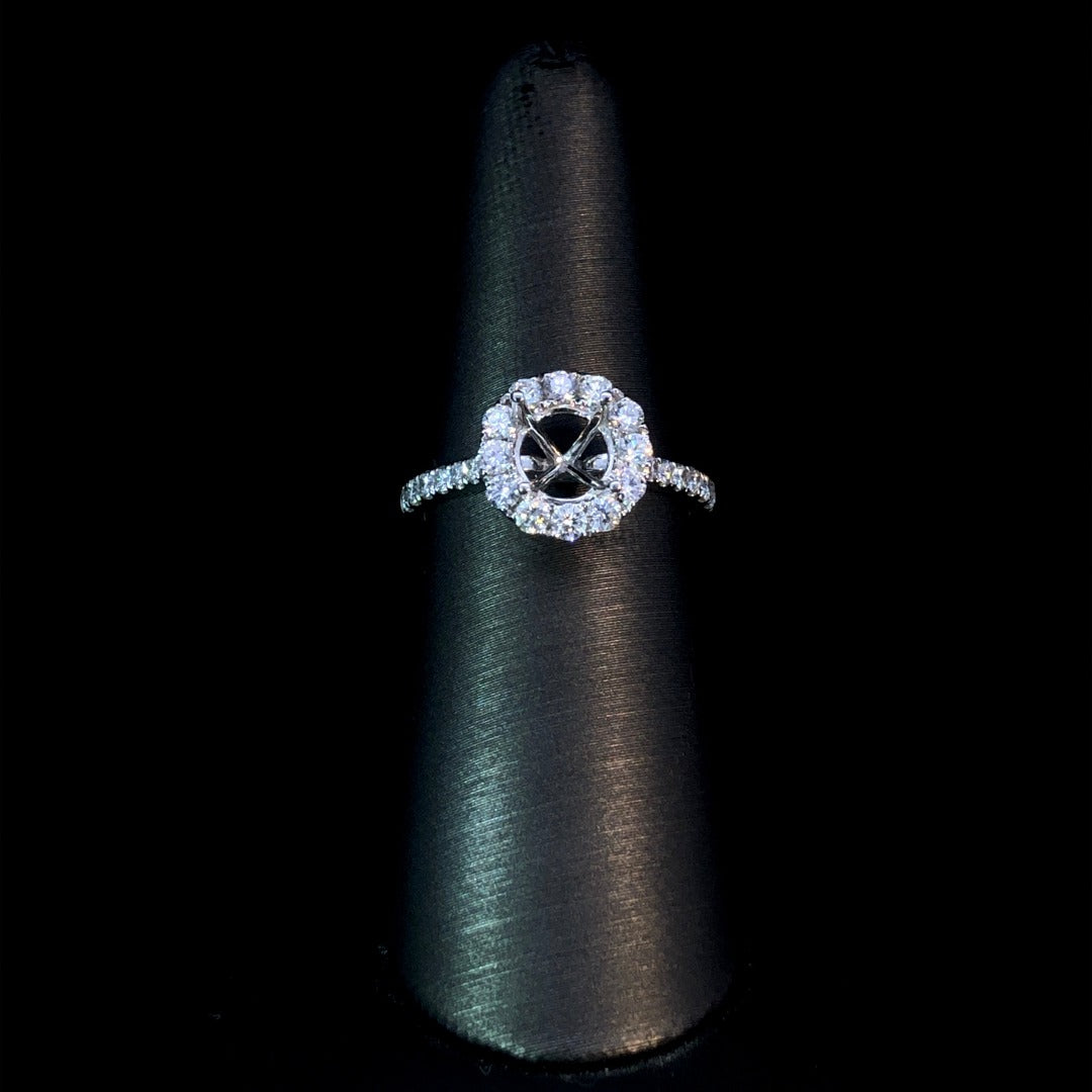 This stunning diamond semi mount captures the essence of timeless elegance with its classic round halo design and cascading diamonds down the band. Crafted in 14kt white gold, it boasts .75ctw of round diamonds for a touch of luxury. Complete the look with a center stone of your choice from our unmatched selection. Price is for the semi mount only. Center stone will be added at an additional cost. This ring is a size 6.5. If that size is not a perfect fit, first time sizing is free at the time of purchase. Additional sizing fees may apply.