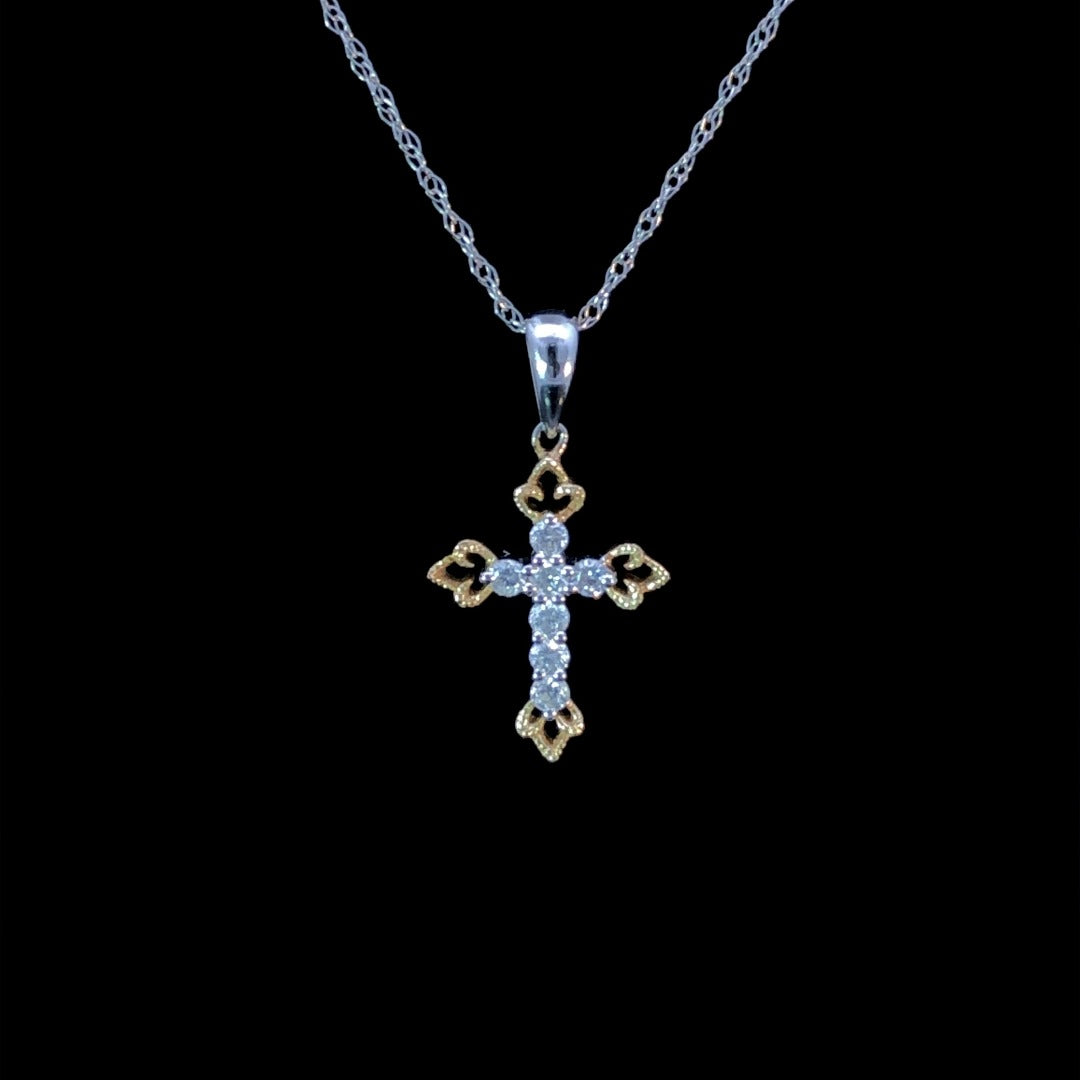Delight in the beauty of this stunning diamond cross pendant. Crafted with .15ctw of dazzling round diamonds set in white gold with yellow gold decorative ends, this piece is sure to capture the eye and sparkle with radiant elegance. Chain is not included.
