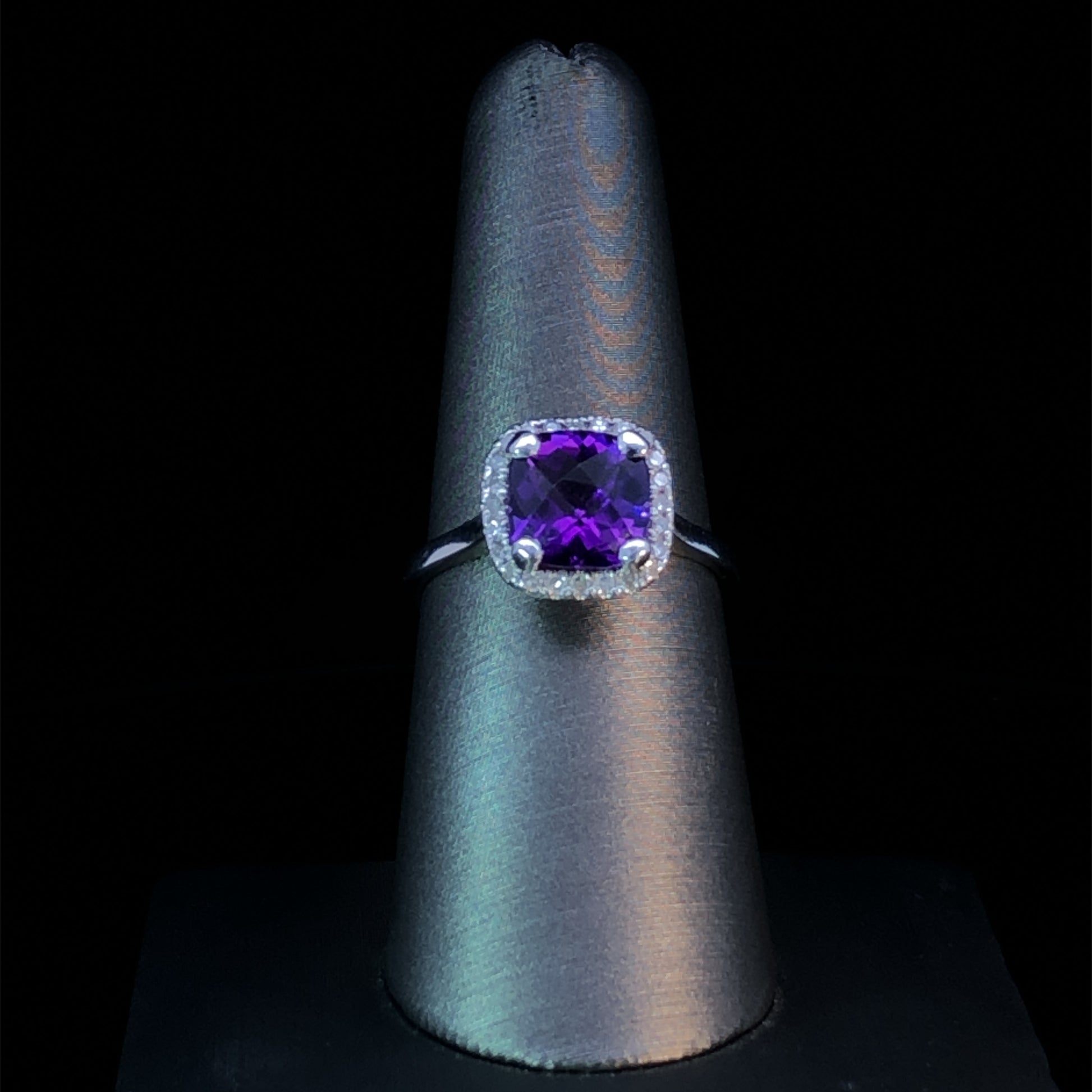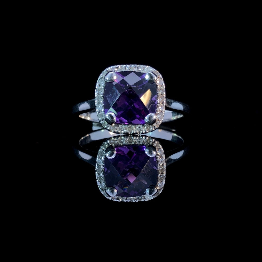 This elegant 14kt white gold ring centers around a cushion-cut amethyst, surrounded by a halo of sparkling round diamonds totaling .14ctw. The perfect accessory for a special event, this gemstone ring evokes a feel of luxury and sophistication. This ring is a size 7.5. If that size is not a perfect fit, first time sizing is free at the time of purchase. Additional sizing fees may apply.