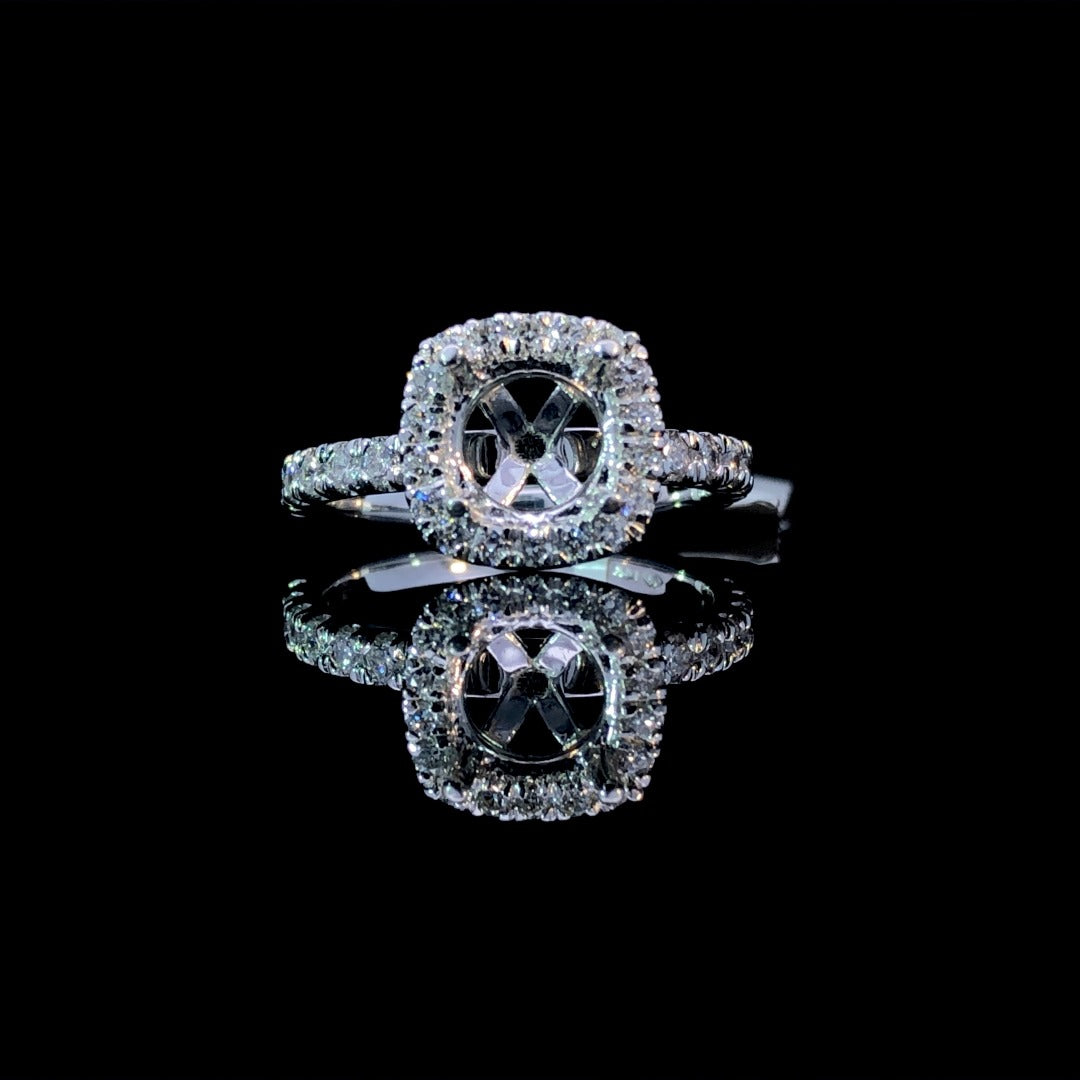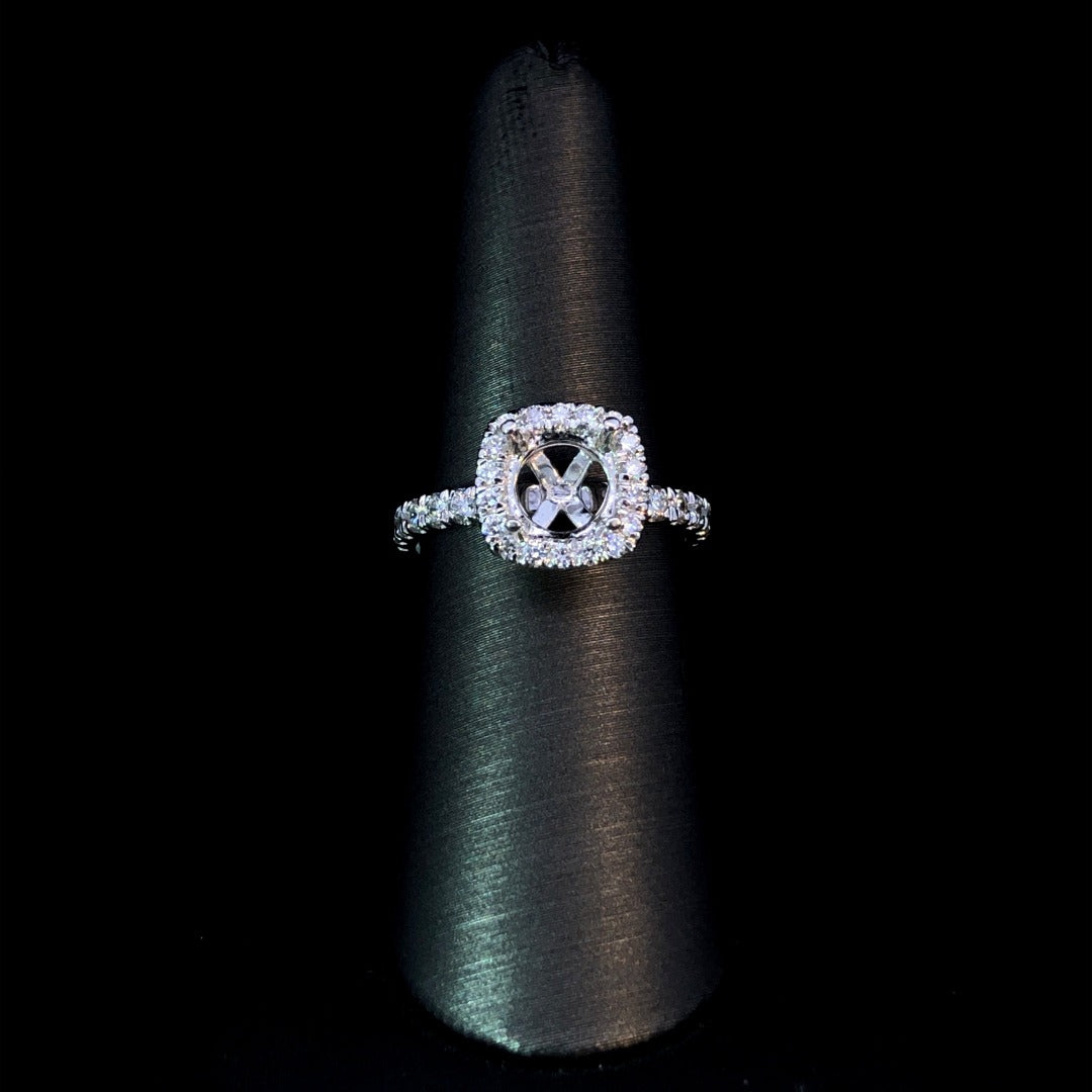 Indulge in luxury with our gorgeous diamond semi mount. Featuring a cushion-shaped halo design with sparkling round diamonds, the band is adorned with additional diamonds totaling .69ctw. Crafted in 14kt white gold, this stunning ring can be completed with your choice of center stone from our loose stone collection. Price is for the semi mount only. Center stone will be added at an additional cost. This ring is a size 6.5. If that size is not a perfect fit, first time sizing is free at the time of purchase. Additional sizing fees may apply.