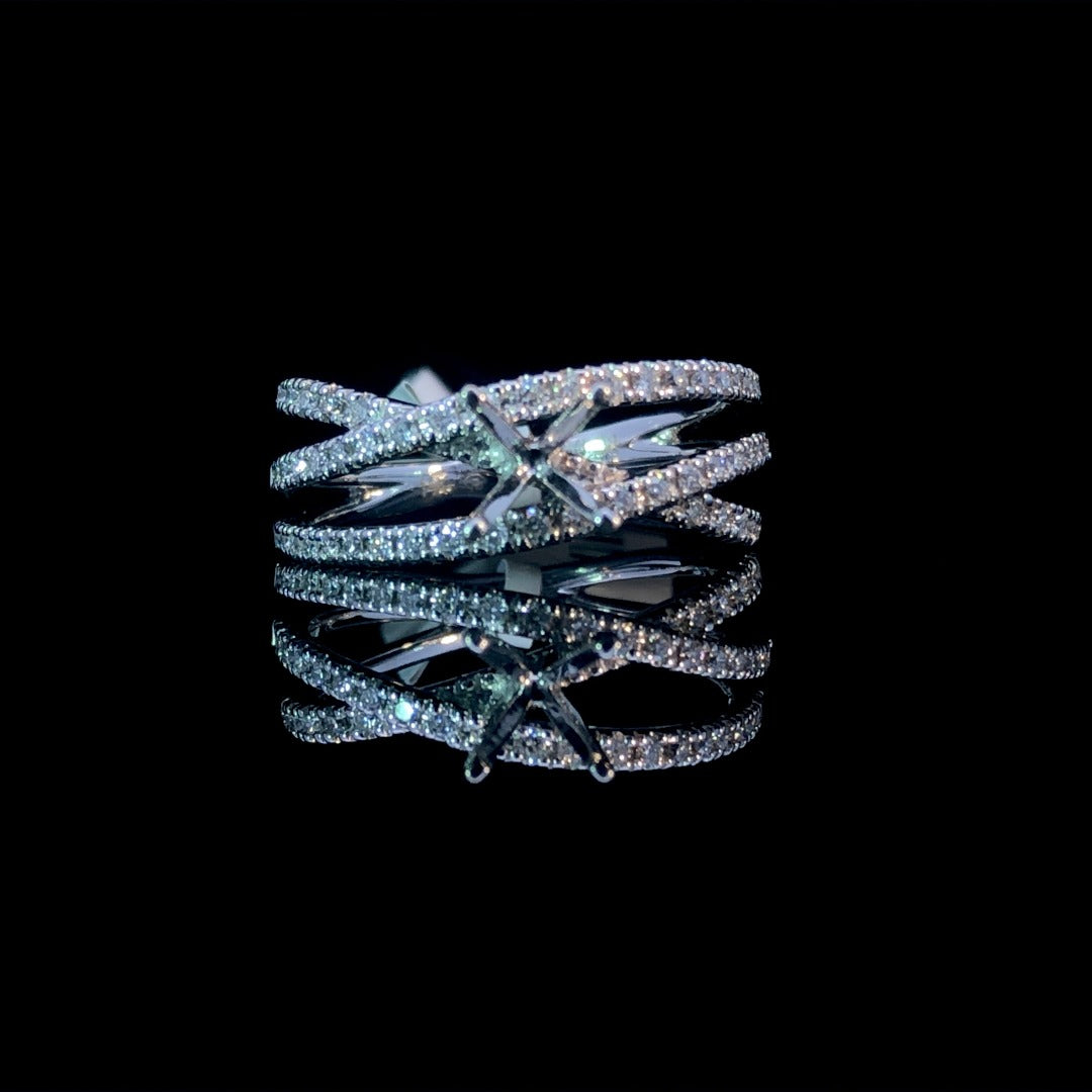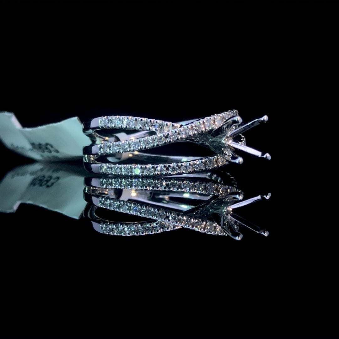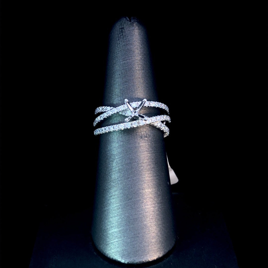 Create a one-of-a-kind masterpiece with this 14kt white gold diamond semi mount. Three rows of sparkling round diamonds, totaling .38ctw, surround your chosen center stone. Hand-crafted by our skilled jewelers, this stunning piece will be a true work of art. Choose your perfect center stone and bring your dream piece to life! Price is for the semi mount only. Center stone will be added at an additional cost. This ring is a size 6.5. If that size is not a perfect fit, first time sizing is free at the time of purchase. Additional sizing fees may apply.