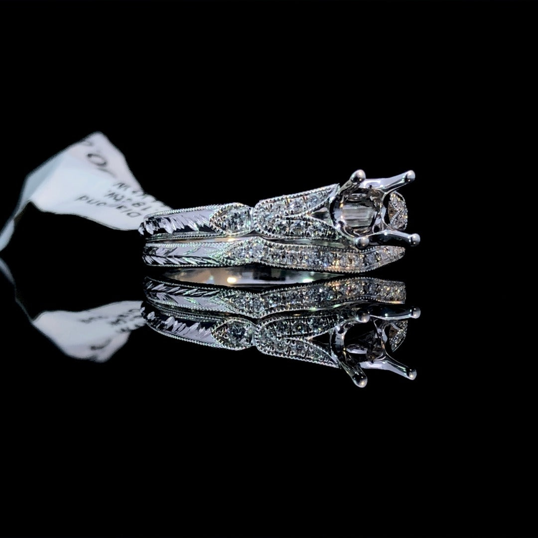 Indulge in luxury with our stunning set. The exquisite diamond semi mount boasts a split shank, intricate etching, and milgrain edging. Paired with a contour band, this set exudes elegance with .18ctw of round diamonds, you are sure to turn heads. Pick your center stone from our expansive collection to complete this breathtaking set. Price is for the semi mount only. Center stone will be added at an additional cost. This is a size 6.5. If that size is not a perfect fit, first time sizing is free at the time of purchase. Additional sizing fees may apply.