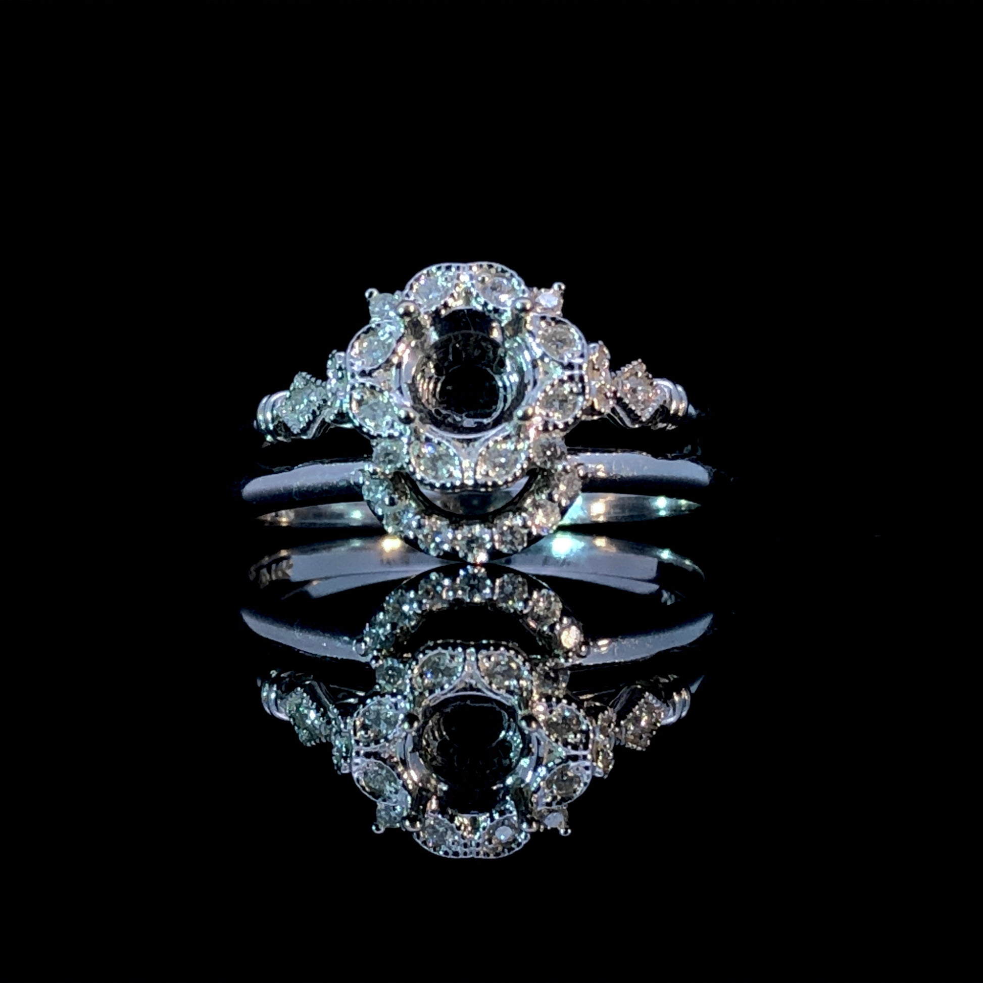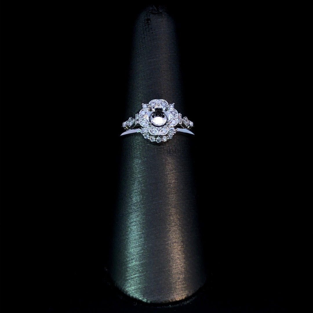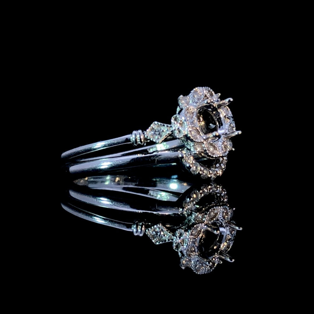 Indulge in elegance with our stunning diamond semi mount. Its exquisite round diamond decorative halo and side stones set within milgrain detailing showcase a total diamond weight of .08ctw in 14kt white gold. Pair it with the matching diamond contour band (sold separately) for a complete set. Choose your perfect center stone from our unmatched selection. Price is for the semi mount only. Center stone will be added at an additional cost. This ring is a size 7. If that size is not a perfect fit, first time sizing is free at the time of purchase. Additional sizing fees may apply.