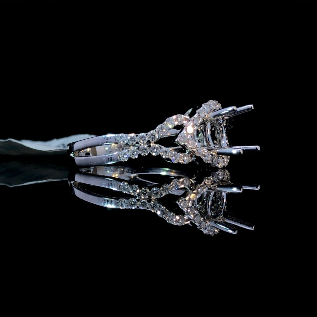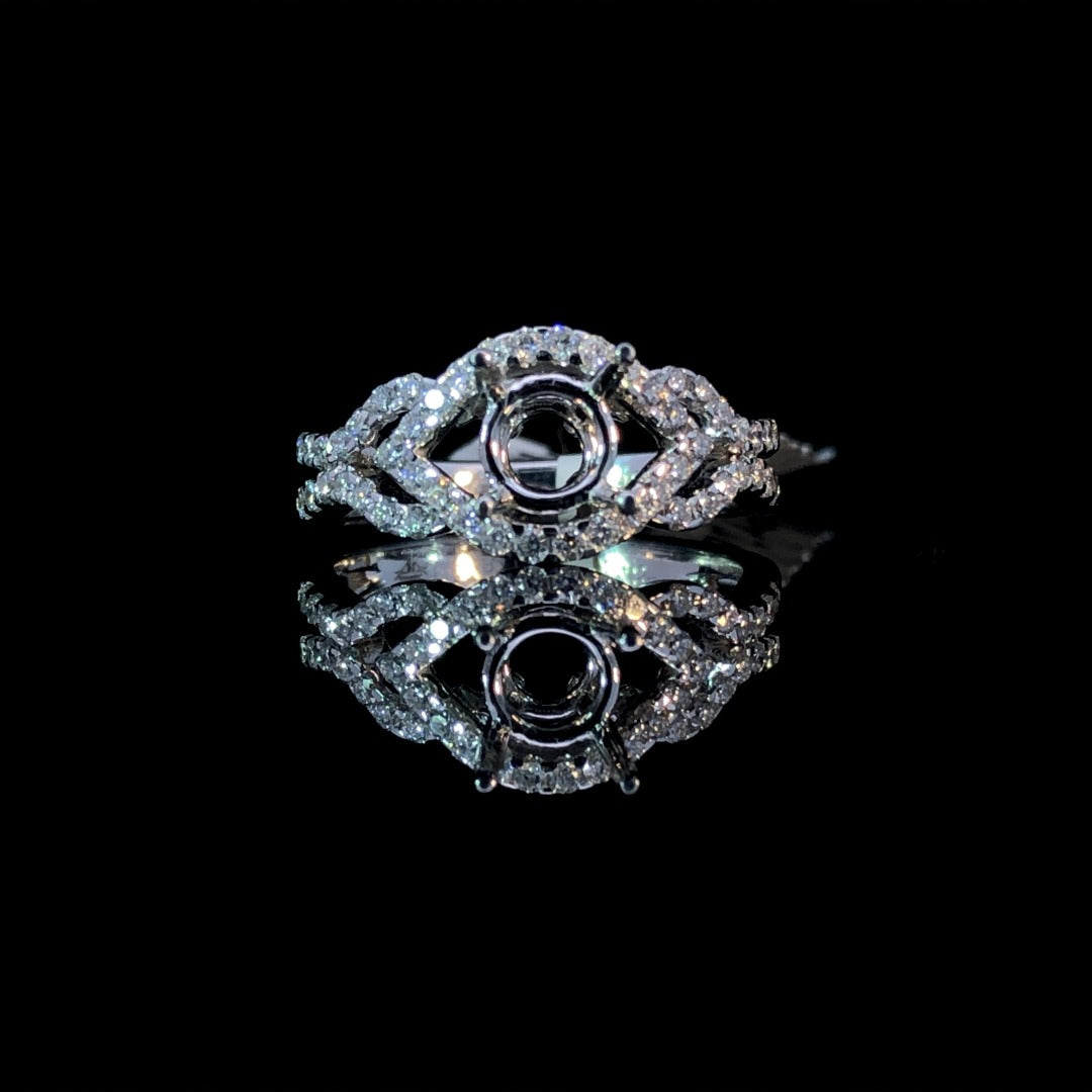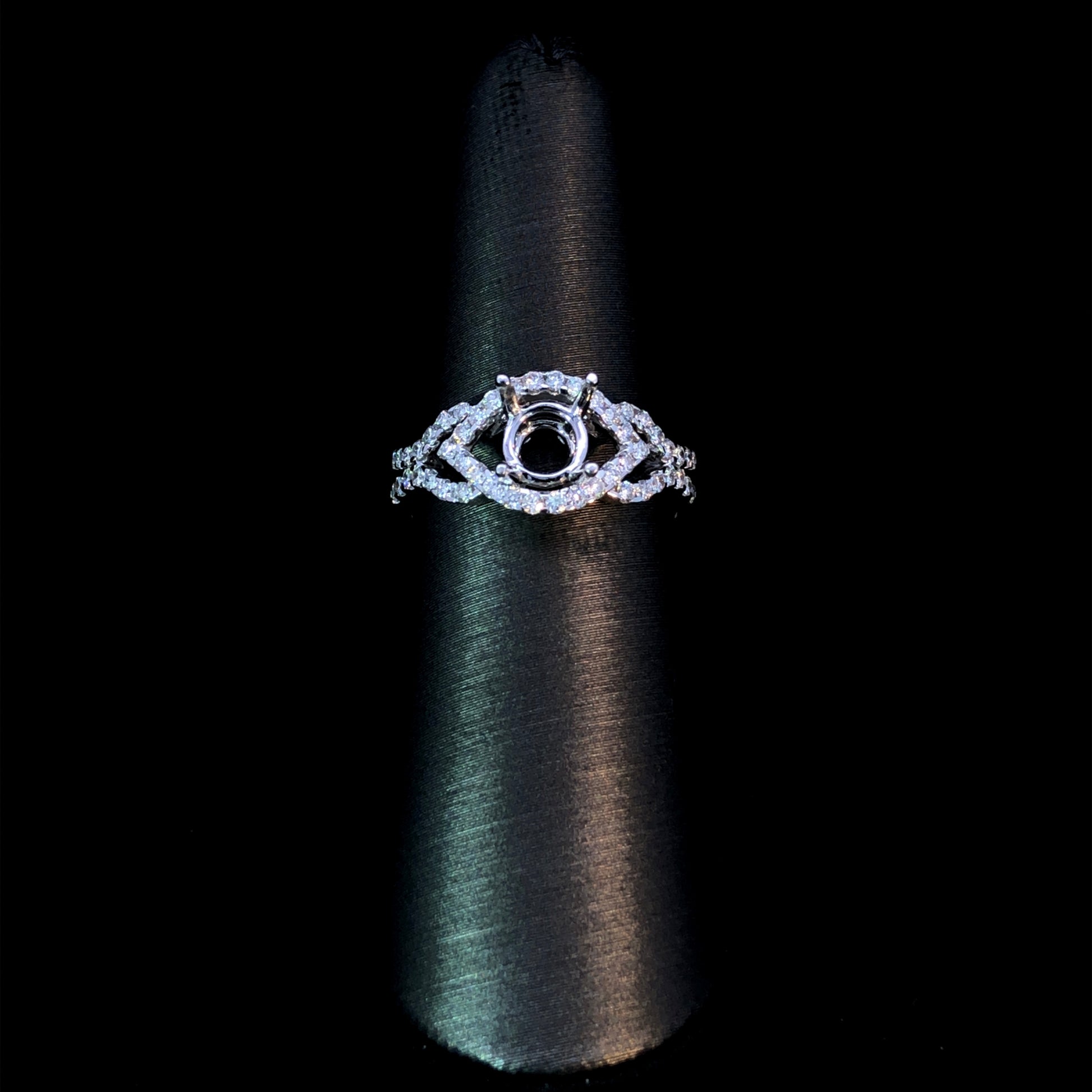 Create a stunning, custom engagement ring with our gorgeous diamond semi mount. Crafted in 14kt white gold, this elegant piece features a mesmerizing design adorned with .48ctw of brilliant round diamonds. Choose a center stone from our wide selection to make this ring truly one-of-a-kind! Price is for the semi mount only. Center stone will be added at an additional cost. This ring is a size 6.5. If that size is not a perfect fit, first time sizing is free at the time of purchase. Additional sizing fees may apply.