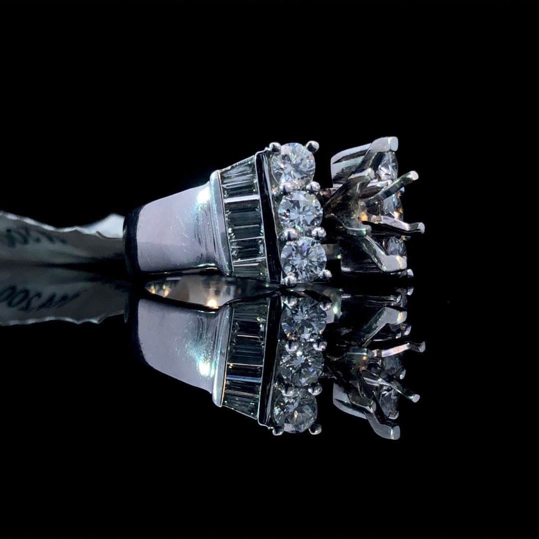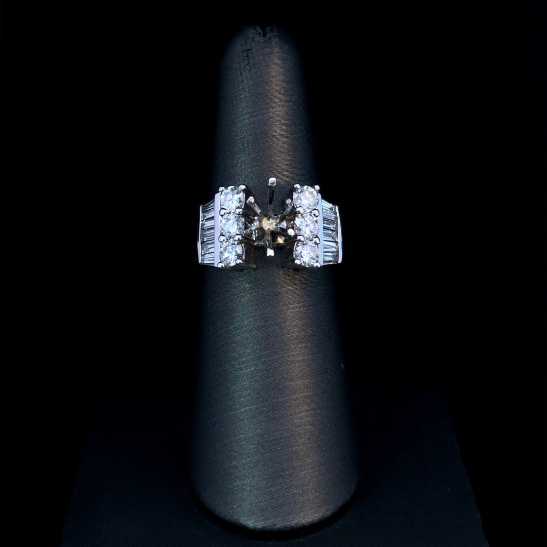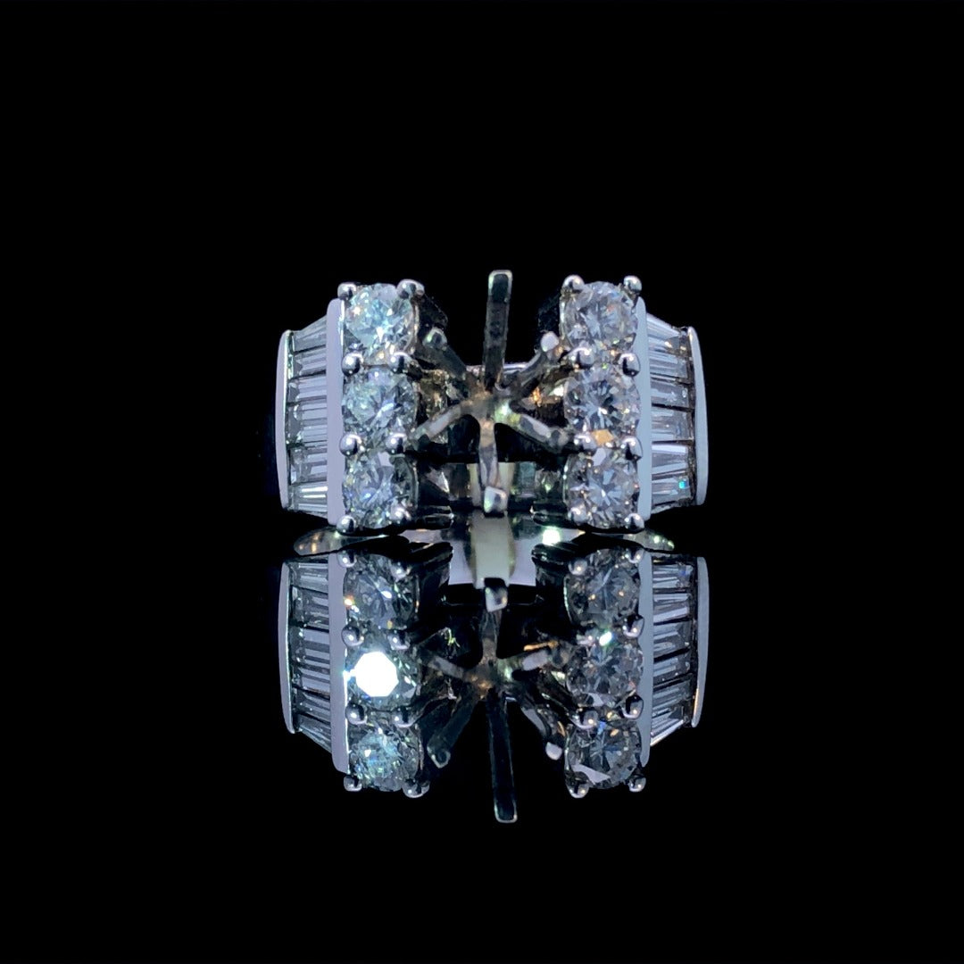 Sparkle and shine with this stunning diamond semi mount. Its 1.40ctw of round and baguette diamonds set in 14kt white gold exude luxury and elegance. Personalize it with your choice of center stone from our extensive selection. Elevate any look with this eye-catching statement piece. Price is for the semi mount only. Center stone will be added at an additional cost. This ring is a size 7. If that size is not a perfect fit, first time sizing is free at the time of purchase. Additional sizing fees may apply.