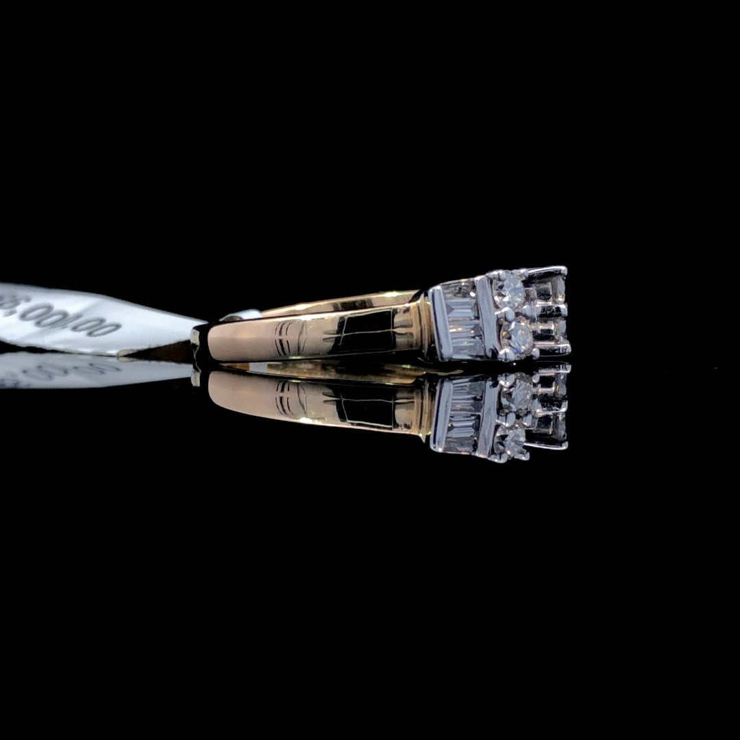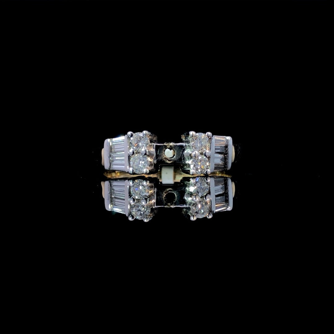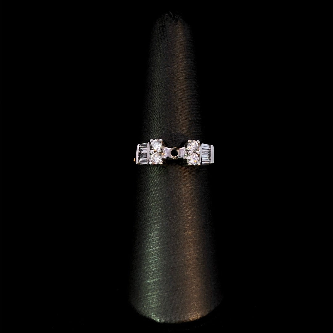 Elevate your style with our beautiful diamond semi mount. Featuring .48ctw of round and baguette diamonds in a stunning mix of white and yellow gold, the center stone can be chosen from our extensive collection. A timeless classic with a touch of contrast, perfect for completing any sophisticated look. Price is for the semi mount only. Center stone will be added at an additional cost. This ring is a size 7. If that size is not a perfect fit, first time sizing is free at the time of purchase. Additional sizing fees may apply.