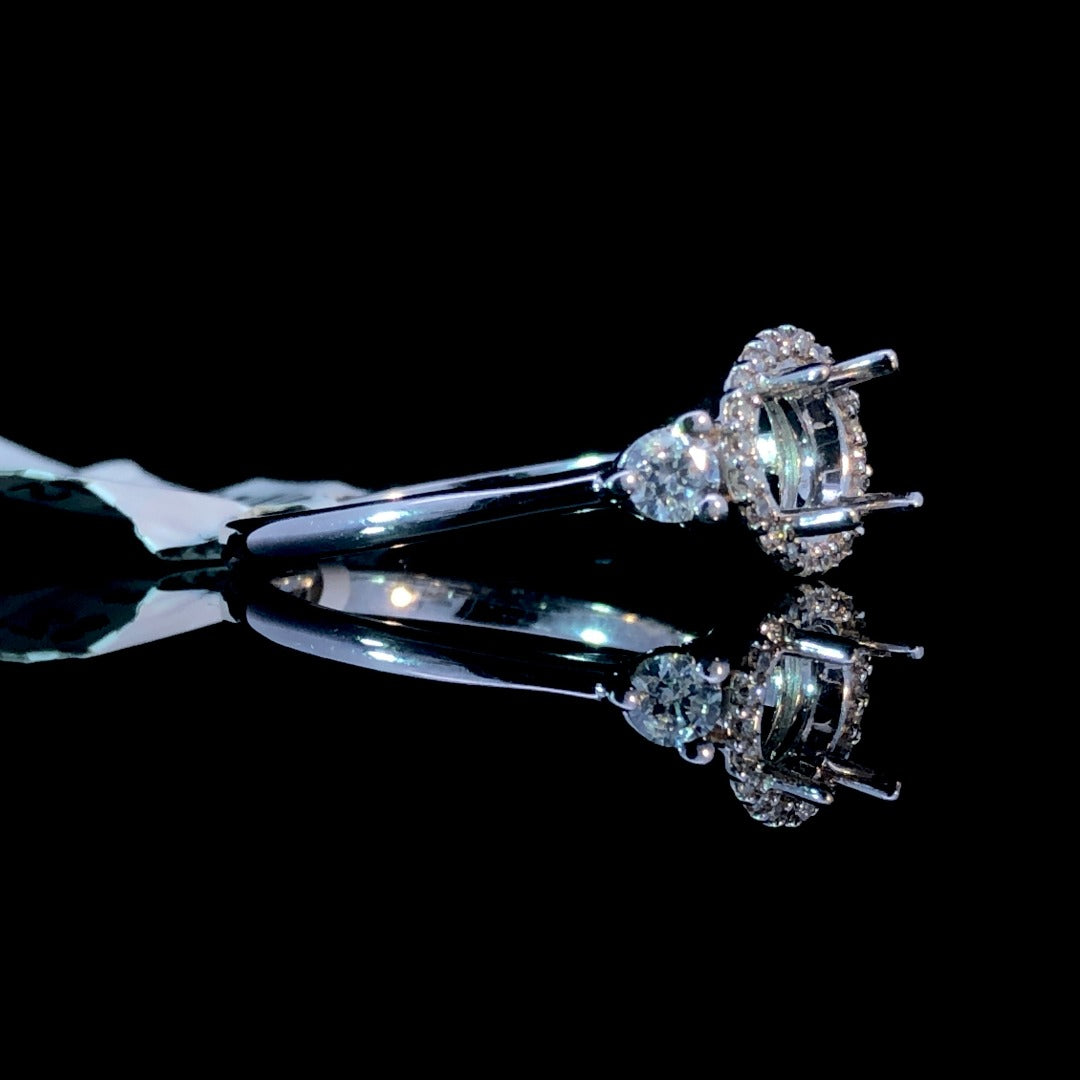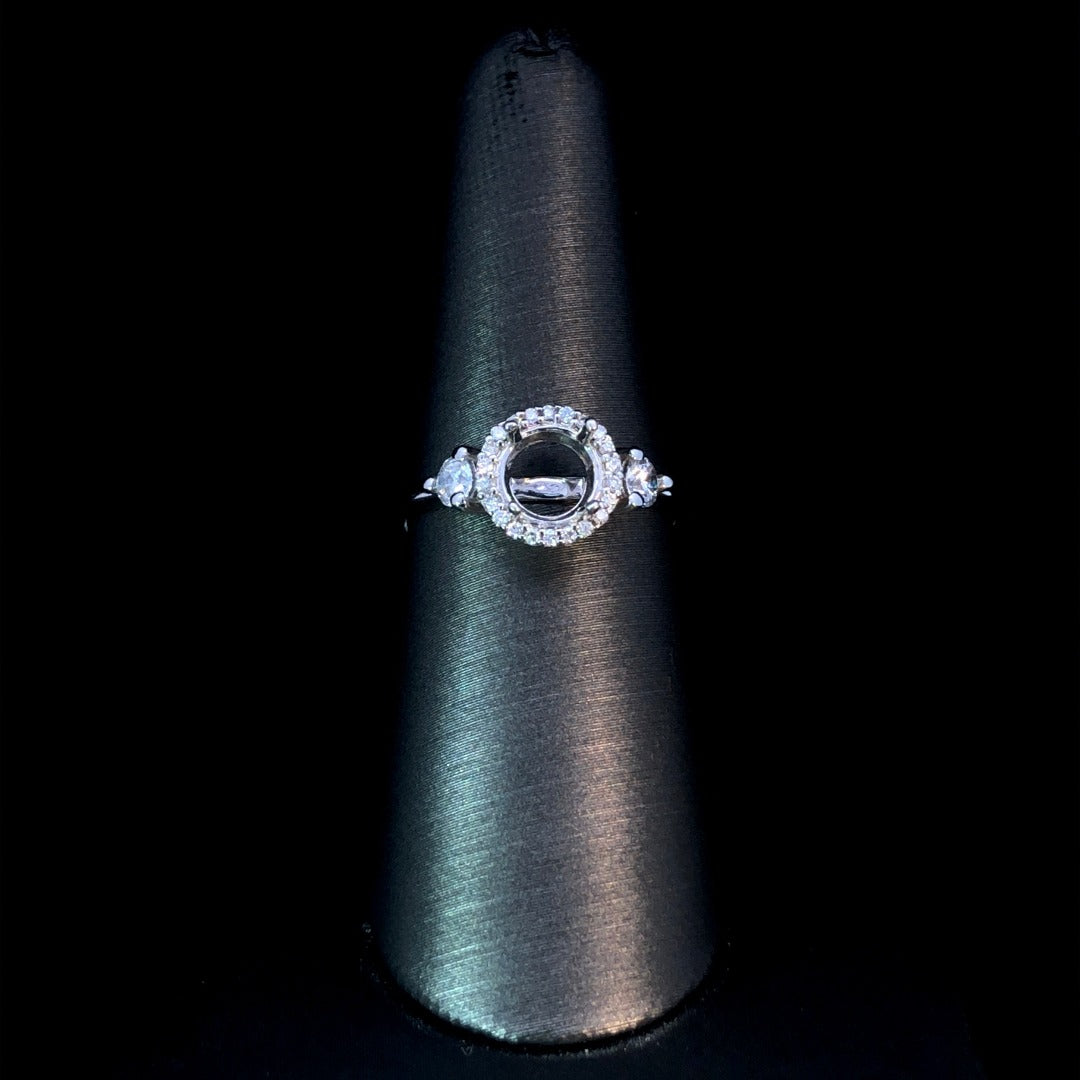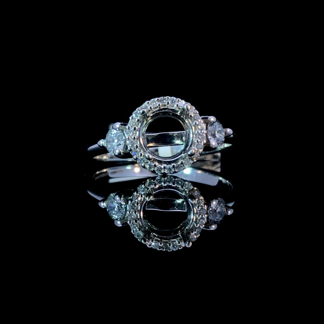 Add a touch of glamour to your jewelry collection with our beautiful diamond semi mount. Featuring a round diamond halo and 2 side diamonds, this elegant piece is set in 14kt white gold and boasts a total diamond weight of .39ctw. Choose your own round center stone from our unbeatable selection for the perfect finishing touch. Price is for the semi mount only. Center stone will be added at an additional cost. This ring is a size 7. If that size is not a perfect fit, first time sizing is free at the time of purchase. Additional sizing fees may apply.