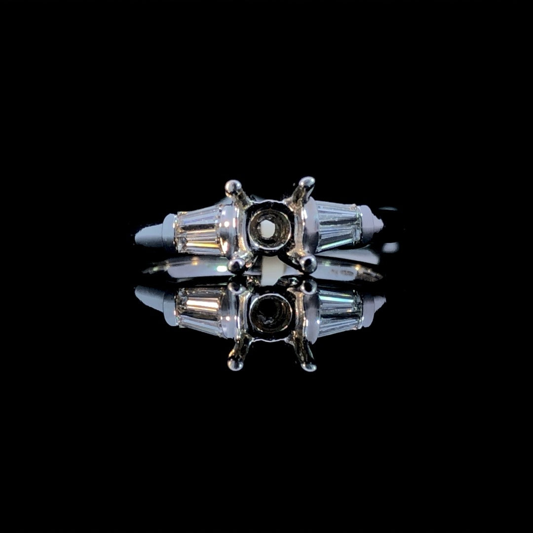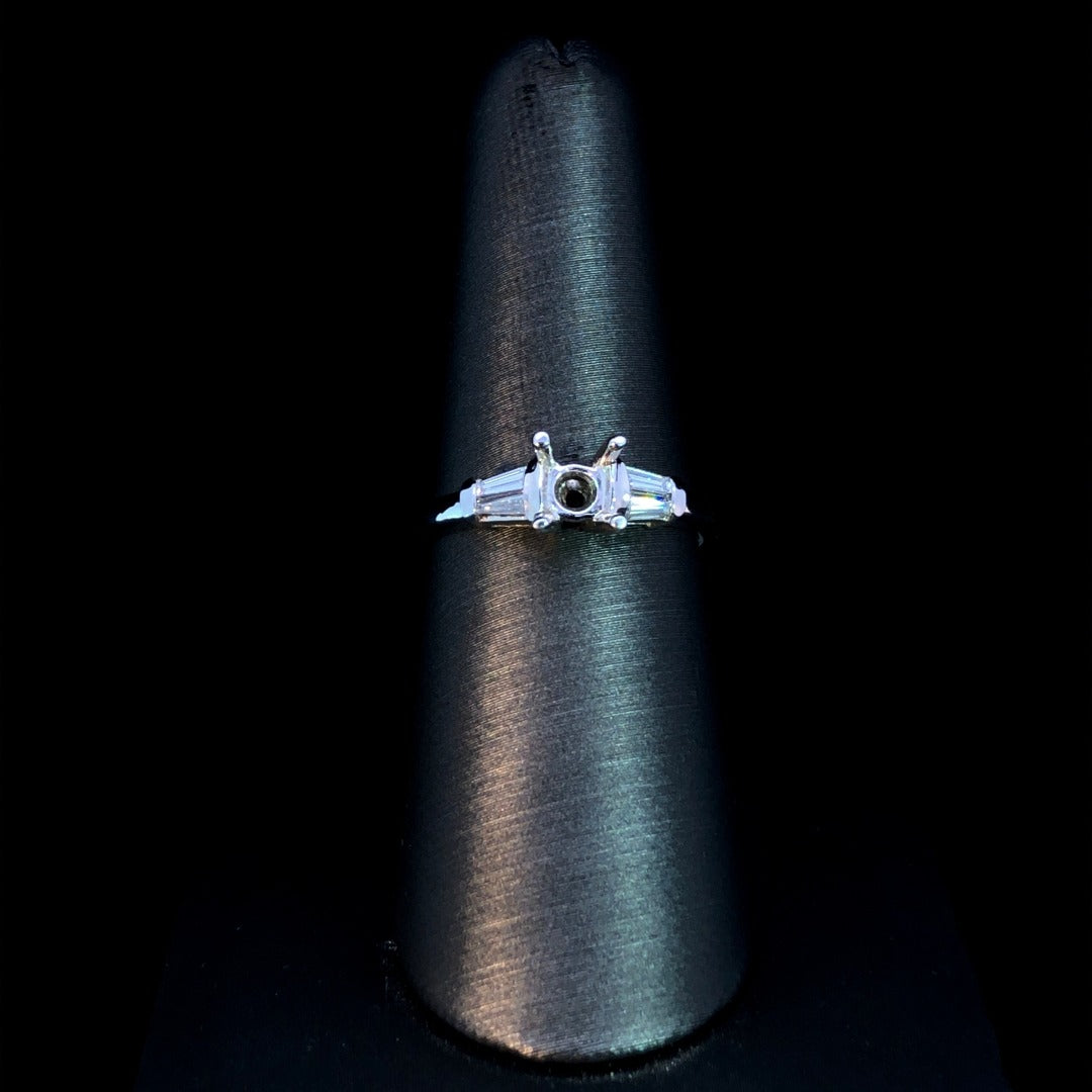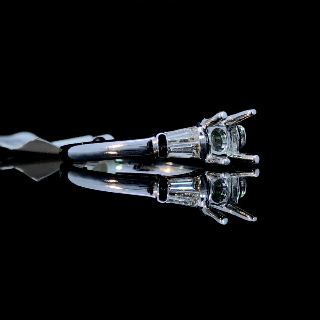 Elevate your elegance with our timeless 14 kt white gold diamond semi mount. With .22 ctw of baguette diamonds on each side of the head, this piece exudes sophistication. Choose your own center stone from our unbeatable selection of loose stones for a one-of-a-kind touch. Price is for the semi mount only. Center stone will be added at an additional cost. This ring is a size 7. If that size is not a perfect fit, first time sizing is free at the time of purchase. Additional sizing fees may apply.