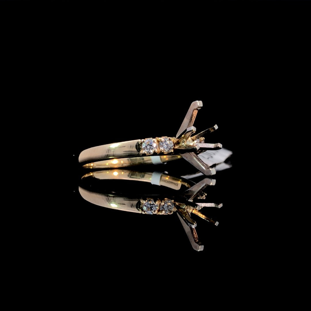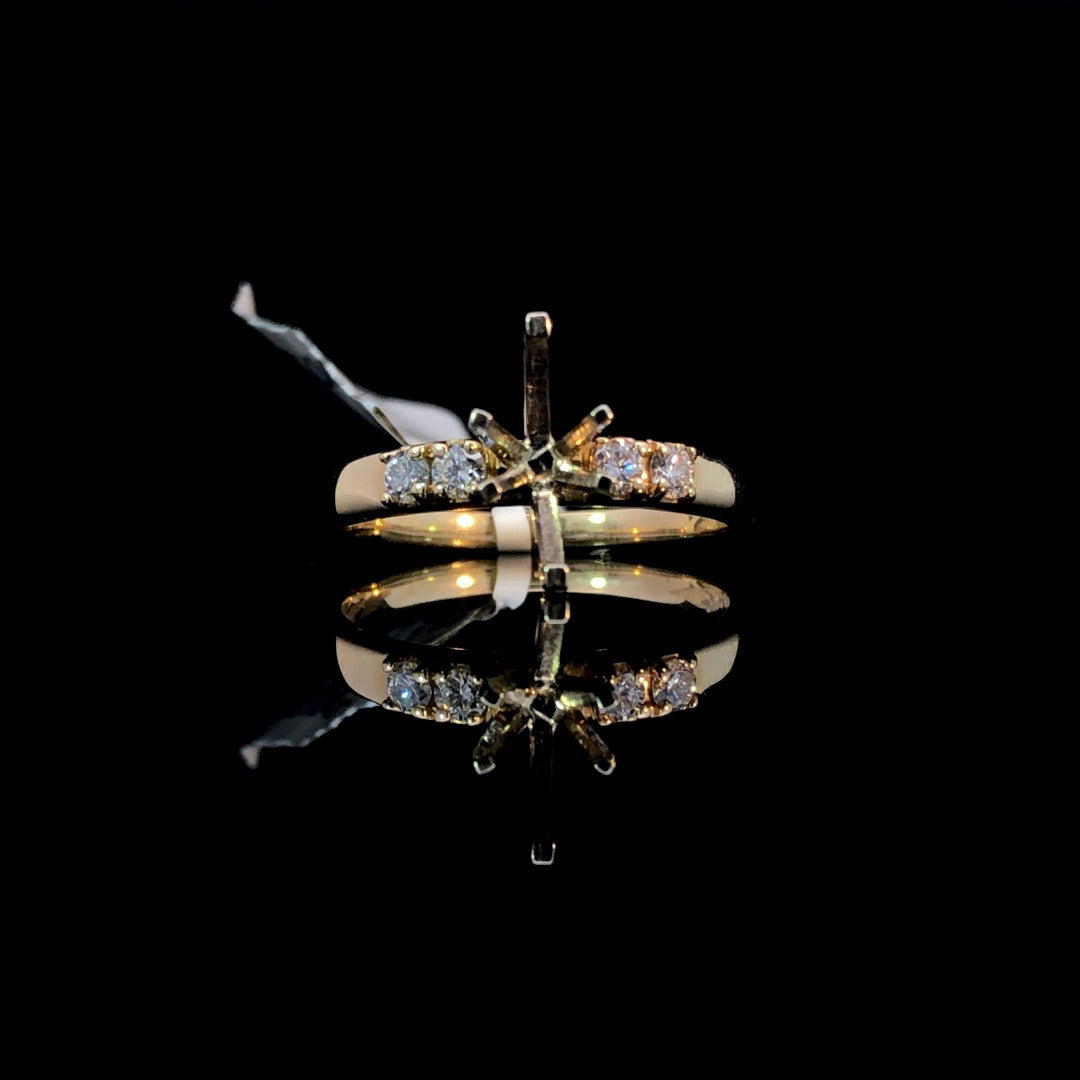 Elevate your style with our timeless semi mount, featuring .18ctw of round diamond accents in 14kt yellow gold. Choose from our vast selection of loose stones to create your perfect center piece. Classic sophistication at its finest. Price is for the semi mount only. Center stone will be added at an additional cost. This ring is a size 7. If that size is not a perfect fit, first time sizing is free at the time of purchase. Additional sizing fees may apply.