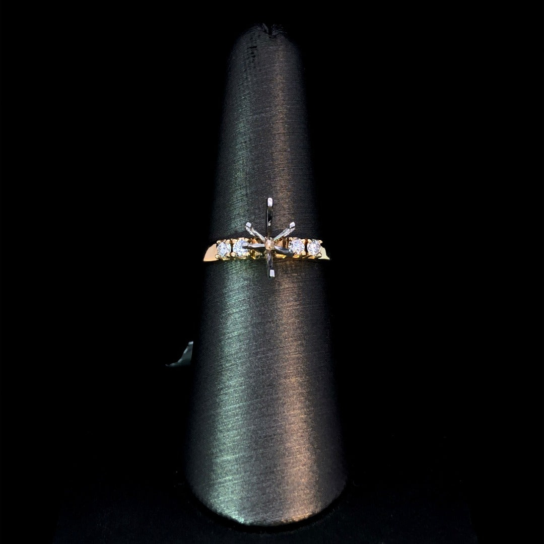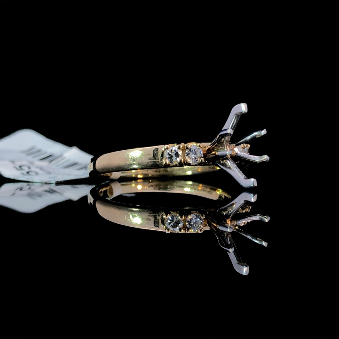 This timeless diamond semi mount sparkles with .18ctw of round diamond accents. Crafted in 14kt yellow gold, its versatile design allows you to choose a center stone that perfectly suits your style. Price is for the semi mount only. Center stone will be added at an additional cost. This ring is a size 7. If that size is not a perfect fit, first time sizing is free at the time of purchase. Additional sizing fees may apply.