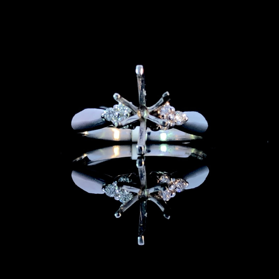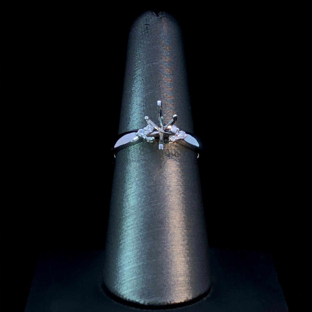 Surround your chosen center stone with classic elegance and timeless sophistication. This diamond semi mount features .09ctw of round diamonds set in 14kt white gold, crafted in the shape of a striking trillion that gracefully accentuates any center stone. A perfect choice for the luxury-seeking sophisticate. Price is for the semi mount only. Center stone will be added at an additional cost. This ring is a size 7. If that size is not a perfect fit, first time sizing is free at the time of purchase. Additional sizing fees may apply.