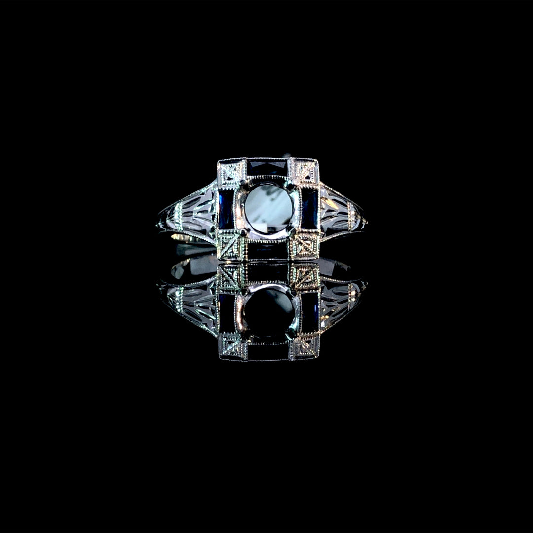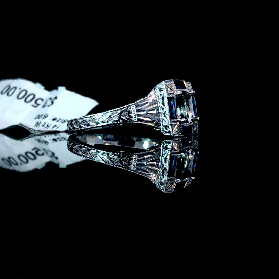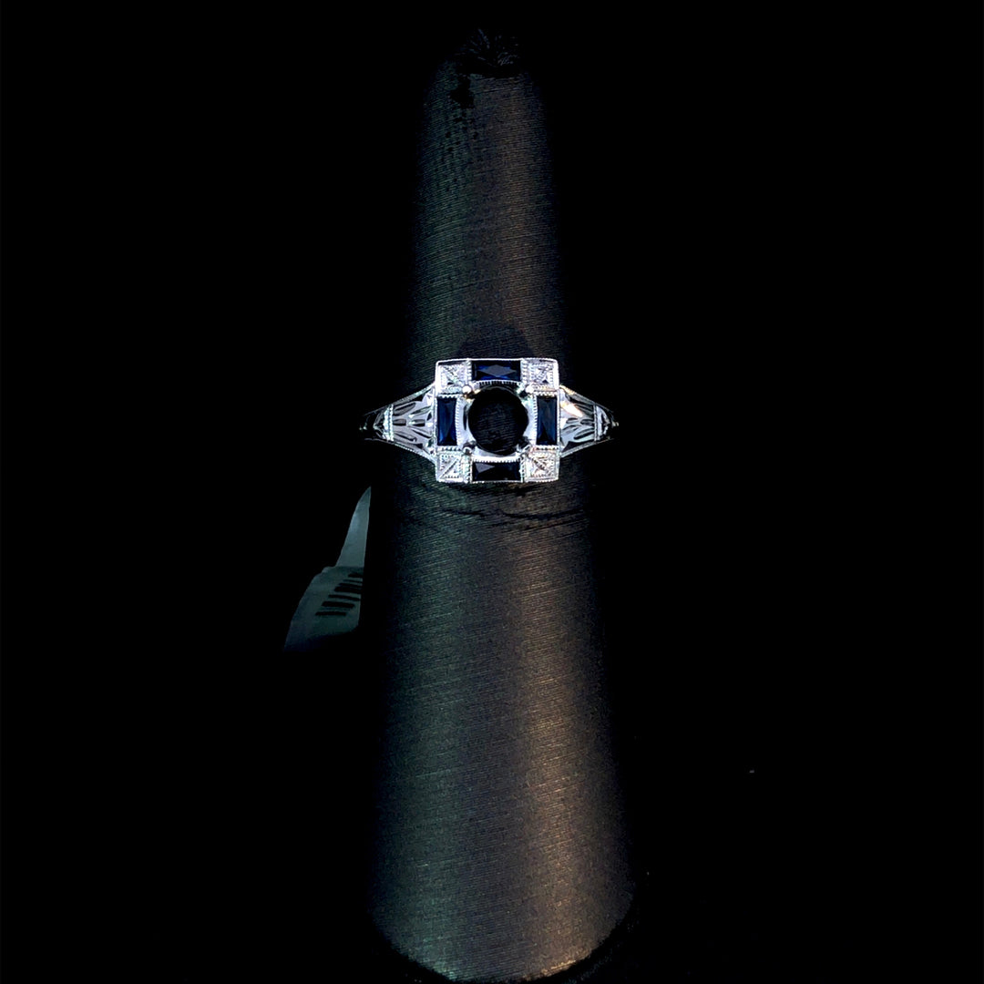 This exquisite 14kt white gold semi mount showcases a vintage-inspired design with a decorative halo featuring .25ctw of baguette sapphires. Intricate carvings add thoughtful detail to the band, enhancing its timeless appeal. Personalize this stunning piece by choosing your ideal center stone from our extensive collection of loose stones to create a truly unique and meaningful ring. Price is for the semi mount only. Center stone will be added at an additional cost. This ring is a size 6. If that size is not a perfect fit, first time sizing is free at the time of purchase. Additional sizing fees may apply.