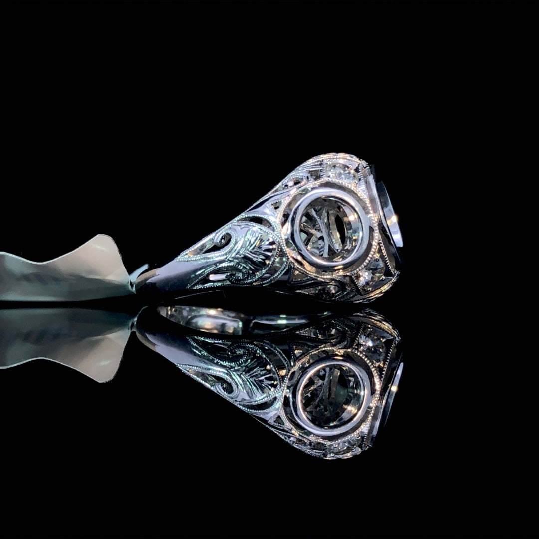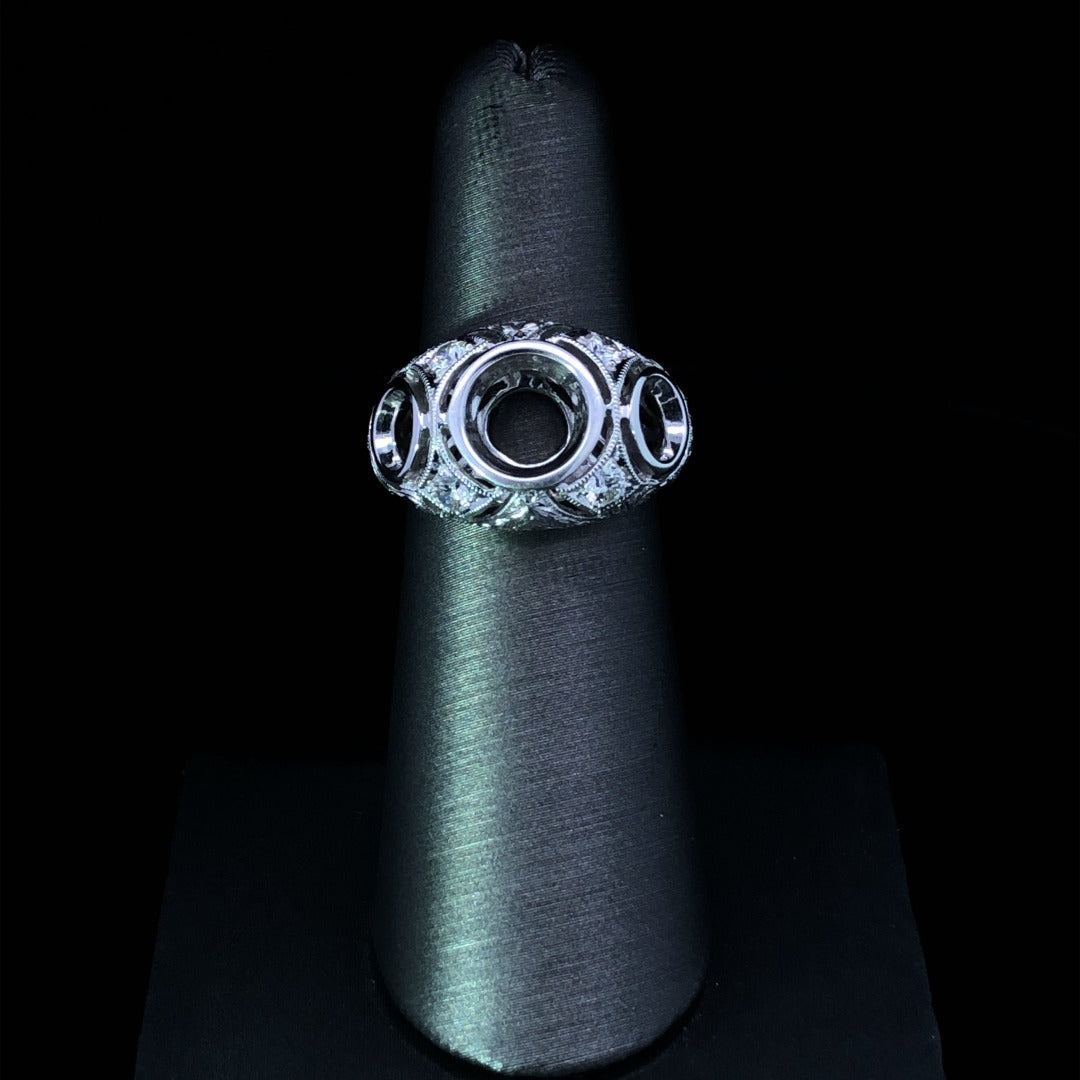 Choose your own stones for this unique 3 stone semi mount and complete your perfect look. Crafted of 14kt white gold, the design includes .37ctw of diamond accents with miligrain and filigree detailing for a truly exquisite piece. Have a one-of-a-kind look that's just as special as you are. Price is for the semi mount only. Stones will be added at an additional cost. We have a large selection of loose diamonds and gemstones, and can advise you on the options that would fit this mounting best. This ring is a size 6. If that size is not a perfect fit, first time sizing is free at the time of purchase.