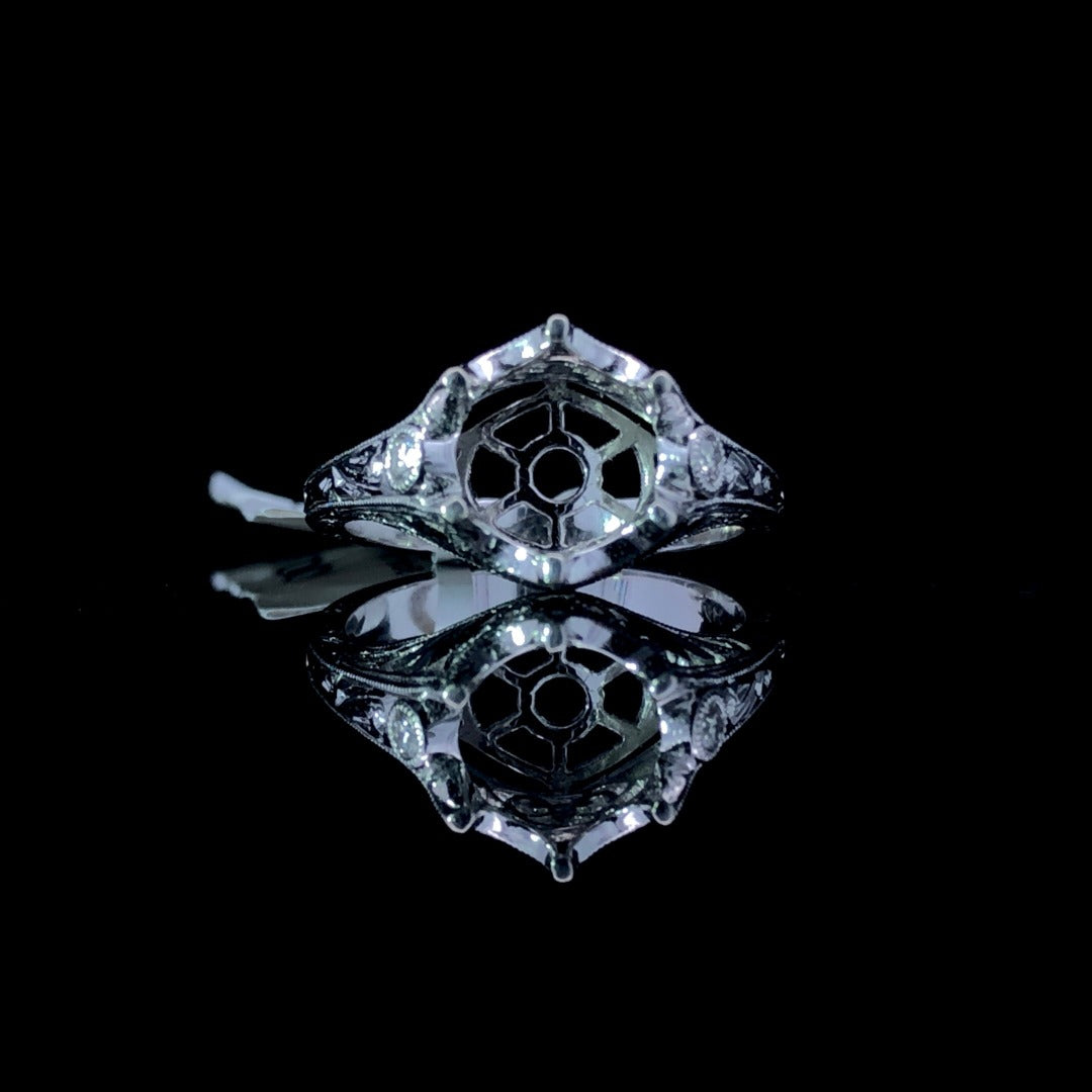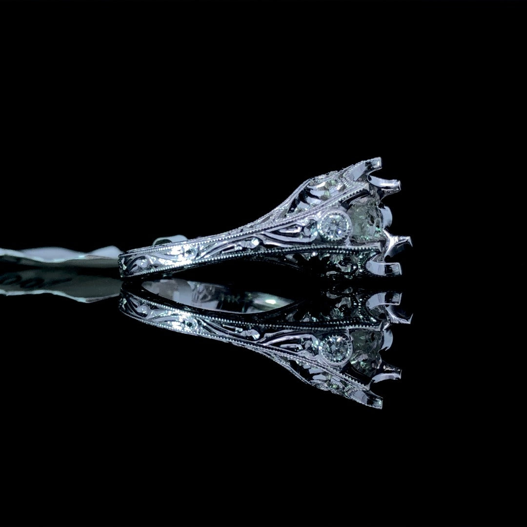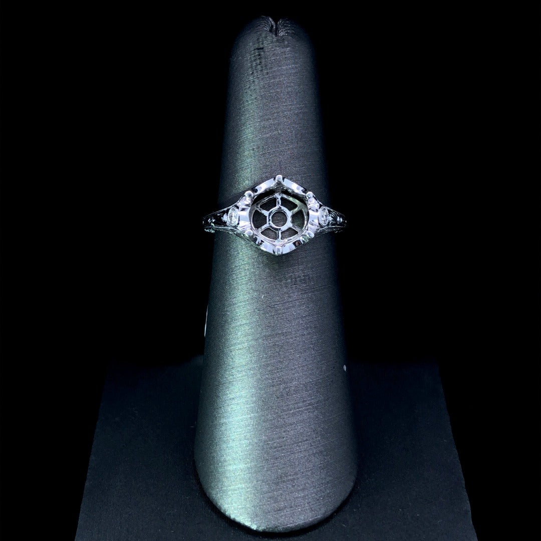 Create a regal look with our stunning diamond semi mount. Crafted with attention to detail, the 14kt white gold semi mount features a round crown-shaped head, adorned with .08ctw of round accent diamonds. Add your desired round center stone to make this piece truly one-of-a-kind. Elevate your jewelry collection today! Price is for the semi mount only. Center stone will be added at an additional cost. This ring is a size 7. If that size is not a perfect fit, first time sizing is free at the time of purchase. Additional sizing fees may apply.