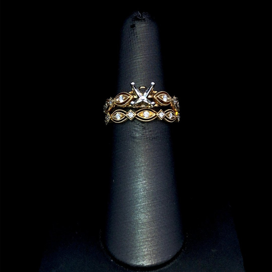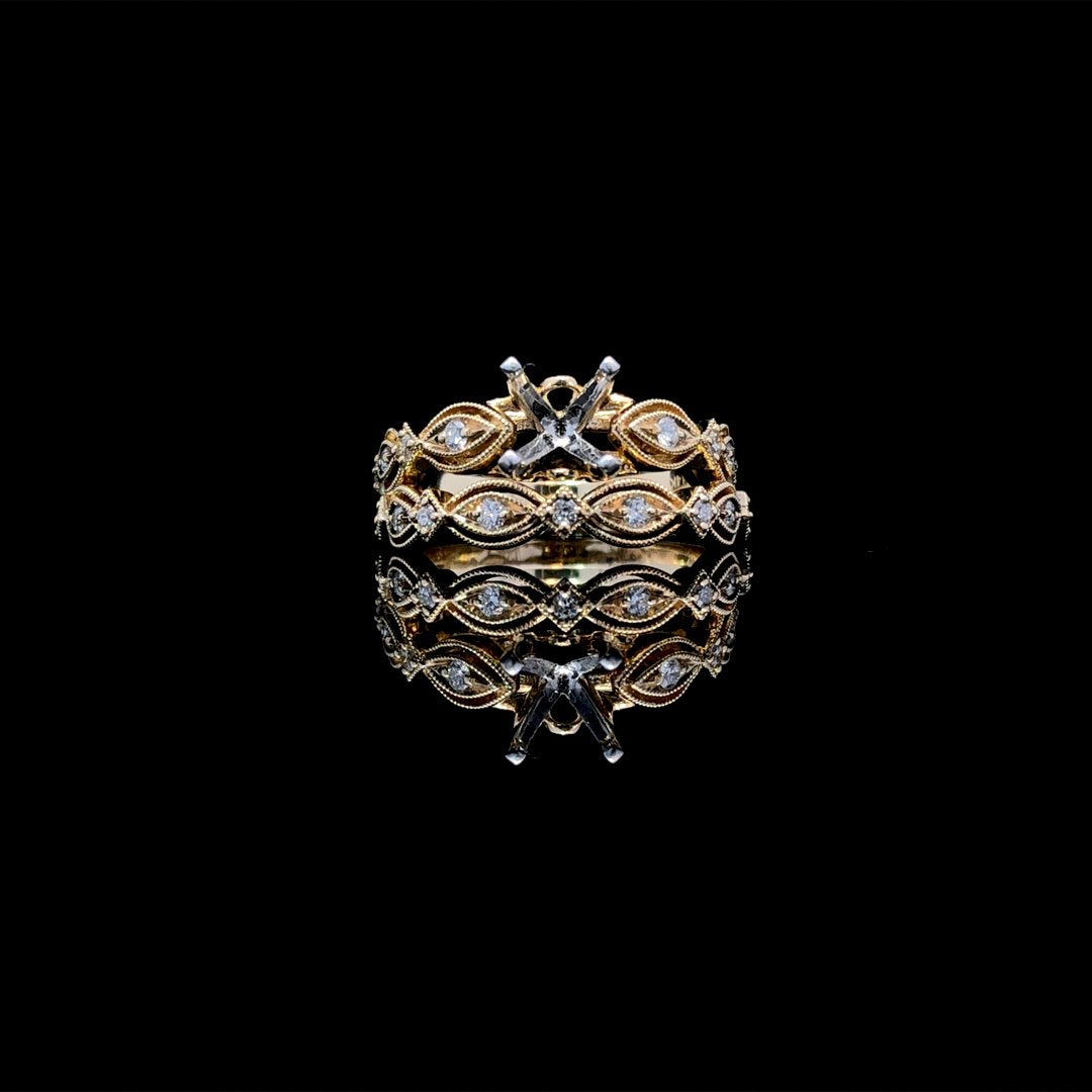 Create a stunning and unique piece of jewelry with this 14kt yellow gold diamond semi mount. The intricate filigree and milgrain design, along with .15ctw of sparkling round diamonds, will add a touch of elegance to any center stone of your choice. Choose from our wide selection of loose stones to complete this gorgeous piece. Pair it with the matching band (sold separately) for a stunning bridal set. Price is for the semi mount only. Center stone will be added at an additional cost. This ring is a size 6. If that size is not a perfect fit, first time sizing is free at the time of purchase. Additional sizing fees may apply.