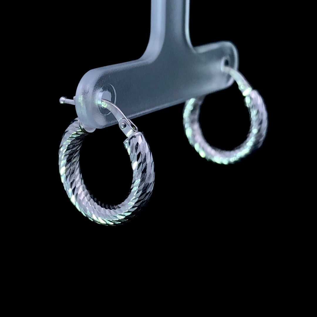 This elegant hoop earring is crafted from 14kt white gold, featuring a small, twisted design for added visual interest. Perfect for everyday wear or formal occasions, this timeless piece will add the perfect touch of sophistication.