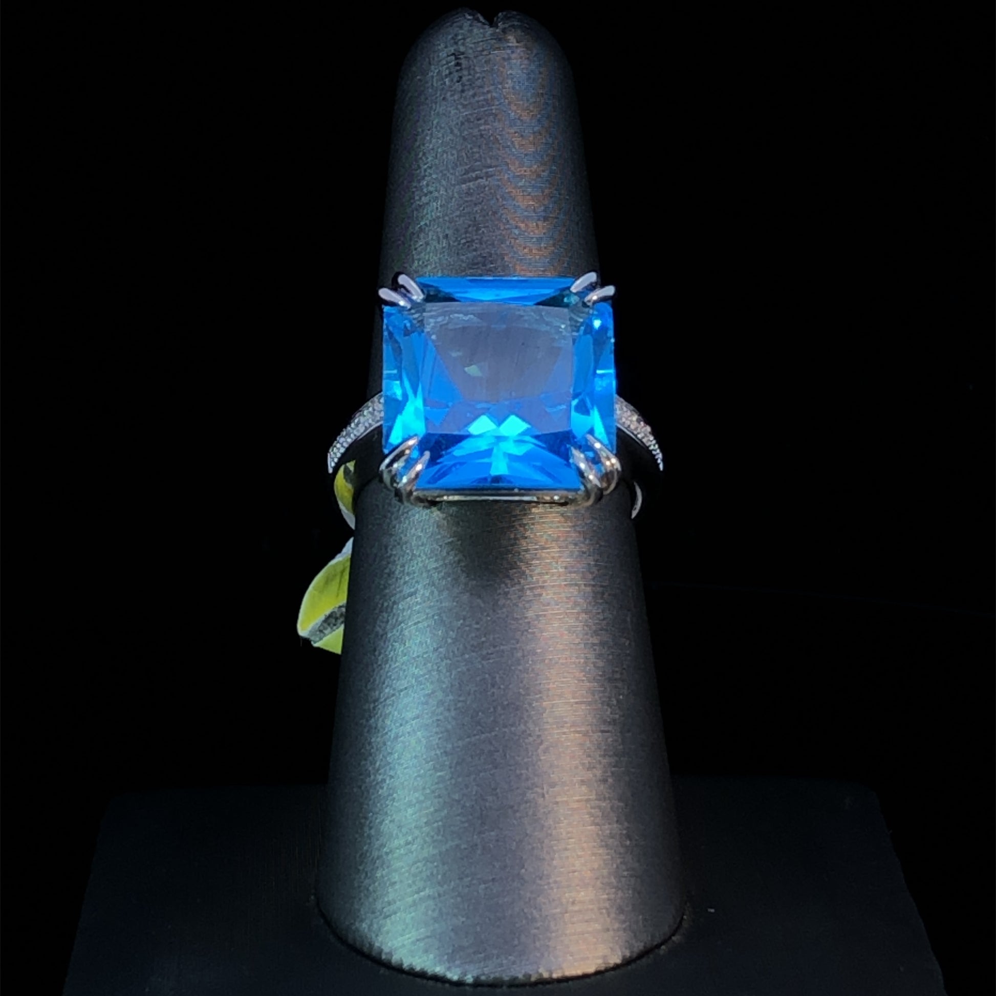 This beautiful 12.83 ctw blue topaz and diamond ring is a stunning piece that sparkles with brilliance and craftsmanship. The 12.78 ct princess cut blue topaz set in a 14 kt white gold mounting is sure to turn heads and last you a lifetime. Accentuated with .05 ctw of diamonds, this ring is truly a timeless classic. This ring is a size 7.25. If that size is not a perfect fit, first time sizing is free at the time of purchase. Additional sizing fees may apply.