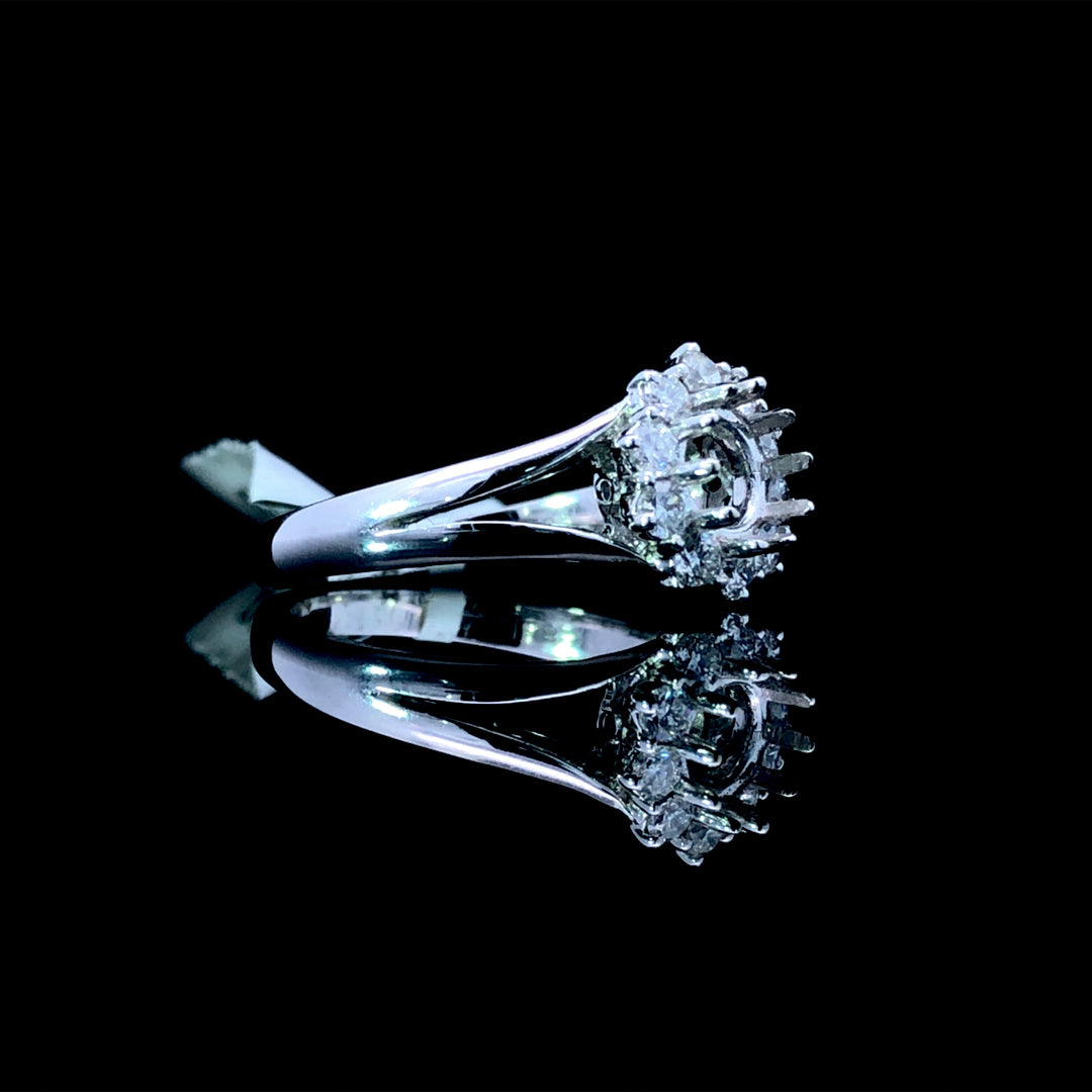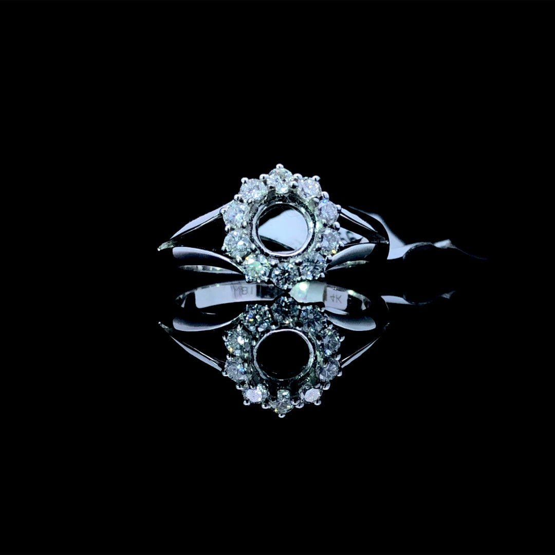 Create a one-of-a-kind engagement ring with this timeless semi mount. Featuring a radiant round halo adorned with .41ctw of brilliant round diamonds, the 14kt white gold split shank band provides an elegant foundation for your selected center stone. Explore our curated selection of premium loose diamonds and gemstones to discover the perfect stone to complete a piece that is truly yours. Price is for the semi mount only. Center stone will be added at an additional cost. This ring is a size 6.5. If that size is not a perfect fit, first time sizing is free at the time of purchase. Additional sizing fees may apply.