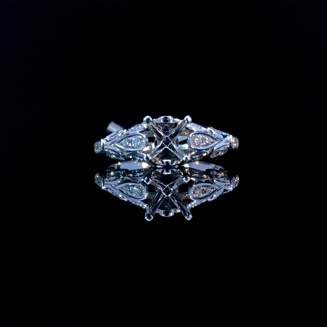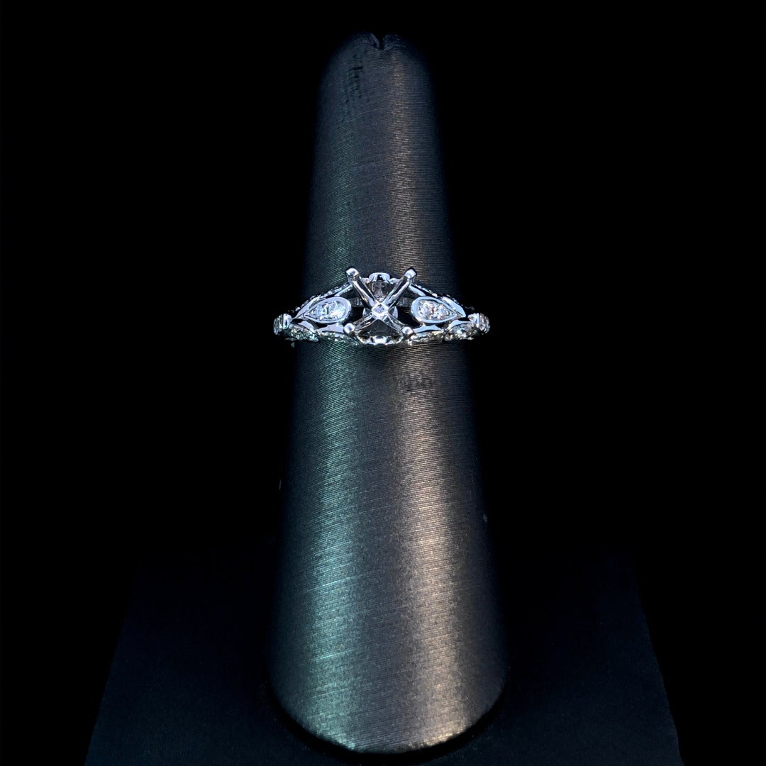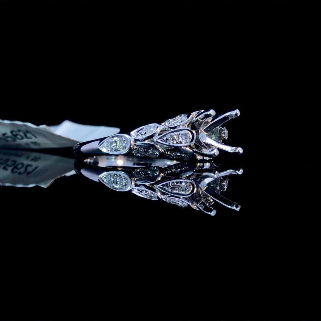 Elevate your style with our stunning diamond semi mount! Designed with .40ctw of round diamonds in a detailed setting of 14kt white gold, this piece is sure to catch everyone's eye. Choose your dream center stone from our wide selection of loose stones to complete the look. Price is for the semi mount only. Center stone will be added at an additional cost. This ring is a size 6.25. If that size is not a perfect fit, first time sizing is free at the time of purchase. Additional sizing fees may apply.