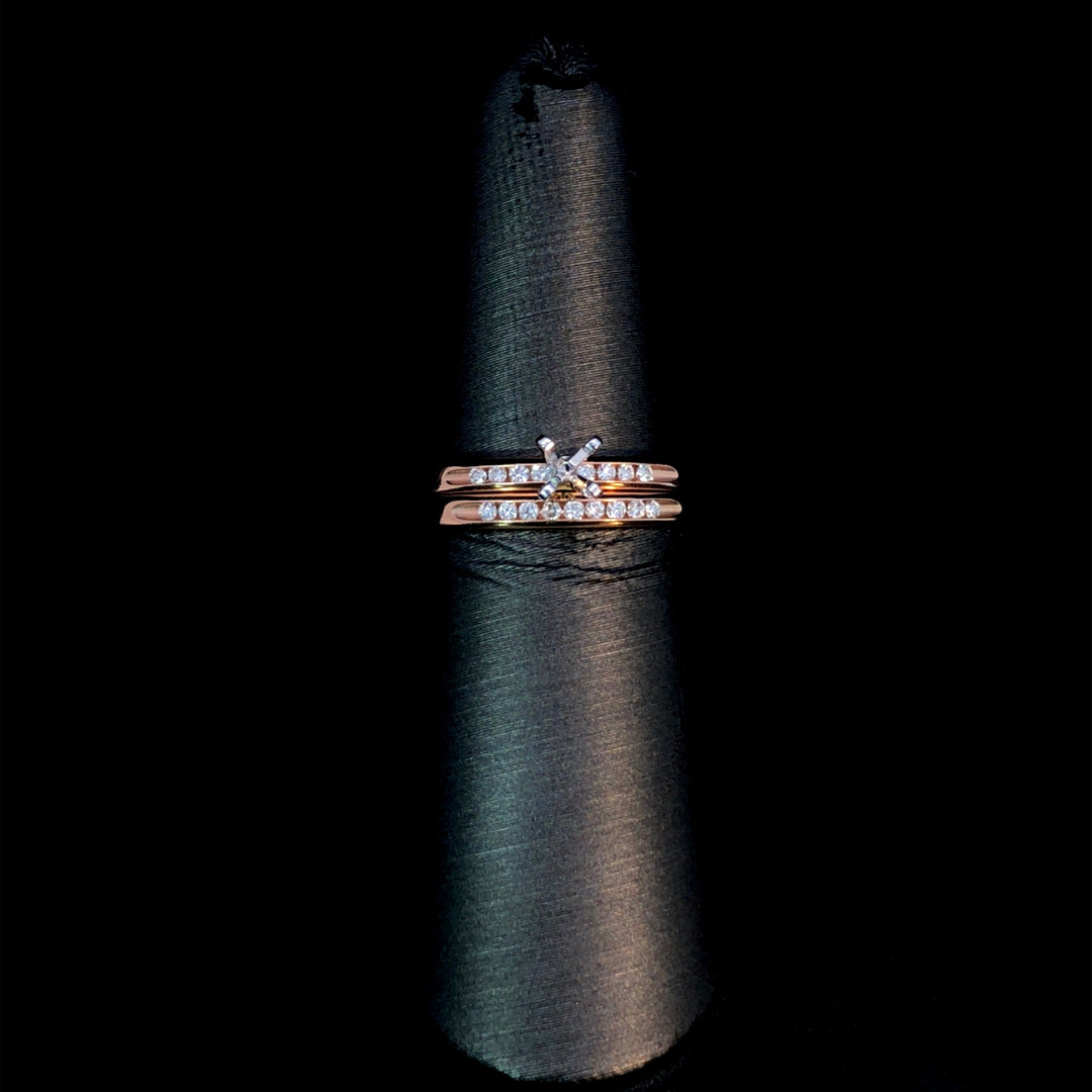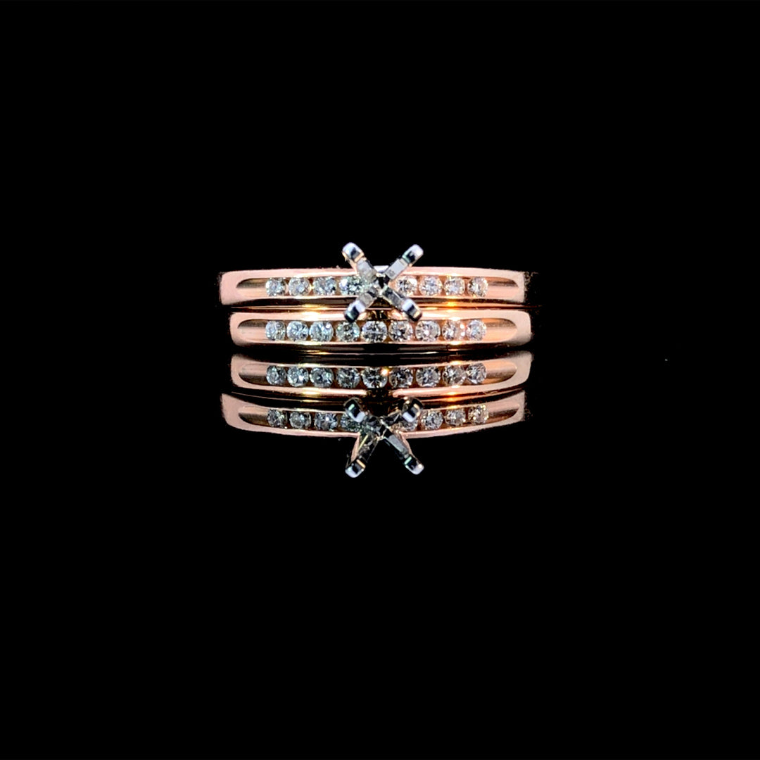 This elegant 14kt rose gold bridal set includes a diamond semi mount featuring channel-set diamonds along the band, paired with a matching diamond wedding band. Together, they showcase 0.20ctw of round diamonds, designed to beautifully highlight your chosen center stone from our collection. This set offers timeless sparkle and a supportive foundation for your special moment. Price is for the semi mount only. Center stone will be added at an additional cost. This ring is a size 6.5. If that size is not a perfect fit, first time sizing is free at the time of purchase. Additional sizing fees may apply.