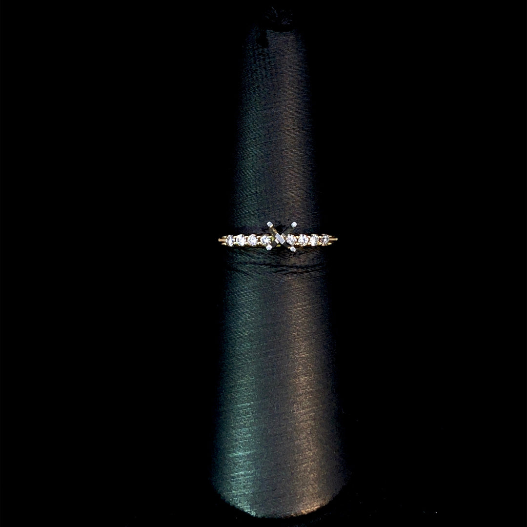 This classic diamond semi mount, crafted in 14kt yellow gold, features a timeless design accented with .15ctw of round diamonds. It beautifully complements your selected center stone from our collection, providing a supportive and elegant setting to showcase your unique jewelry vision. Price is for the semi mount only. Center stone will be added at an additional cost. This ring is a size 6.5. If that size is not a perfect fit, it can be sized up 2 sizes for free at the time of purchase. Additional sizing fees may apply.