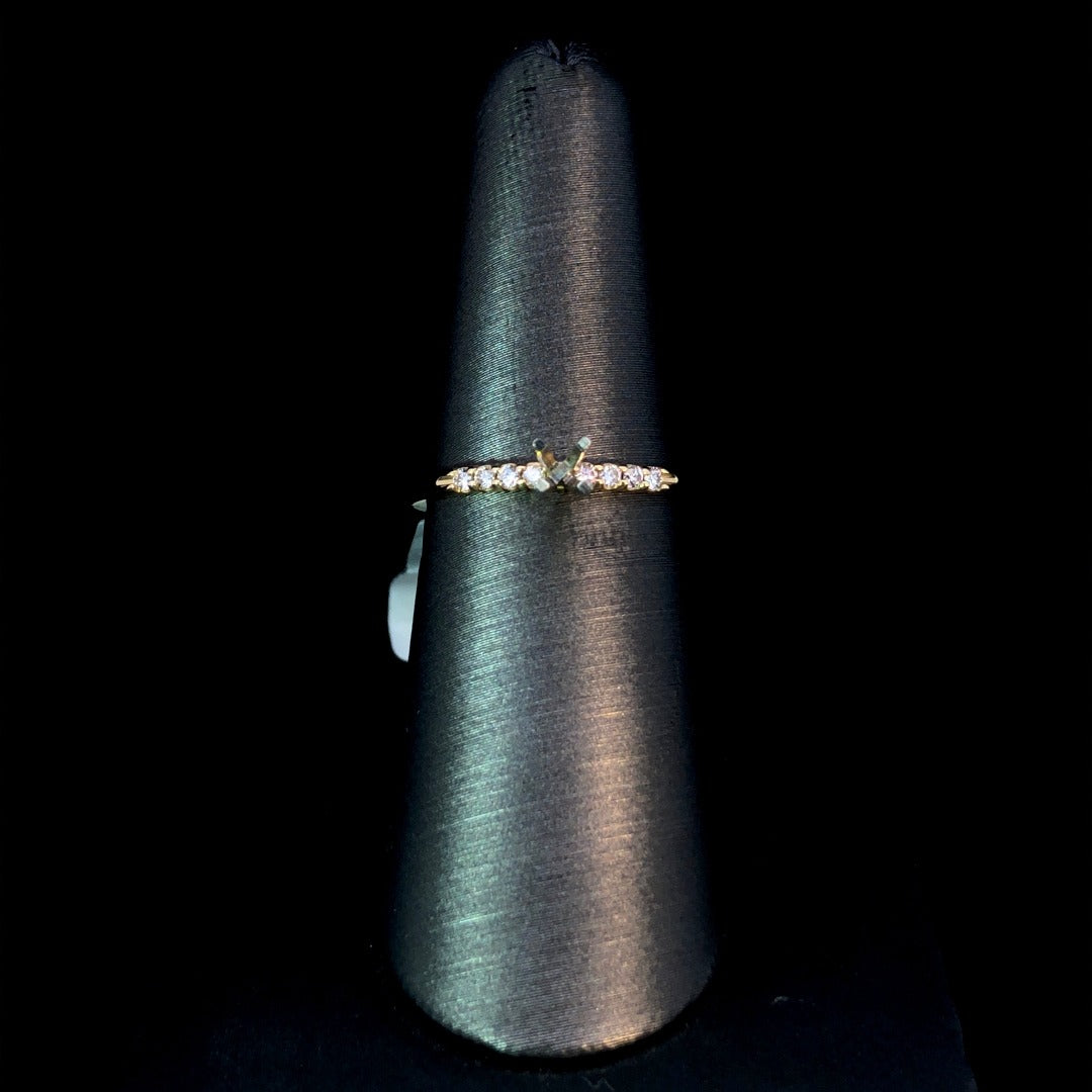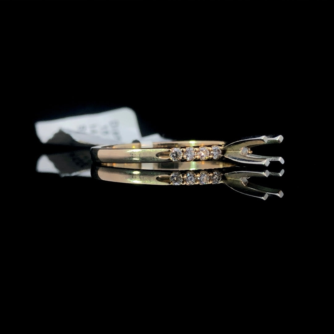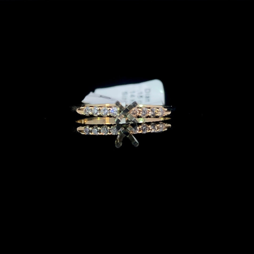Indulge in elegance with this beautifully simple diamond semi mount. The delicate 14kt yellow gold band is adorned with .15ctw of round diamonds, adding a touch of modern luxury. Choose from our vast selection of center stones to complete this classic and sophisticated piece. Price is for the semi mount only. Center stone will be added at an additional cost. This ring is a size 6.75. If that size is not a perfect fit, firs time sizing is free at the time of purchase. Additional sizing fees may apply.