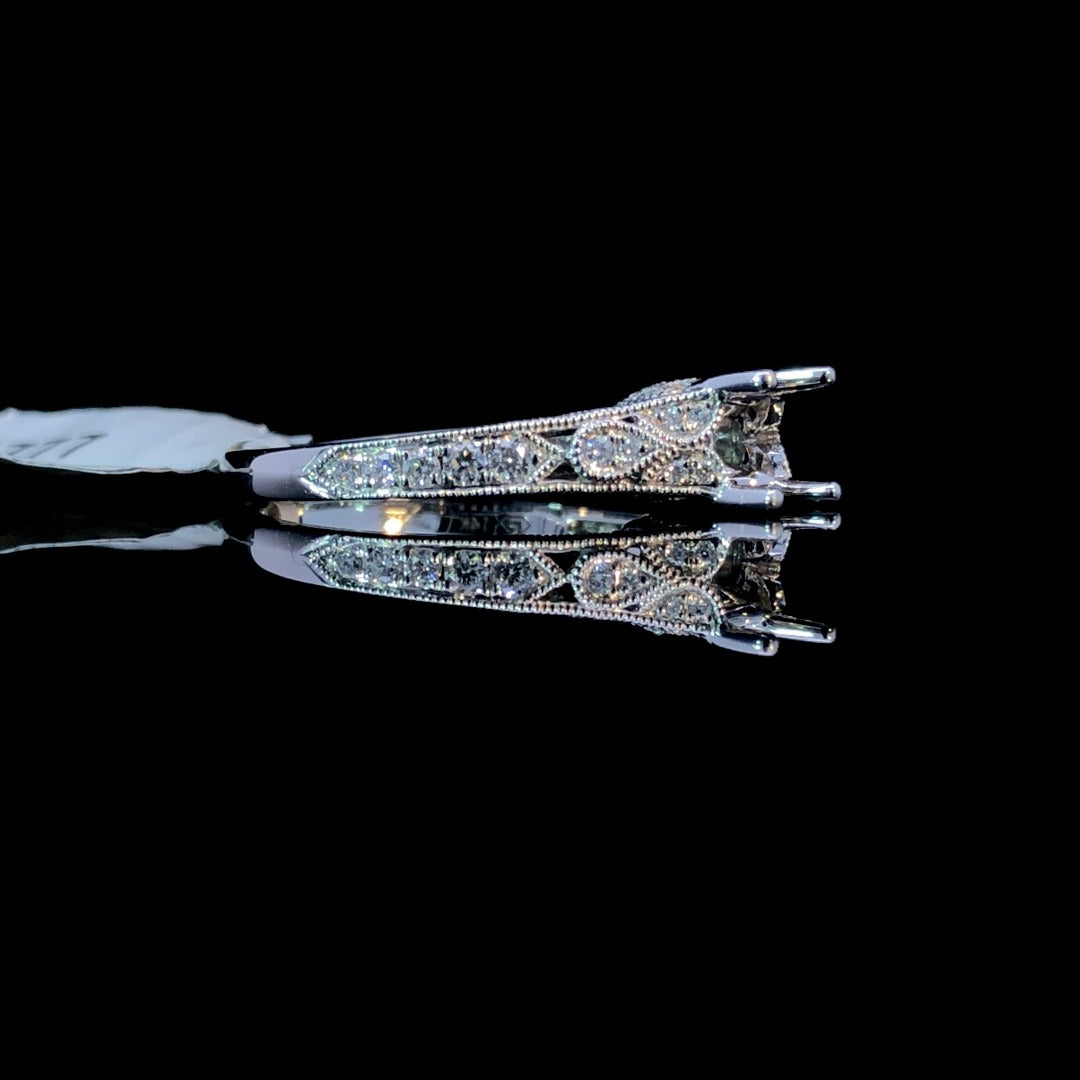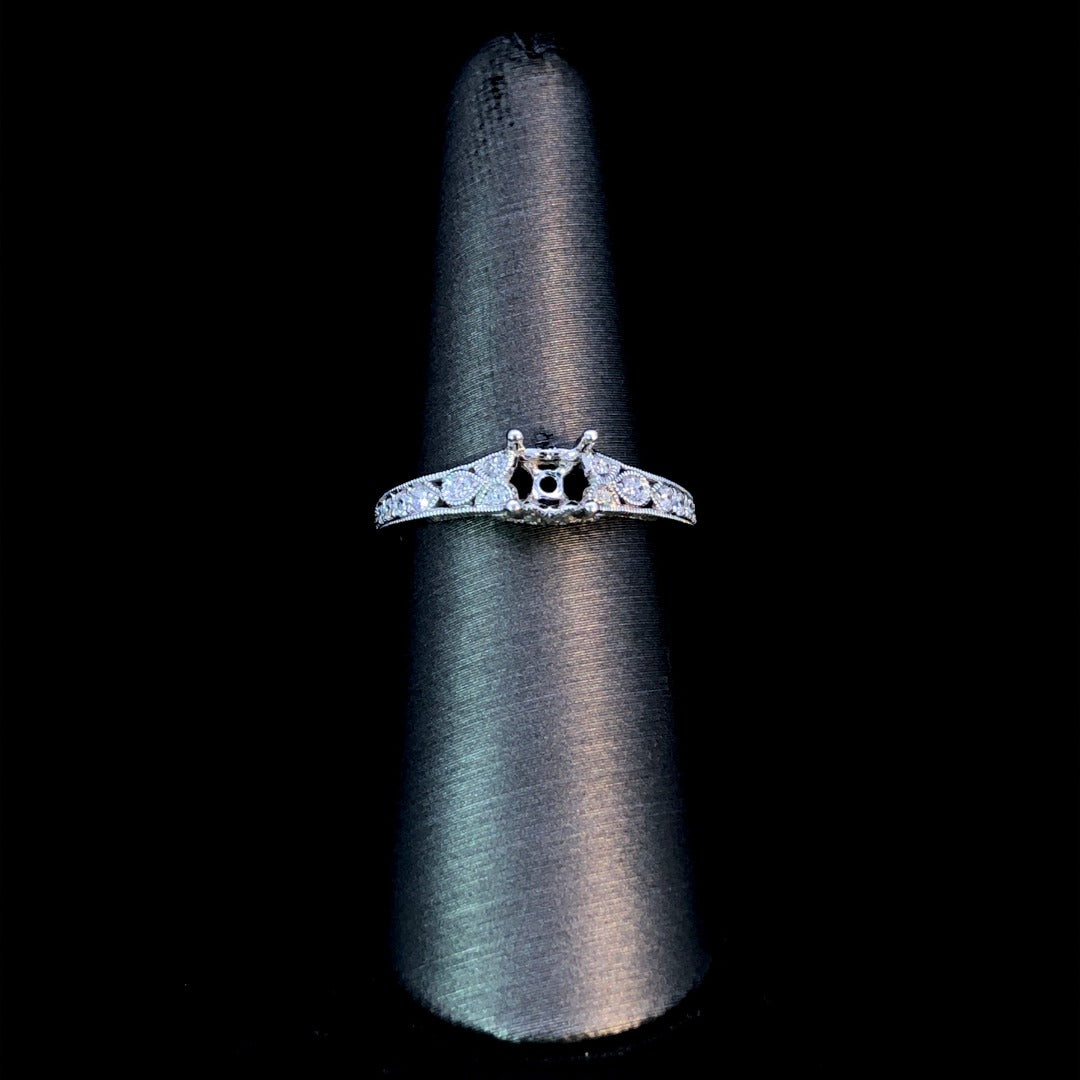 Indulge in exquisite elegance with our beautiful diamond semi mount. In 14kt white gold, this vintage-inspired design boasts .23ctw of round diamonds for added sparkle. Choose from our wide selection of center stones to complete this stunning and unique ring. Price is for the semi mount only. Center stone will be added at an additional cost. This ring is a size 7. If that size is not a perfect fit, first time sizing is free at the time of purchase. Additional sizing fees may apply.