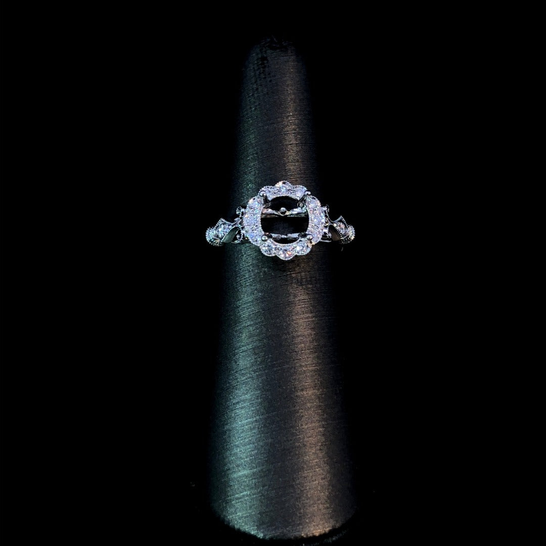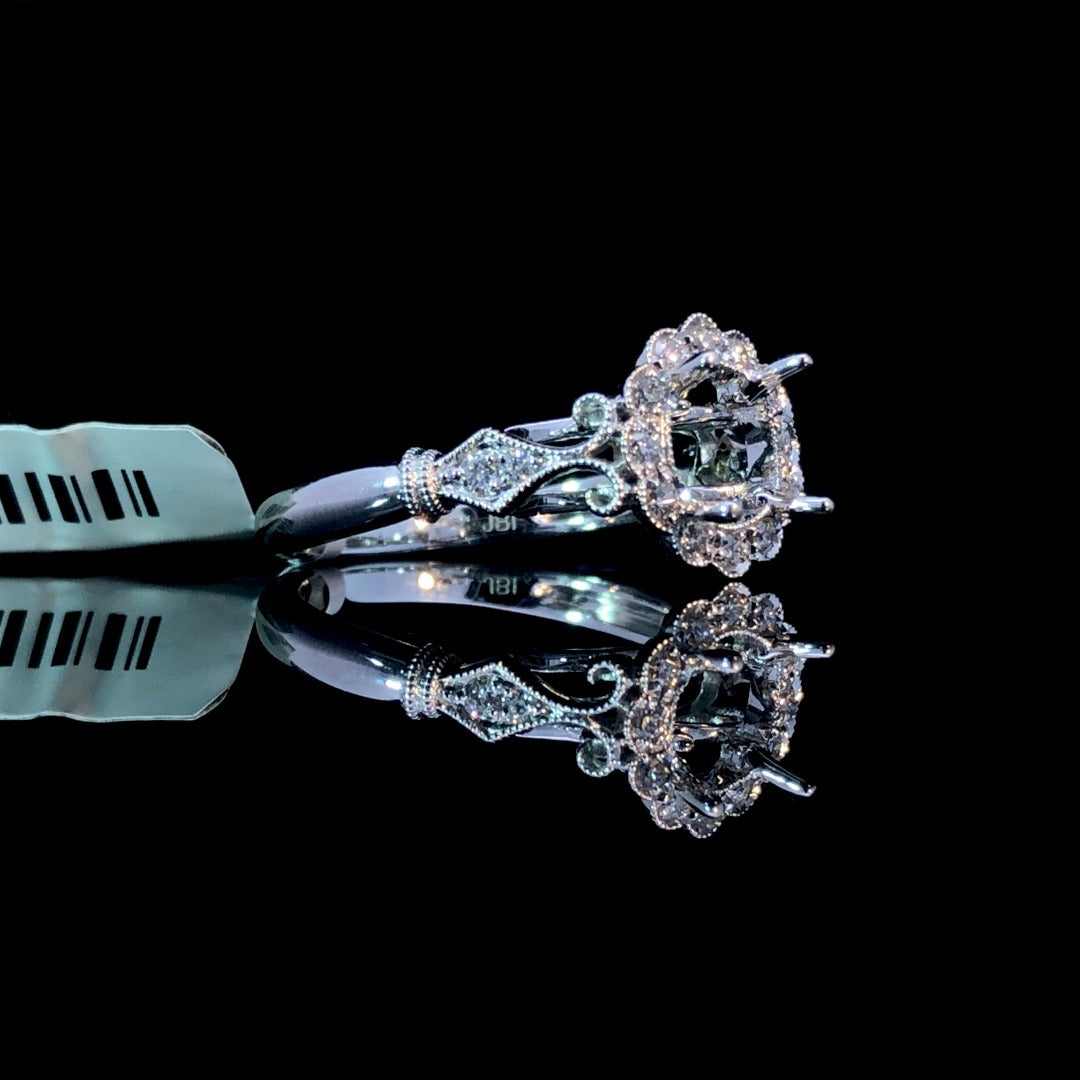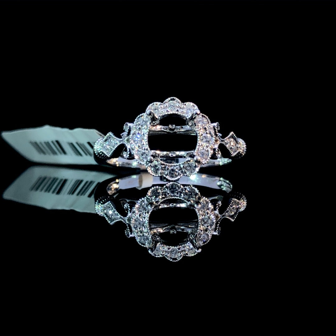 Indulge in luxury with our stunning diamond semi mount. Featuring a highly detailed halo design and intricate side decorations, this 14kt white gold piece exudes elegance and sophistication. With .20ctw of diamond accents and milgrain detailing, complete this masterpiece with your choice of stone from our unbeatable collection. Price is for the semi mount only. Center stone will be added at an additional cost. This ring is a size 6. If that size is not a perfect fit, first time sizing is free at the time of purchase. Additional sizing fees may apply.