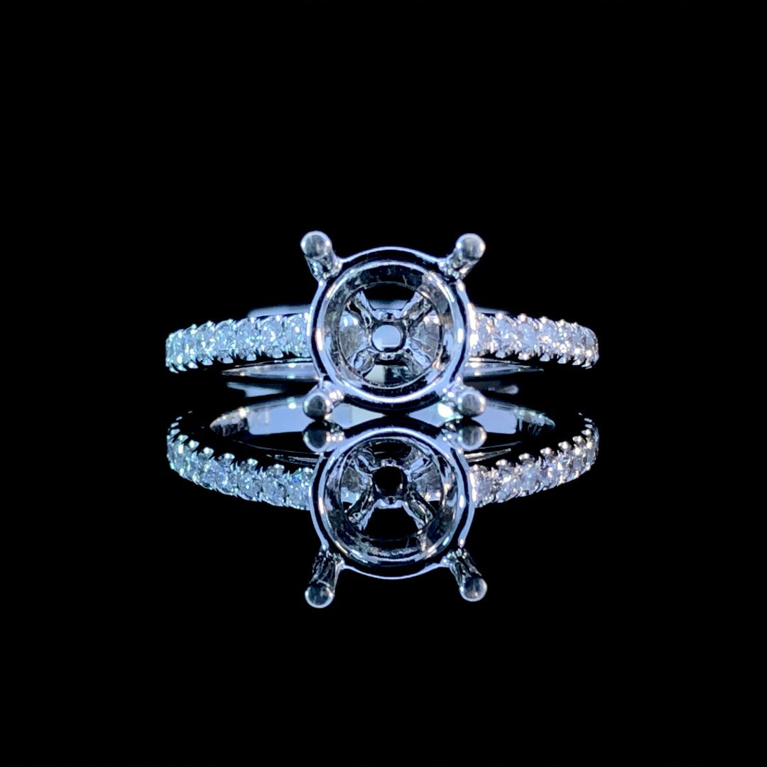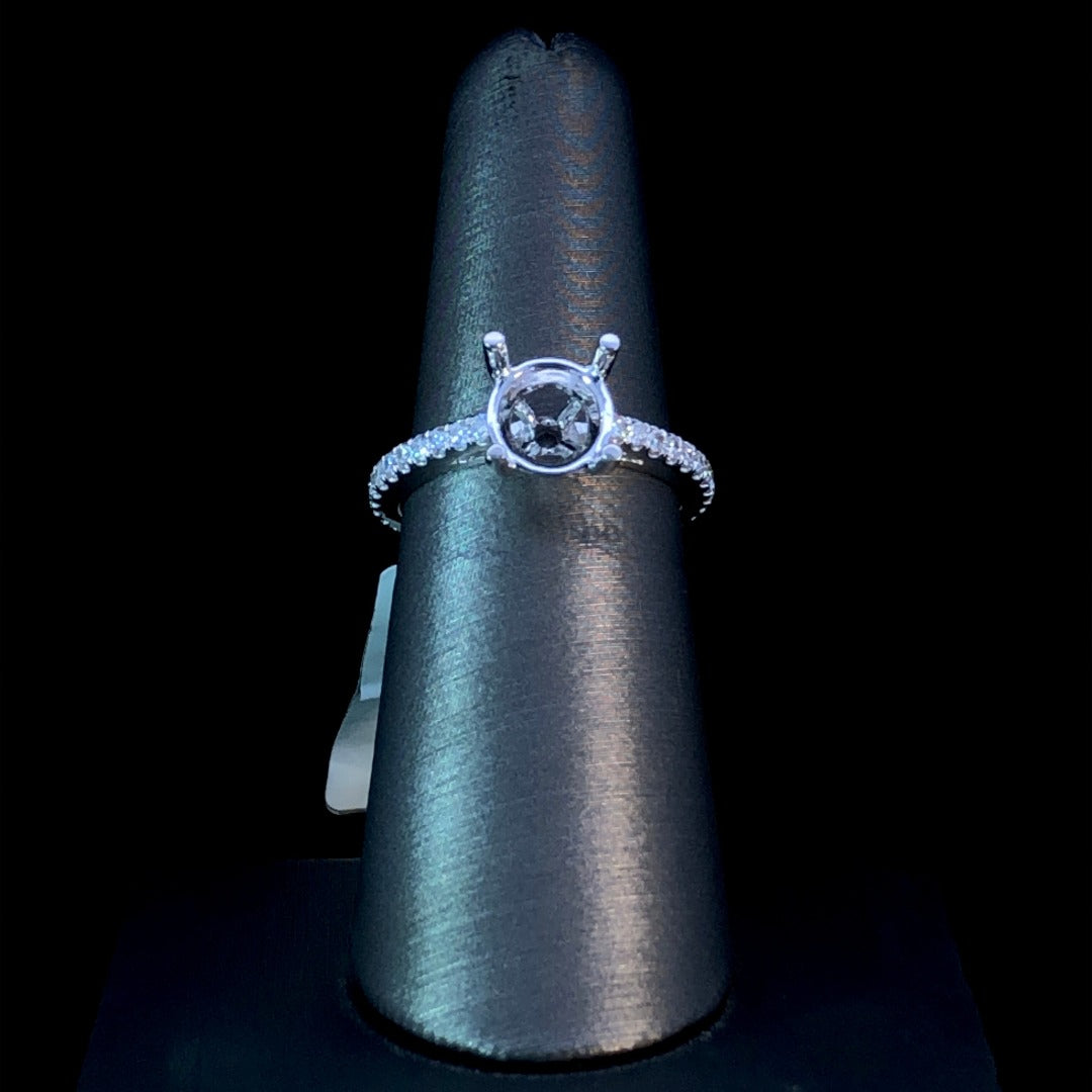 A perfect blend of classic and modern, this 14kt white gold semi mount is a stunning symbol of timeless elegance. Showcasing .43ctw of brilliant round diamonds along a graceful cathedral-style band, it is a stunning choice for a round center stone. An exquisite addition to any jewelry collection. Price is for the semi mount only. Center stone will be added at an additional cost. This ring is a size 6.5. If that size is not a perfect fit, first time sizing is free at the time of purchase. Additional sizing fees may apply.