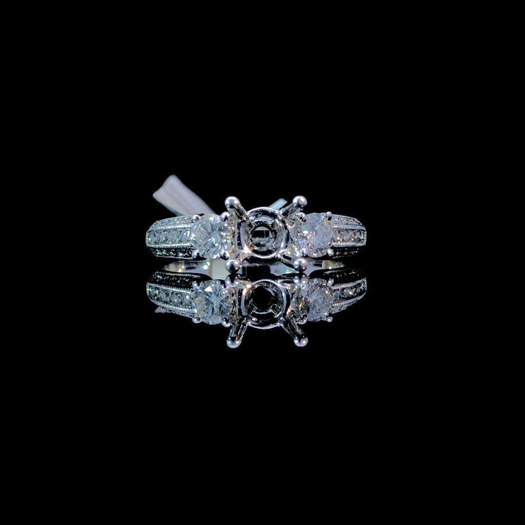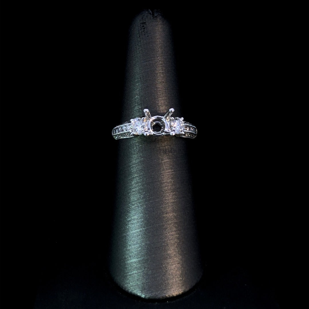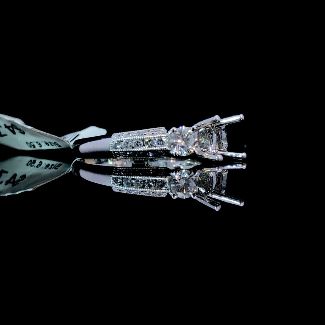 Create the perfect engagement ring with our dazzling semi mount! Crafted with .59ctw accent diamonds and delicate milgrain detailing, this 14kt white gold setting is simply stunning. Personalize it with a center stone from our wide selection and make a lasting impression. Love begins here! Price is for the semi mount only. Center stone will be added at an additional cost. This ring is a size 6.5. If that size is not a perfect fit, first time sizing is free at the time of purchase. Additional sizing fees may apply.