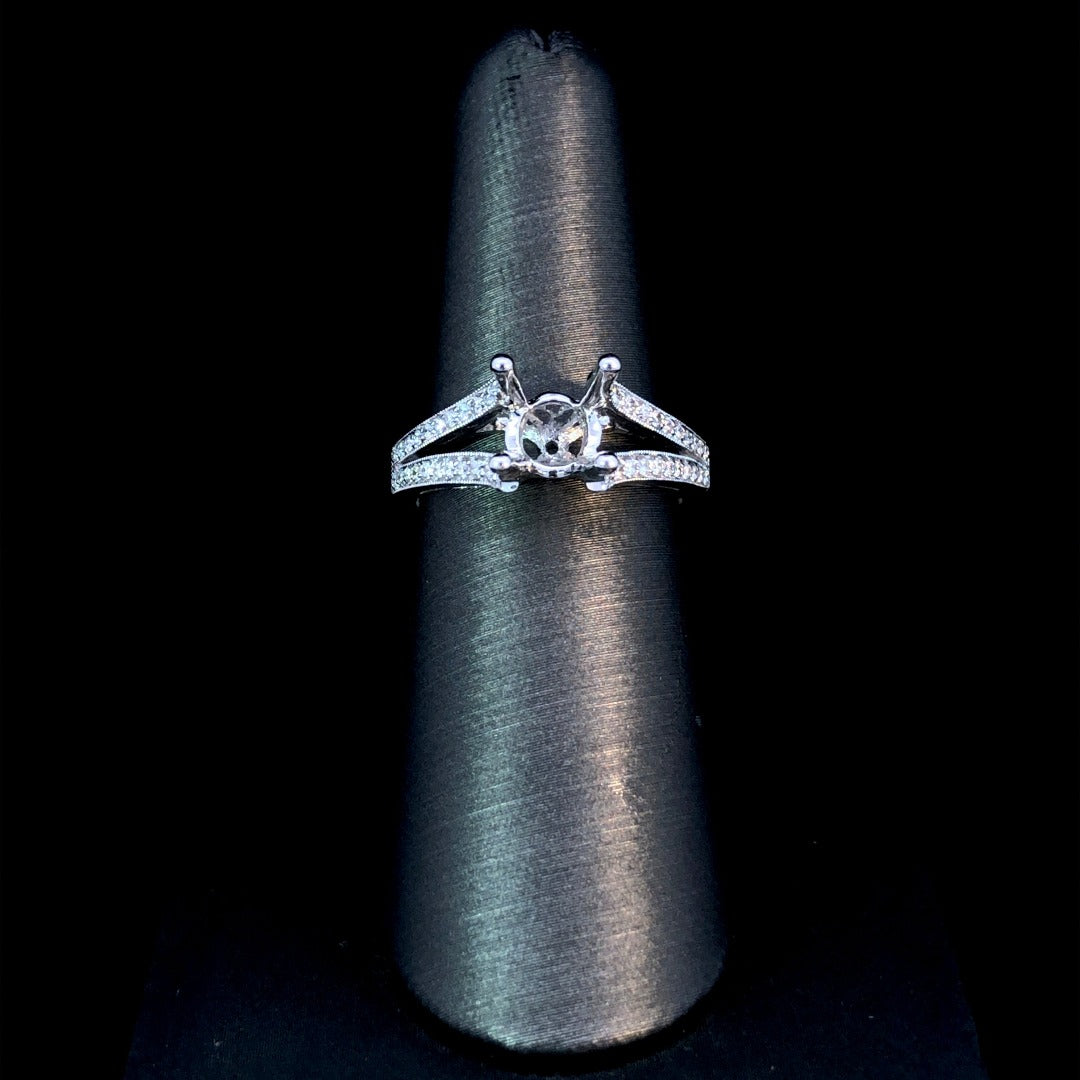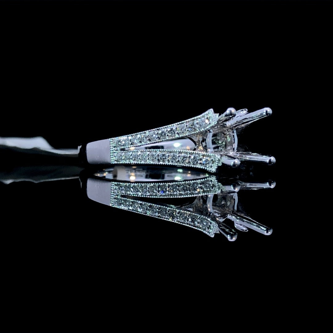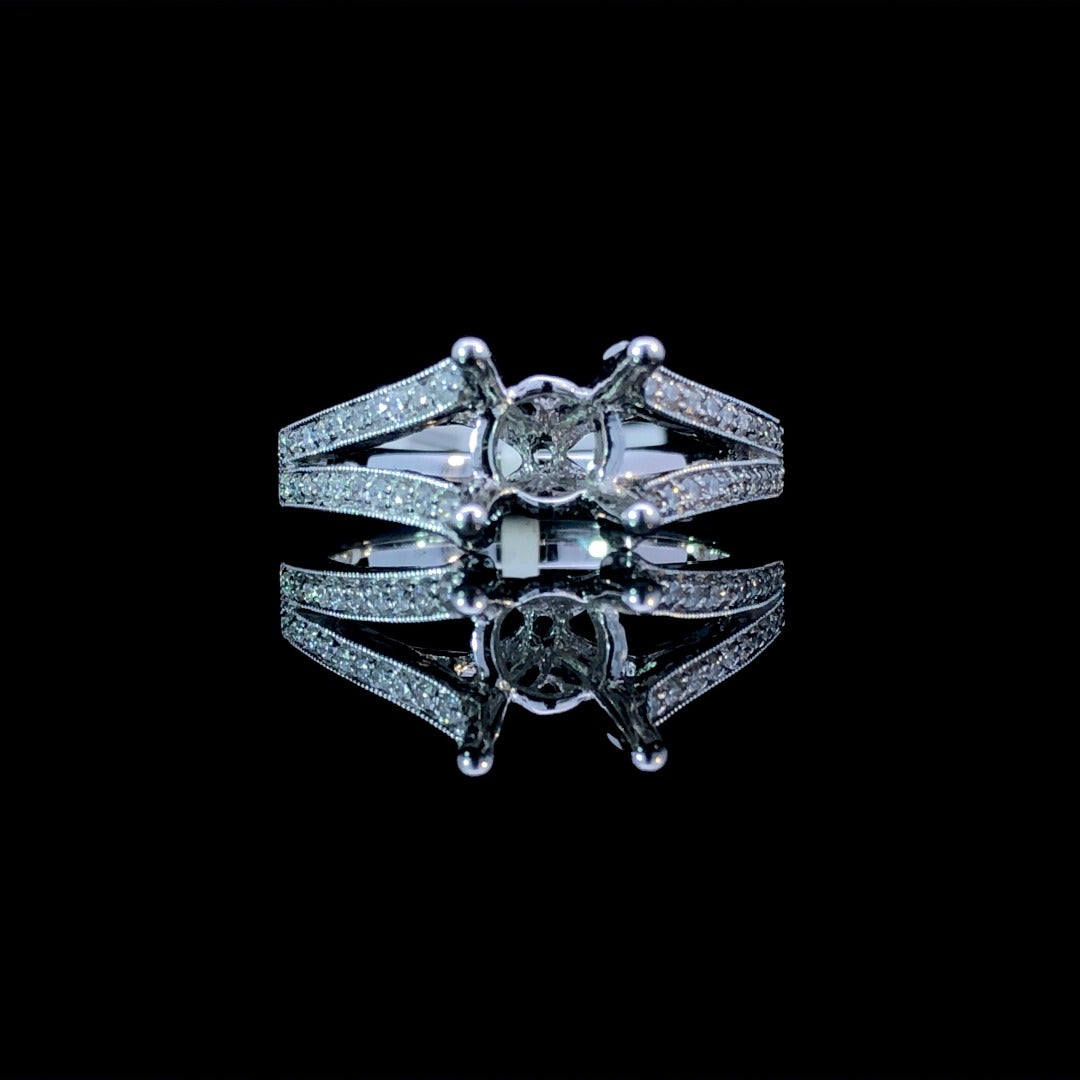 Choose your center stone and make a statement with this classic diamond semi mount. Handcrafted in 14kt white gold, the split shank design is adorned with .27ctw of round diamonds and delicate milgrain detailing. Customize your perfect ring with our wide selection of loose stones. Price is for the semi mount only. Center stone will be added at an additional cost. This ring is a size 6.5. If that size is not a perfect fit, first time sizing is free at the time of purchase. Additional sizing fees may apply.