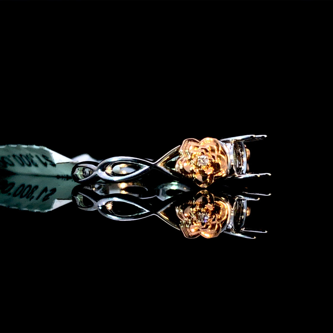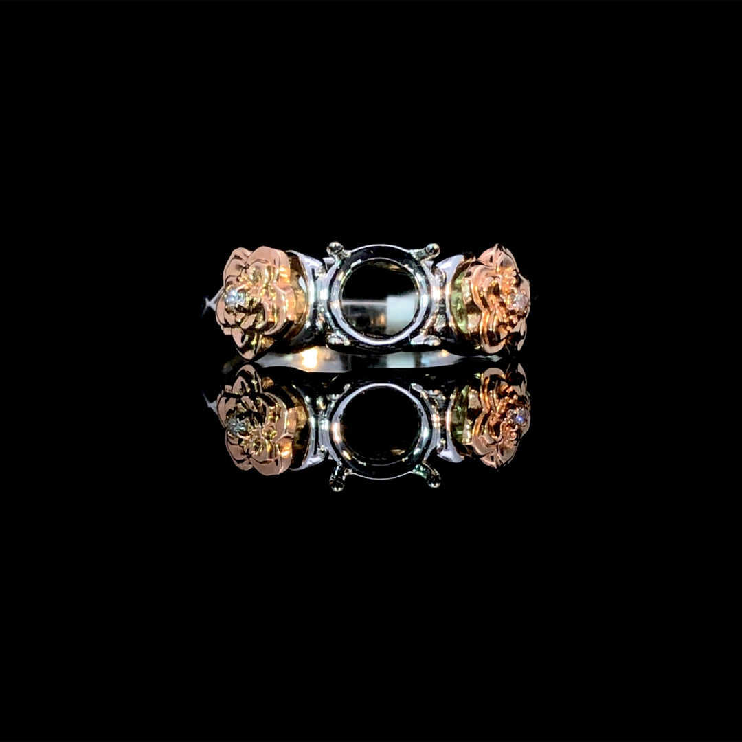 This distinctive diamond semi-mount ring showcases a 14kt two-tone design, featuring delicate rose gold roses on the sides accented with 0.02ctw of small diamonds. A twisted white gold band adds intricate detail, enhancing the elegance of this one-of-a-kind piece. Customize your ring by selecting a center stone from our unparalleled collection of loose stones to create a truly unique piece. Price is for the semi mount only. Center stone will be added at an additional cost. This ring is a size 6.75. If that size is not a perfect fit, it can be sized up 2 sizes for free at the time of purchase. Additional sizing fees may apply.