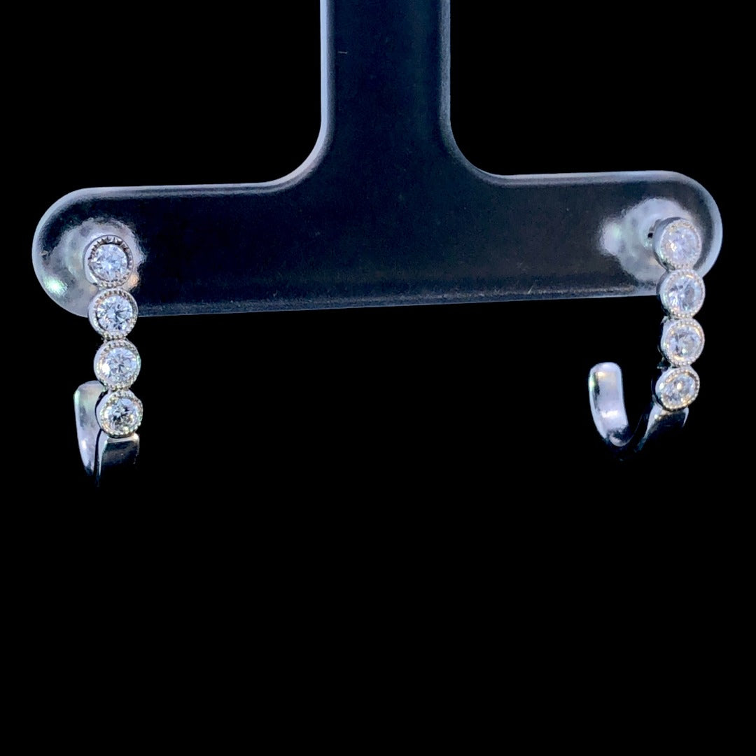 These 14kt white gold hoop earrings are distinguished by the intricate milgrain detailing and .23ctw of round diamonds bezel set along the edges. Perfect for special occasions, these earrings offer a timeless and classic look.
