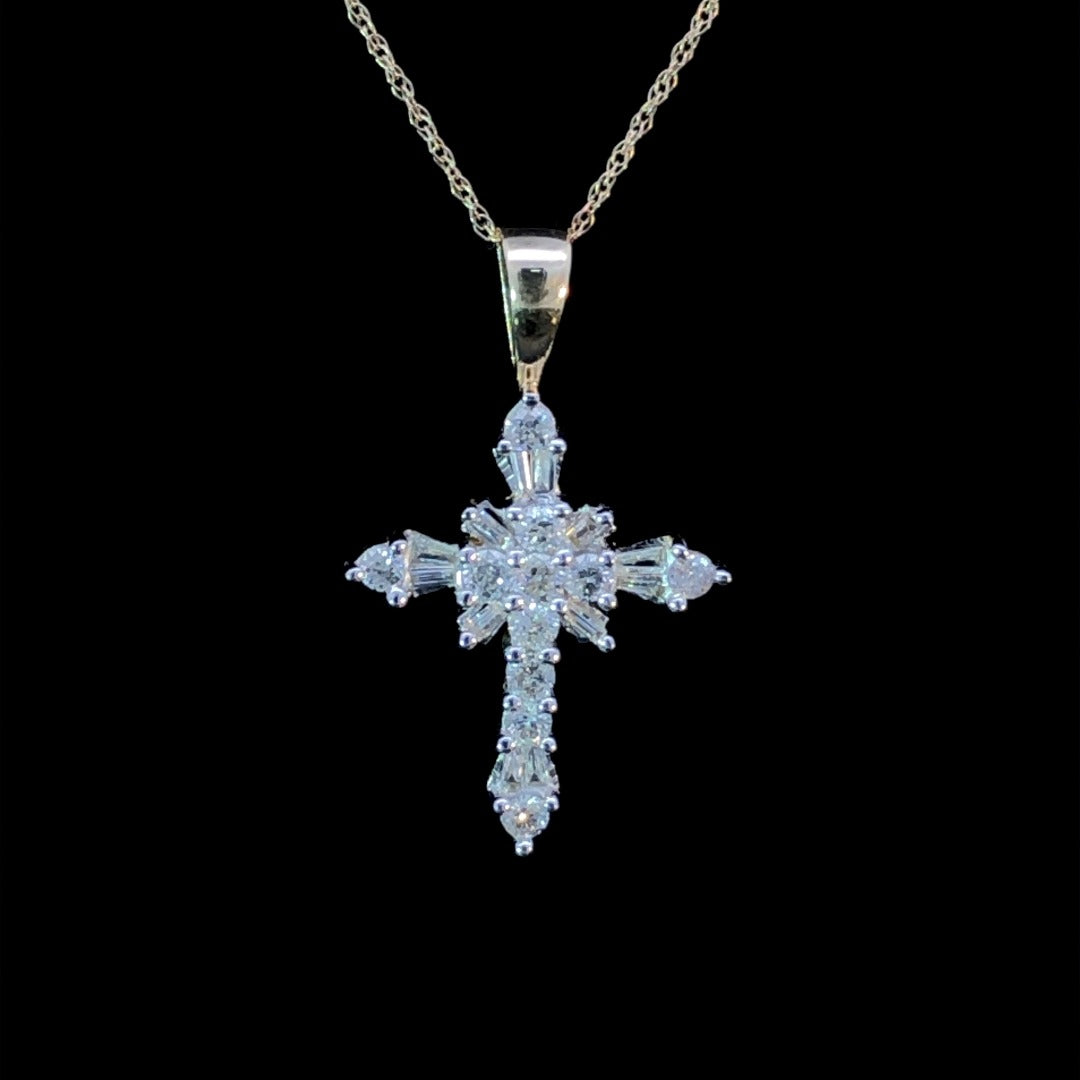 This stylish 14kt yellow gold cross set features sleek baguette and round diamonds totaling .52 ctw, providing a timeless symbol of faith with a luxurious finish. With diamonds placed artistically across the piece, the polished gold provides a stunning backdrop for the sparkling stones. Chain is not included.
