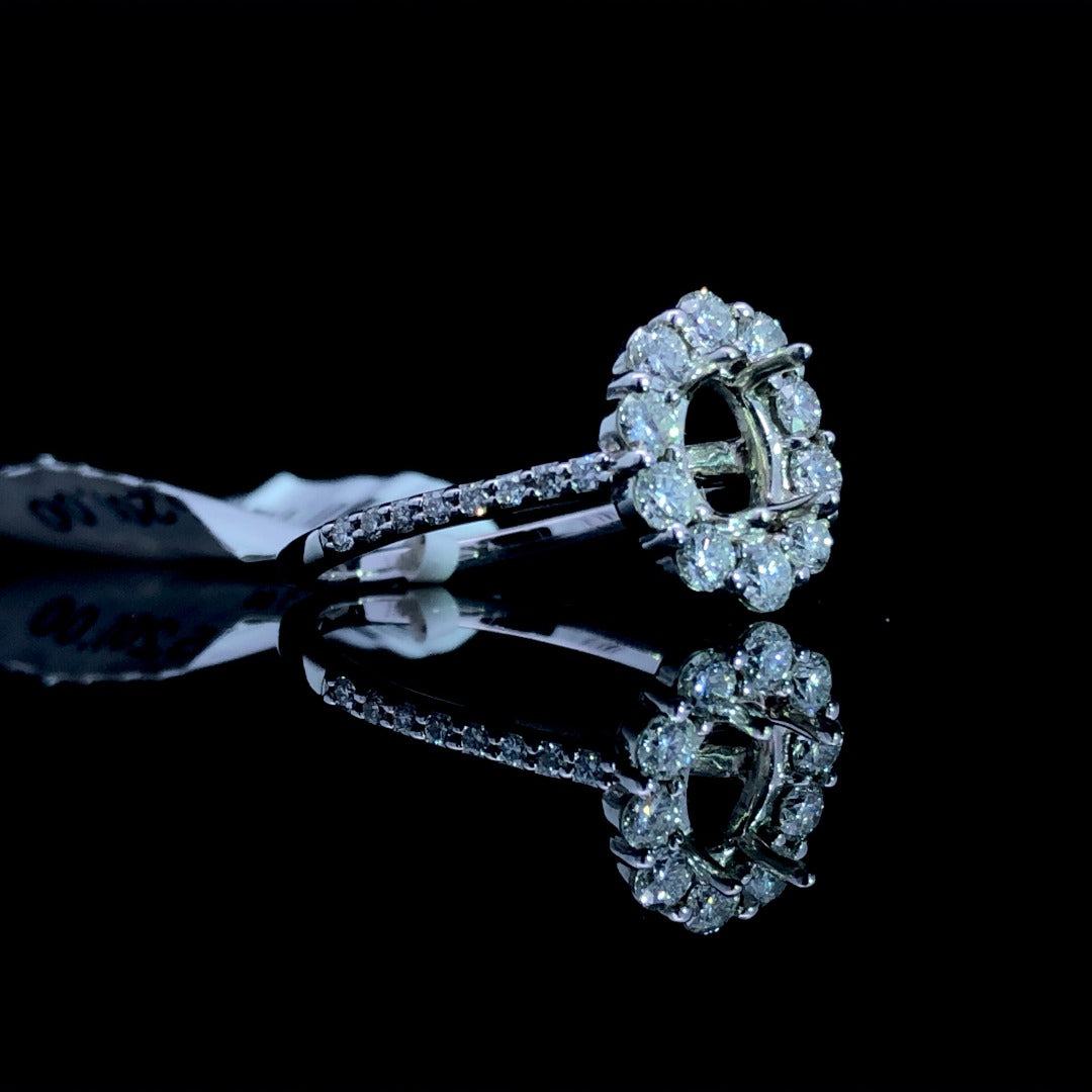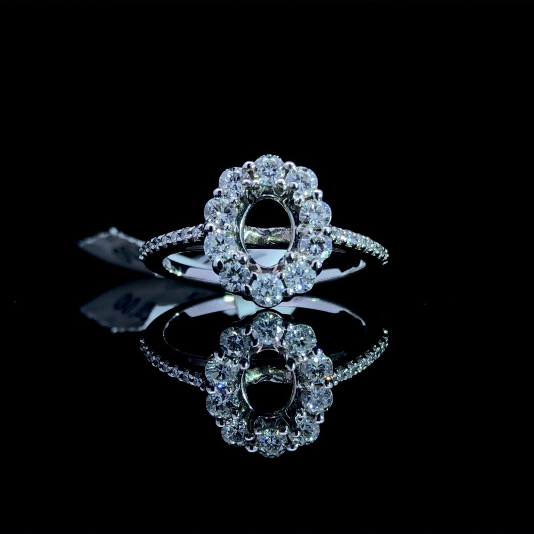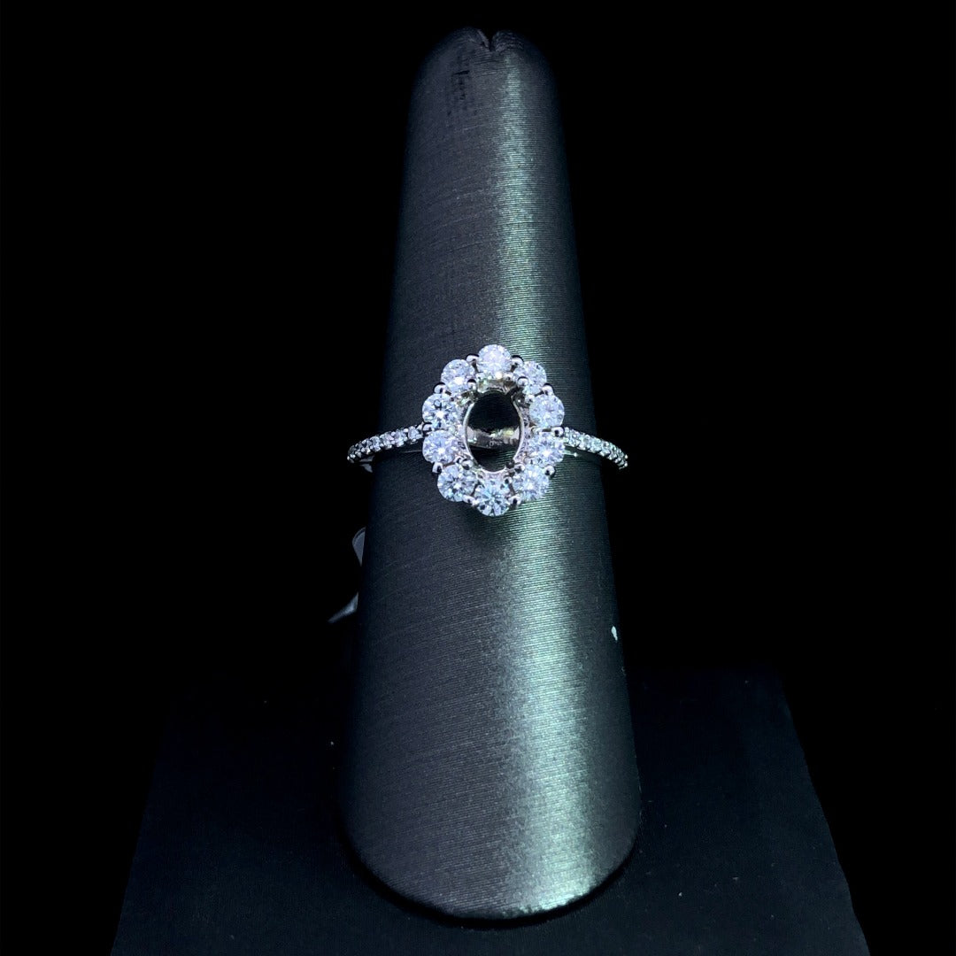 Bring your dream engagement ring to life with our stunning 14kt white gold semi mount, featuring a sparkling oval halo design adorned with round diamonds. The delicate band is also encrusted with smaller diamonds, totaling .77ctw, for a truly radiant look. Choose from our wide selection of loose stones to make it a unique and personalized piece. Price is for the semi mount only. Center stone will be added at an additional cost. This ring is a size 7. If that size is not a perfect fit, first time sizing is free at the time of purchase. Additional sizing fees may apply.
