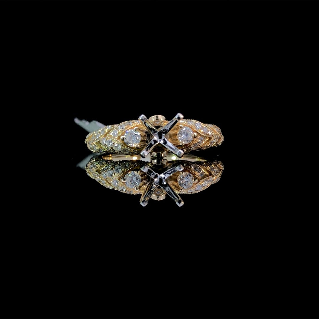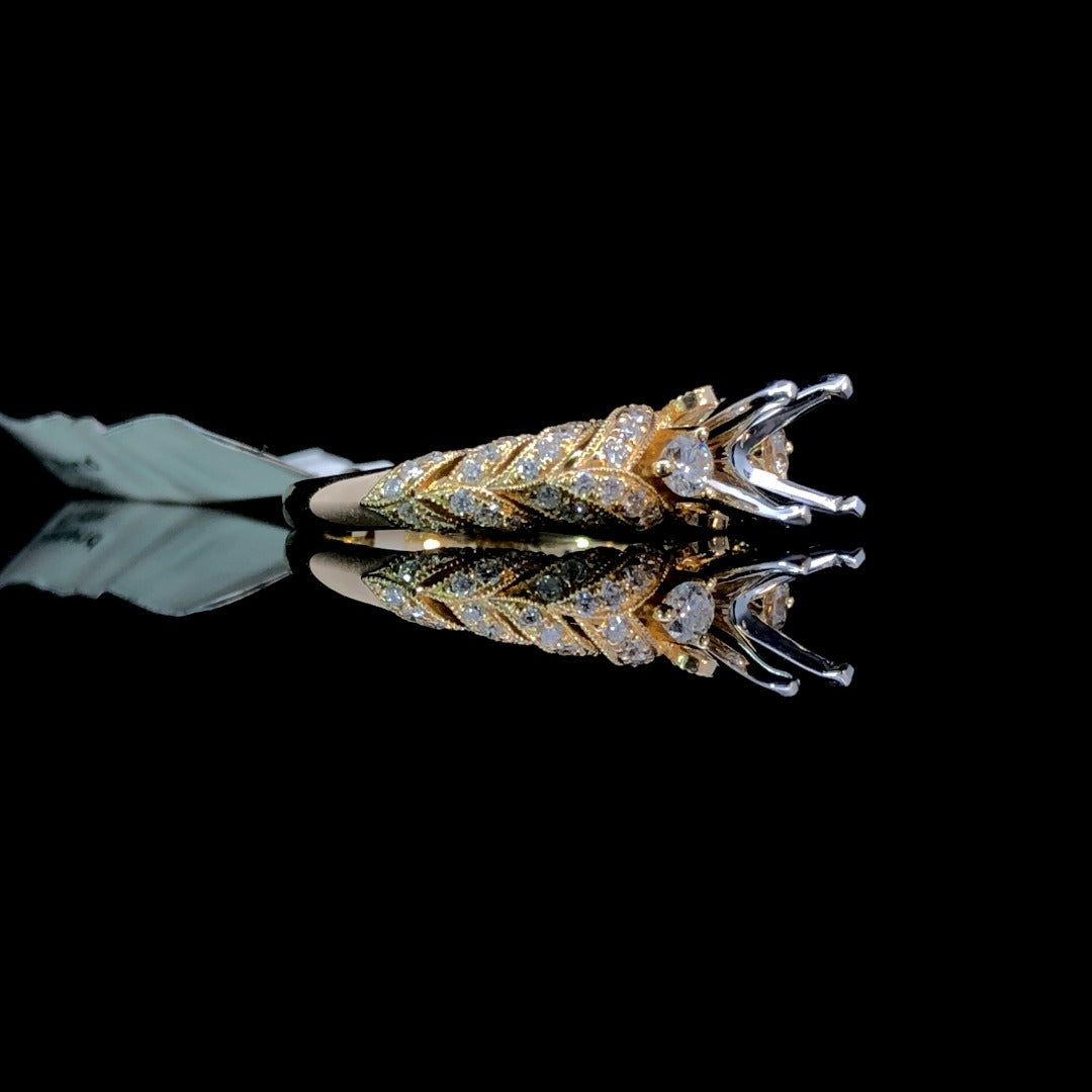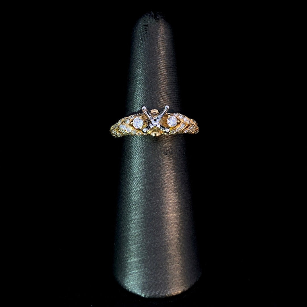 Add a touch of elegance to any outfit with our 14kt yellow gold diamond semi mount. The intricate design is adorned with .57ctw of sparkling round diamonds. Personalize it with your choice of center stone from our wide selection. Be prepared to make a statement and leave a lasting impression! Price is for the semi mount only. Center stone will be added at an additional cost. This ring is a size 6. If that size is not a perfect fit, first time sizing is free at the time of purchase. Additional sizing fees may apply.