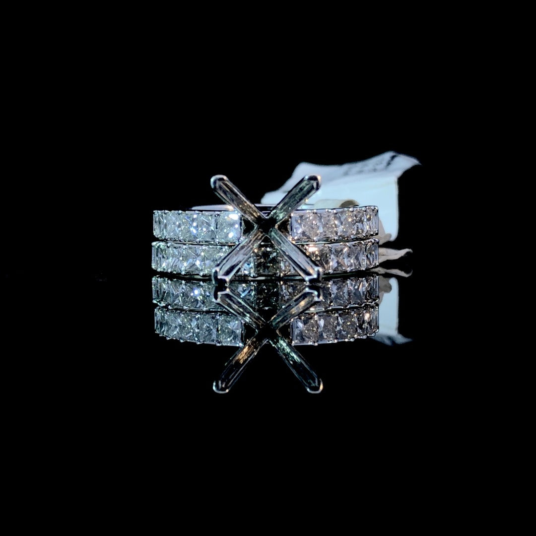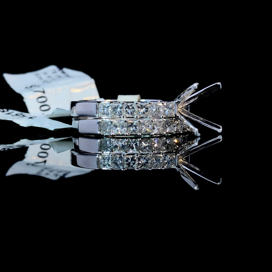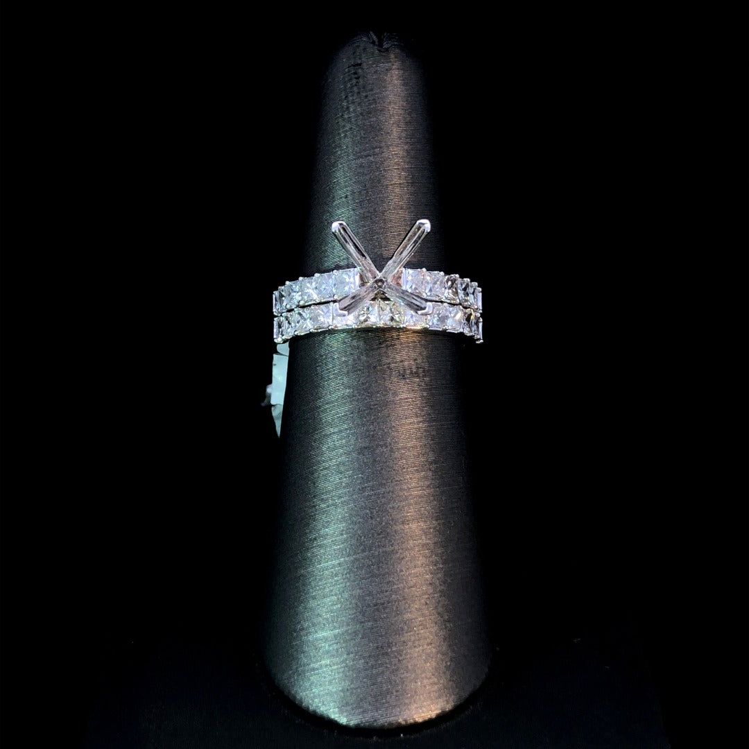 Be dazzling with this beautiful diamond semi mount. With .78ctw of princess cut diamonds on a 14kt white gold band, add your own center stone from our collection for a truly unique piece. Complete your bridal set with the matching .86ctw diamond band (sold separately) and shine brighter than ever before! Price is for the semi mount only. Center stone will be added at an additional cost. This ring is a size 6.5. If that size is not a perfect fit, first time sizing is free at the time of purchase. Additional sizing fees may apply.