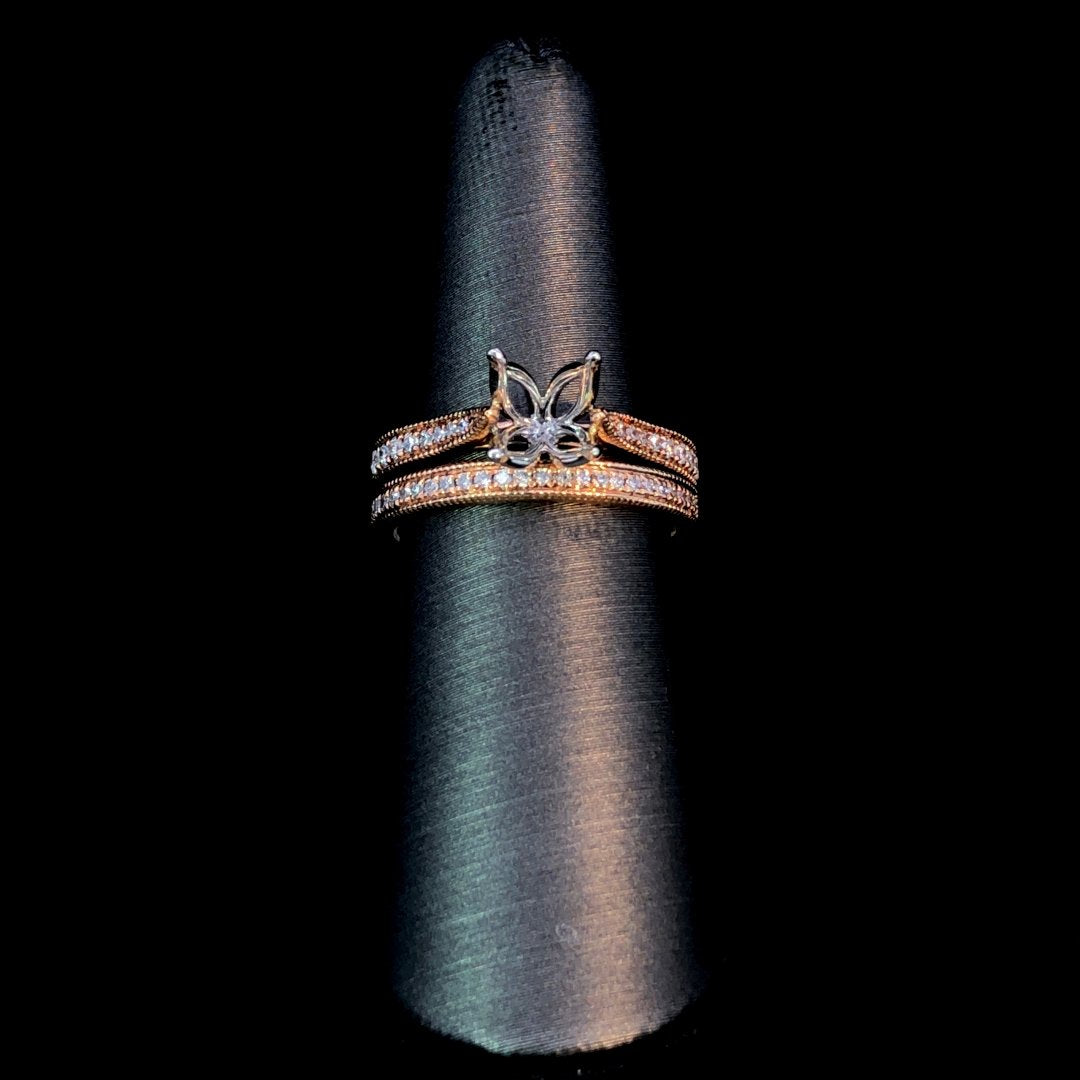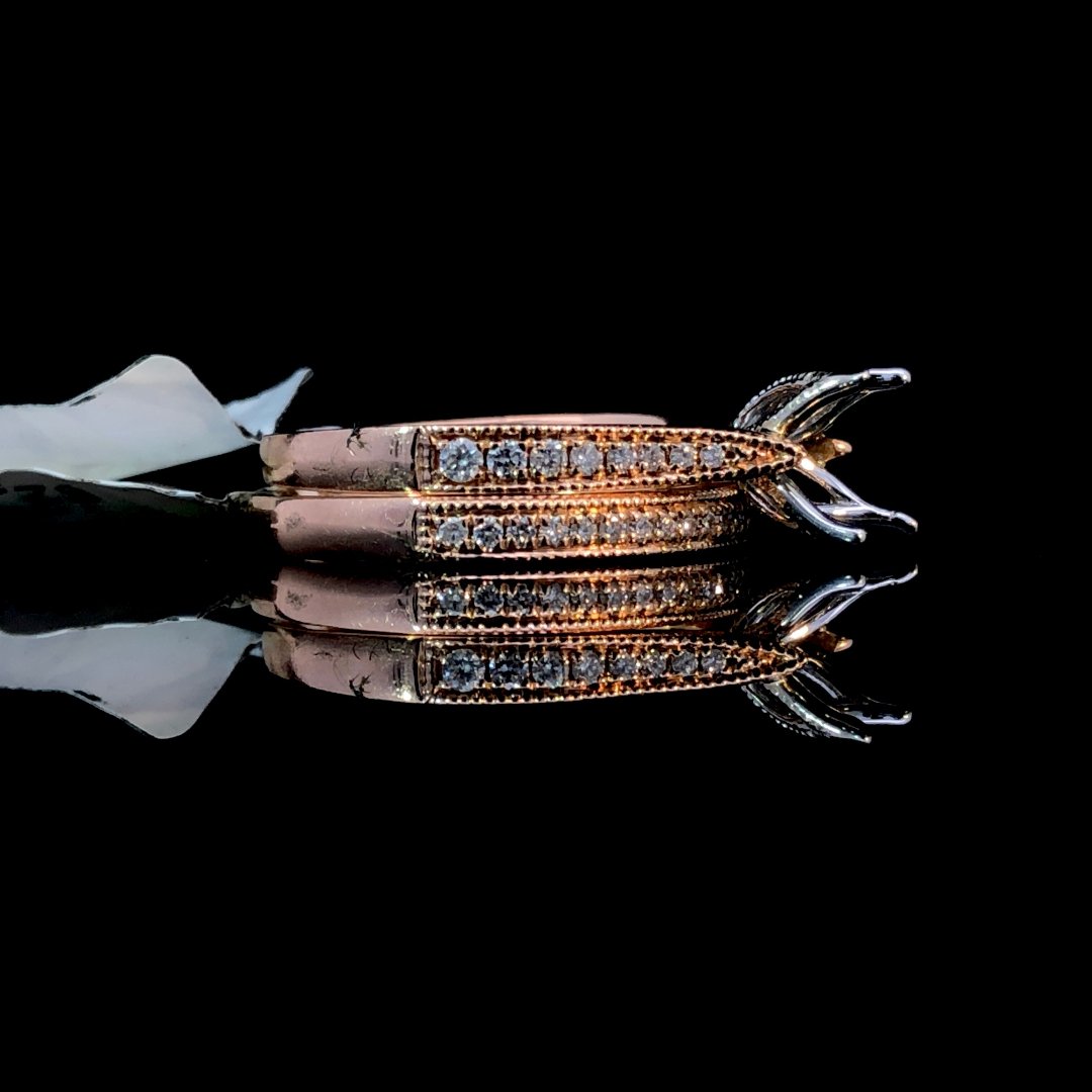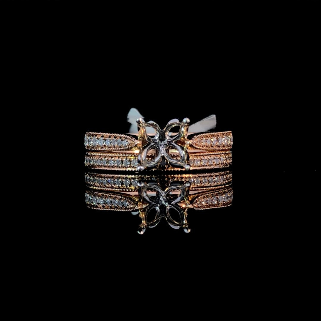 Create a stunning bridal set with this beautiful diamond semi mount. Its decorative head perfectly showcases your chosen center stone from our wide selection of loose stones. The 14kt rose gold setting is accented with .19ctw of round diamonds and delicate milgrain detailing. Complete the look with the matching diamond band (sold separately). Price is for the semi mount only. Center stone and band will be added at an additional cost. This ring is a size 7. If that size is not a perfect fit, first time sizing is free at the time of purchase. Additional sizing fees may apply.