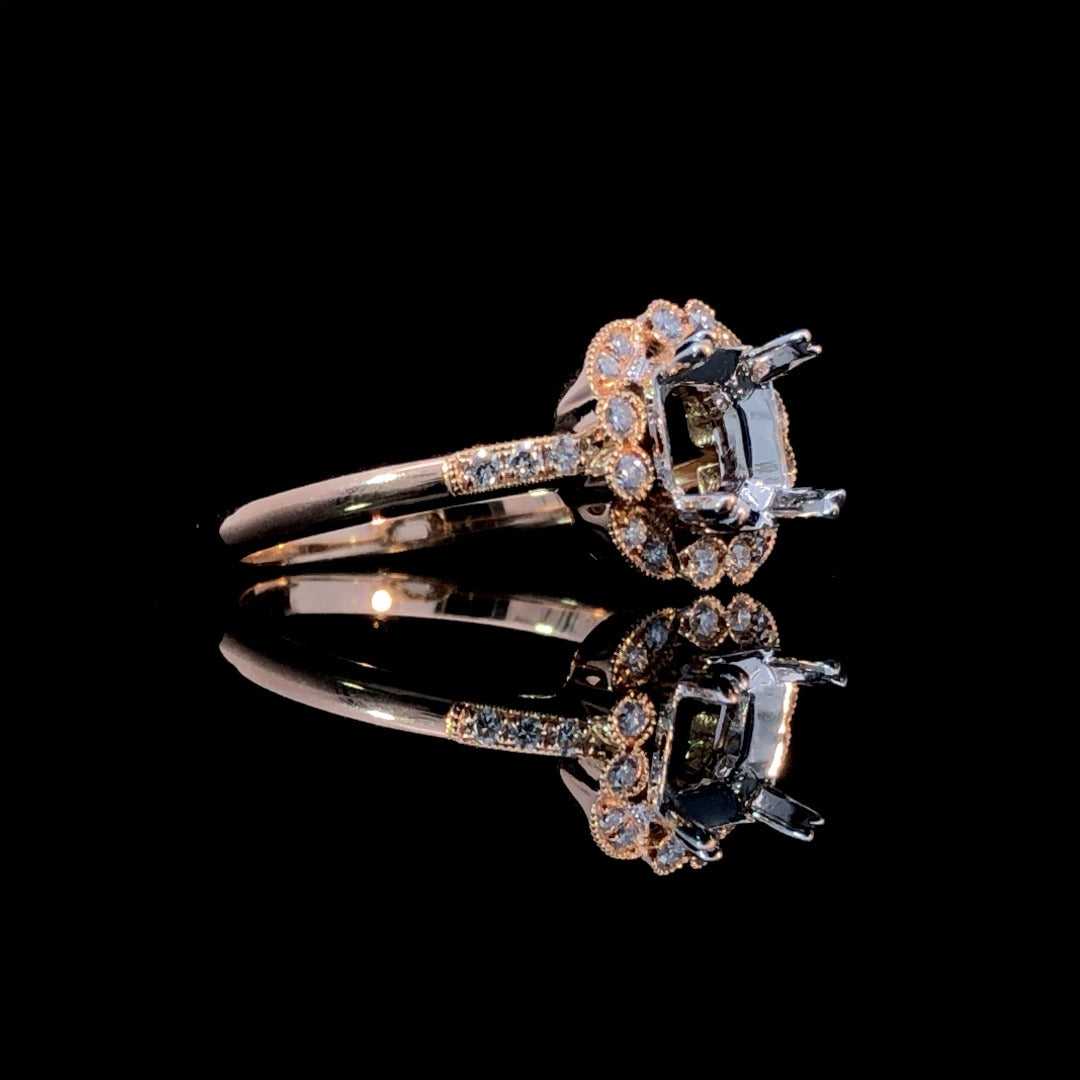 Indulge in luxury and elegance with this chic diamond semi mount. Adorned with a decorative halo and 6 round diamonds on the band, this piece exudes glamour. Crafted in 14kt rose gold with a total diamond weight of .17ctw. Choose your perfect center stone from our stunning selection to complete this masterpiece. Price is for the semi mount only. Center stone will be added at an additional cost. This ring is a size 6. If that size is not a perfect fit, first time sizing is free at the time of purchase. Additional sizing fees may apply.