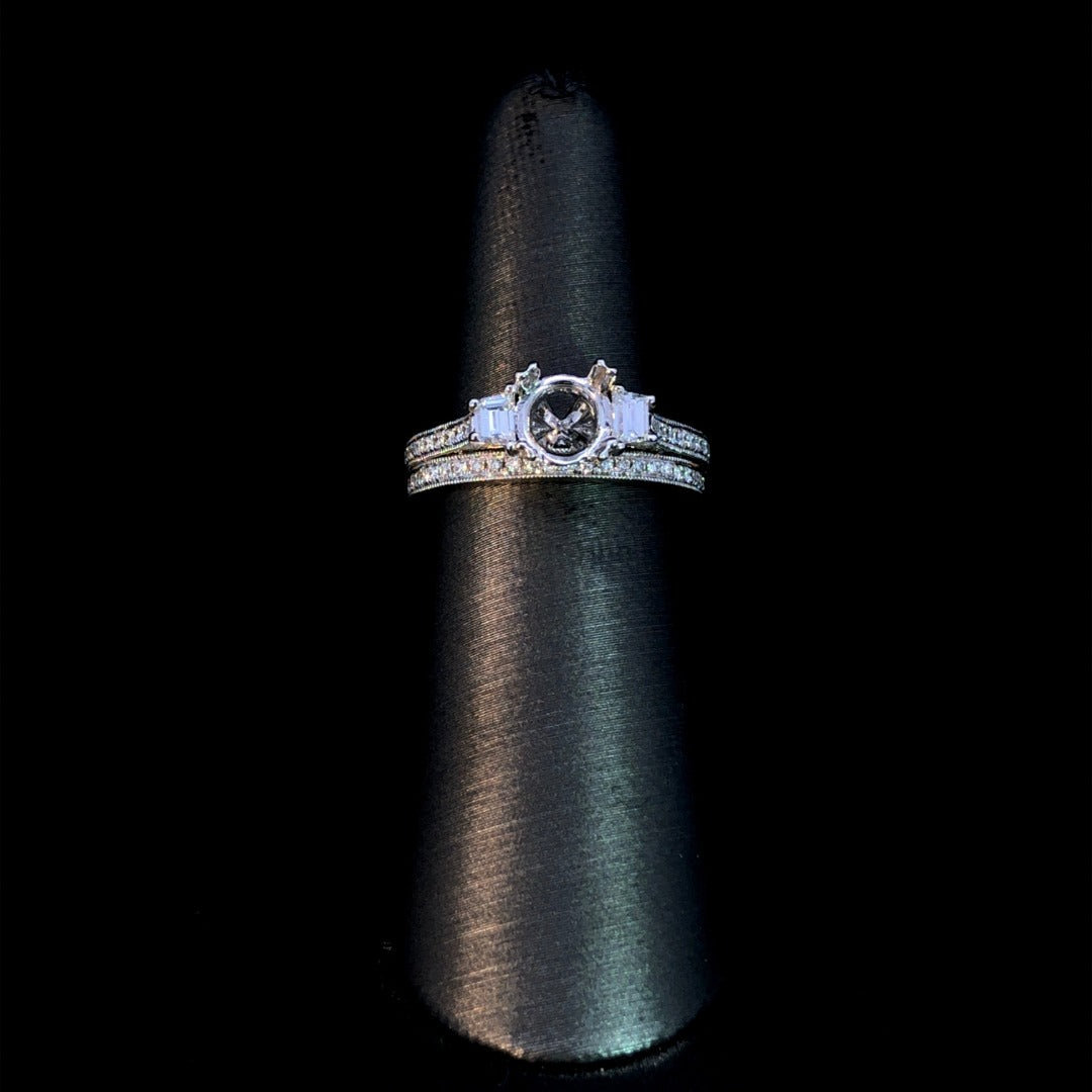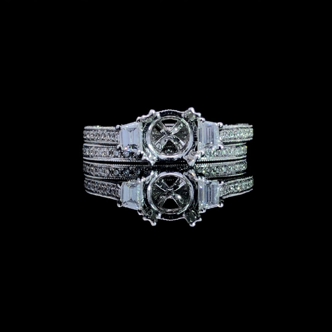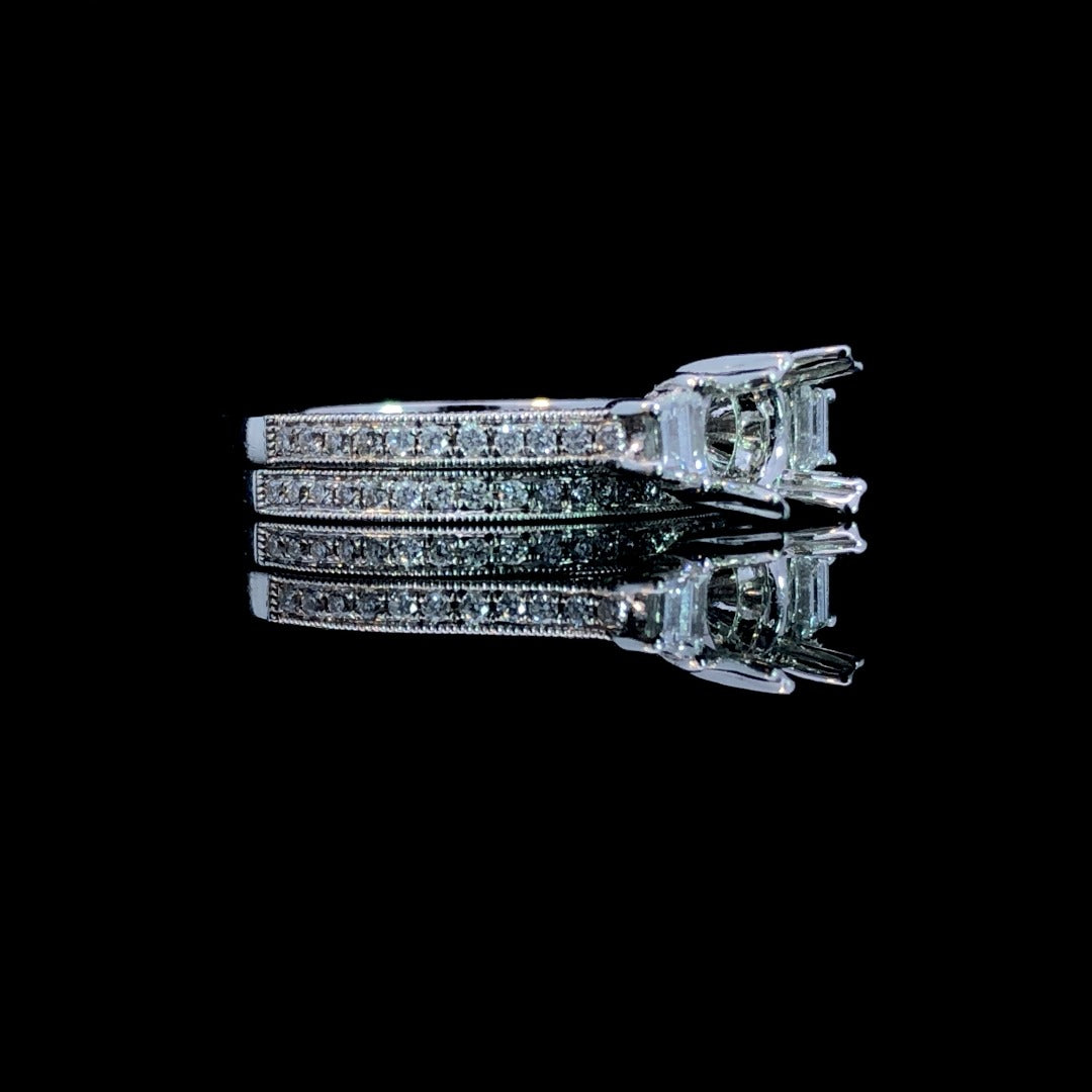 Indulge in luxury with this diamond semi mount featuring a stunning design of 2 emerald cut side stones totaling .28ctw and .52ctw of round diamond accents in 14kt white gold with milgrain details. With a customizable center stone and the option to add a matching diamond band, this elegant bridal set will be the talk of the town. Price is for the semi mount only. Center stone will be added at an additional cost. This ring is a size 6. If that size is not a perfect fit, first time sizing is free at the time of purchase. Additional sizing fees may apply.
