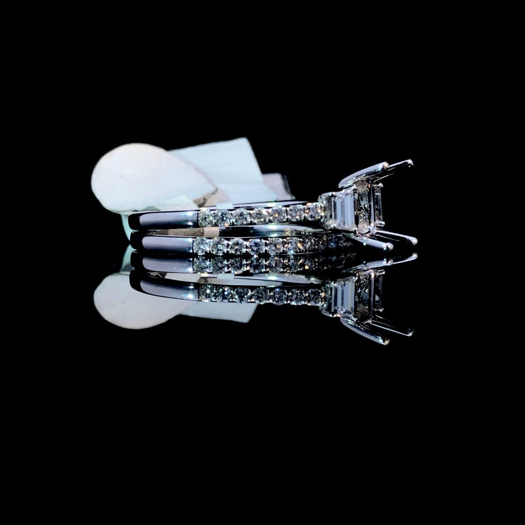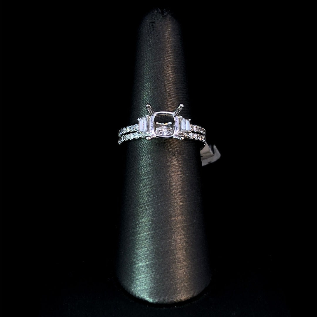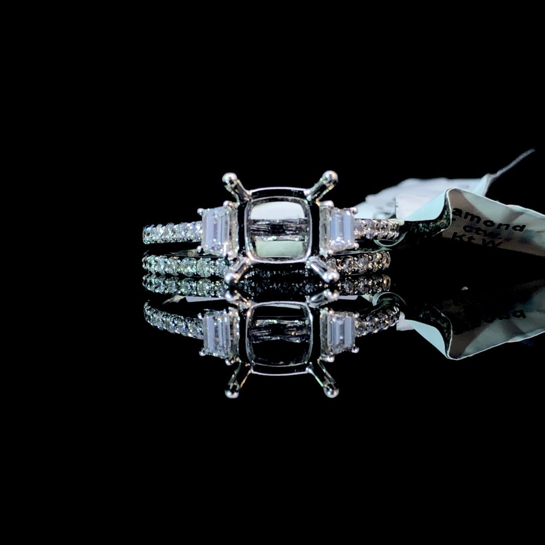 Style meets luxury with this stunning 14kt white gold diamond semi. With 2 side diamonds flanking the head and sparkling round diamonds cascading down the band, this semi boasts a total diamond weight of .47ctw. Customize your look with a center stone of your choice, or complete the set with the matching .27ctw diamond band (sold separately). Experience premium craftsmanship and elegance with every wear. Price is for the semi mount only. Center stone will be added at an additional cost. This ring is a size 6. If that size is not a perfect fit, first time sizing is free at the time of purchase. Additional sizing fees may apply.