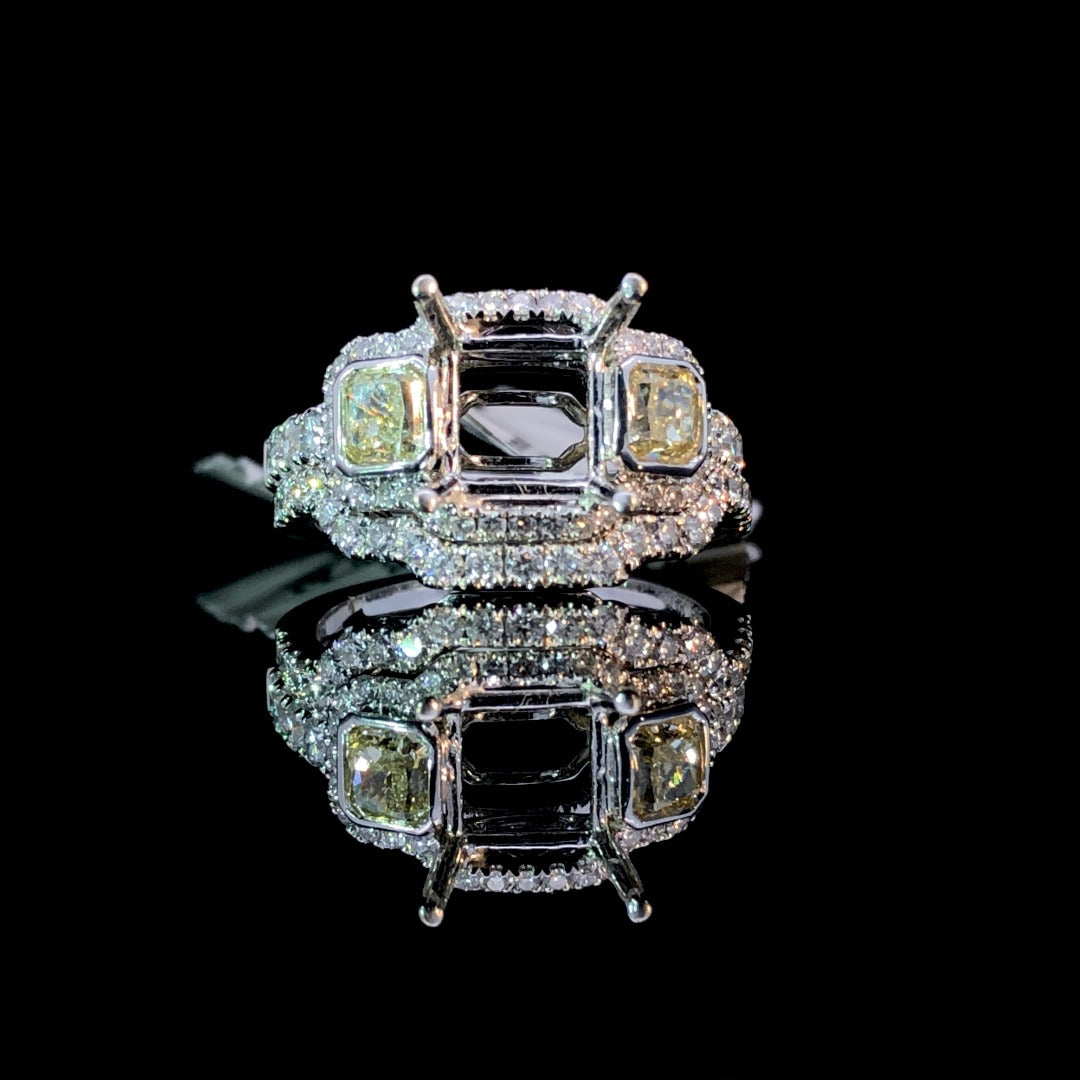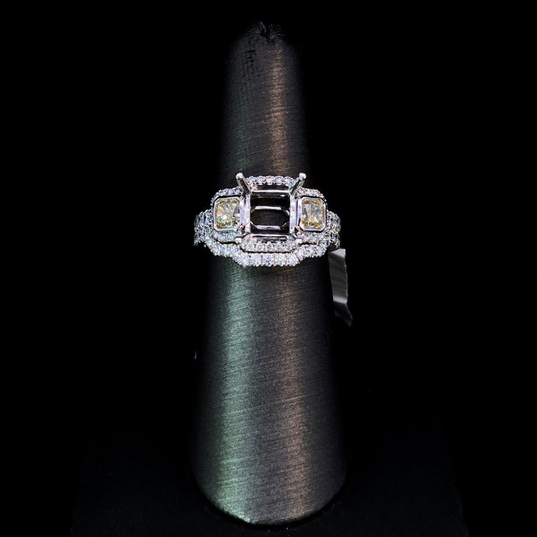 Add a touch of color to your elegant ensemble with this gorgeous diamond semi mount. Featuring 1.47ctw of diamonds, including 2 yellow diamonds and surrounded by halos of round diamonds, this ring is a true statement piece. Choose your own center stone from our unbeatable selection to complete the beautiful design. Don't forget to pair it with the matching contour band (sold separately) for a complete set! Price is for the semi mount only. Center stone will be added at an additional cost. This ring is a size 6.5. If that size is not a perfect fit, first time sizing is free at the time of purchase. Additional sizing fees may apply.