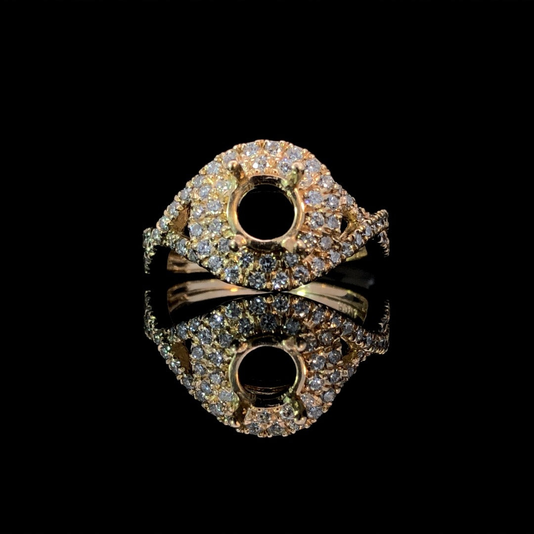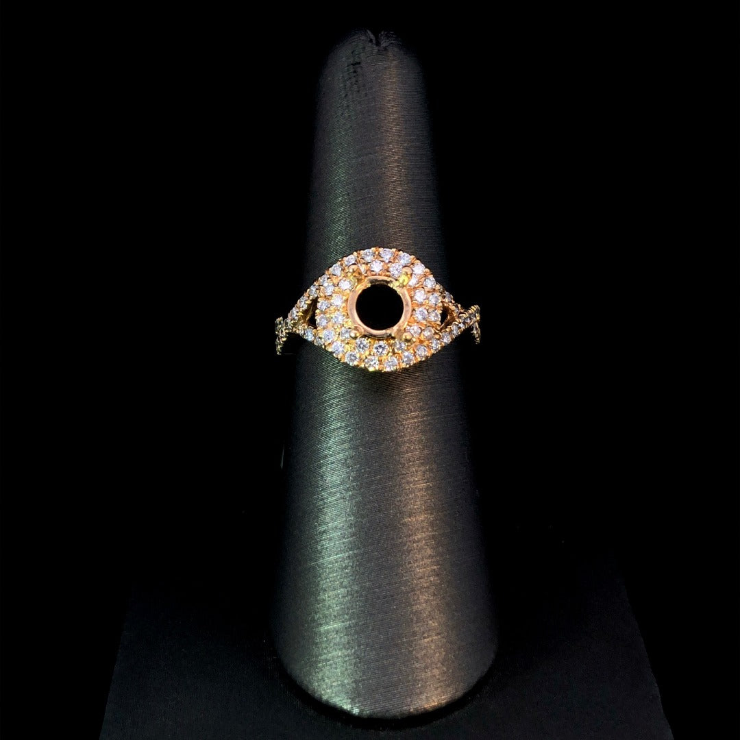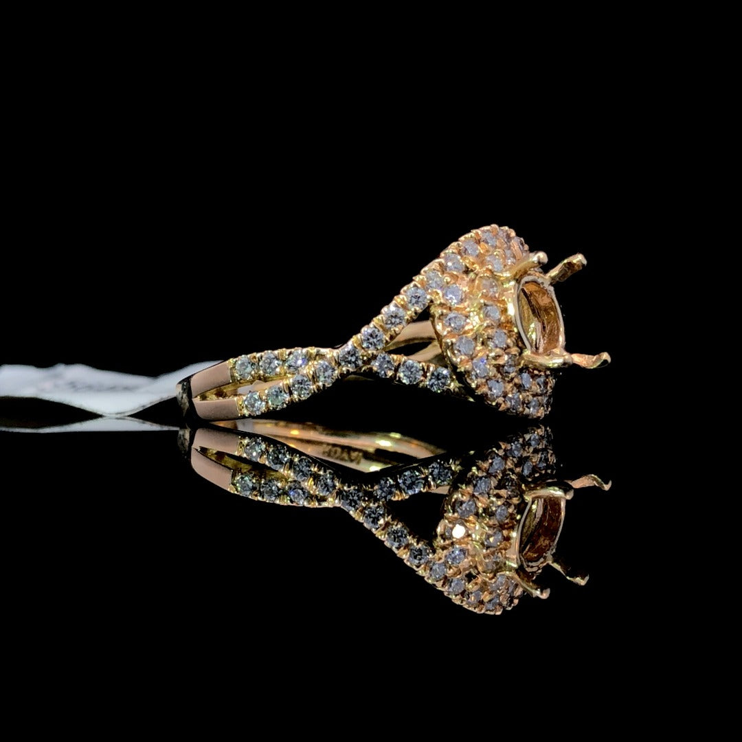 This stunning diamond semi mount offers a unique double halo design and a twisted band, showcasing a total diamond weight of .73ctw. Crafted in 14kt yellow gold, complete this luxurious piece by selecting your own center stone from our exquisite collection, expertly set by our in-house jewelers within the day. Price is for the semi mount only. Center stone will be added at an additional cost. This ring is a size 6.5. If that size is not a perfect fit, firs time sizing is free at the time of purchase. Additional sizing fees may apply.
