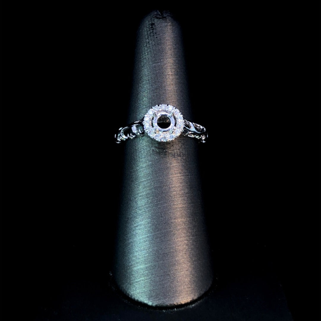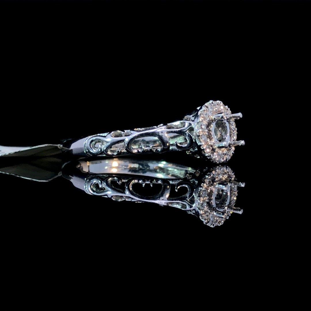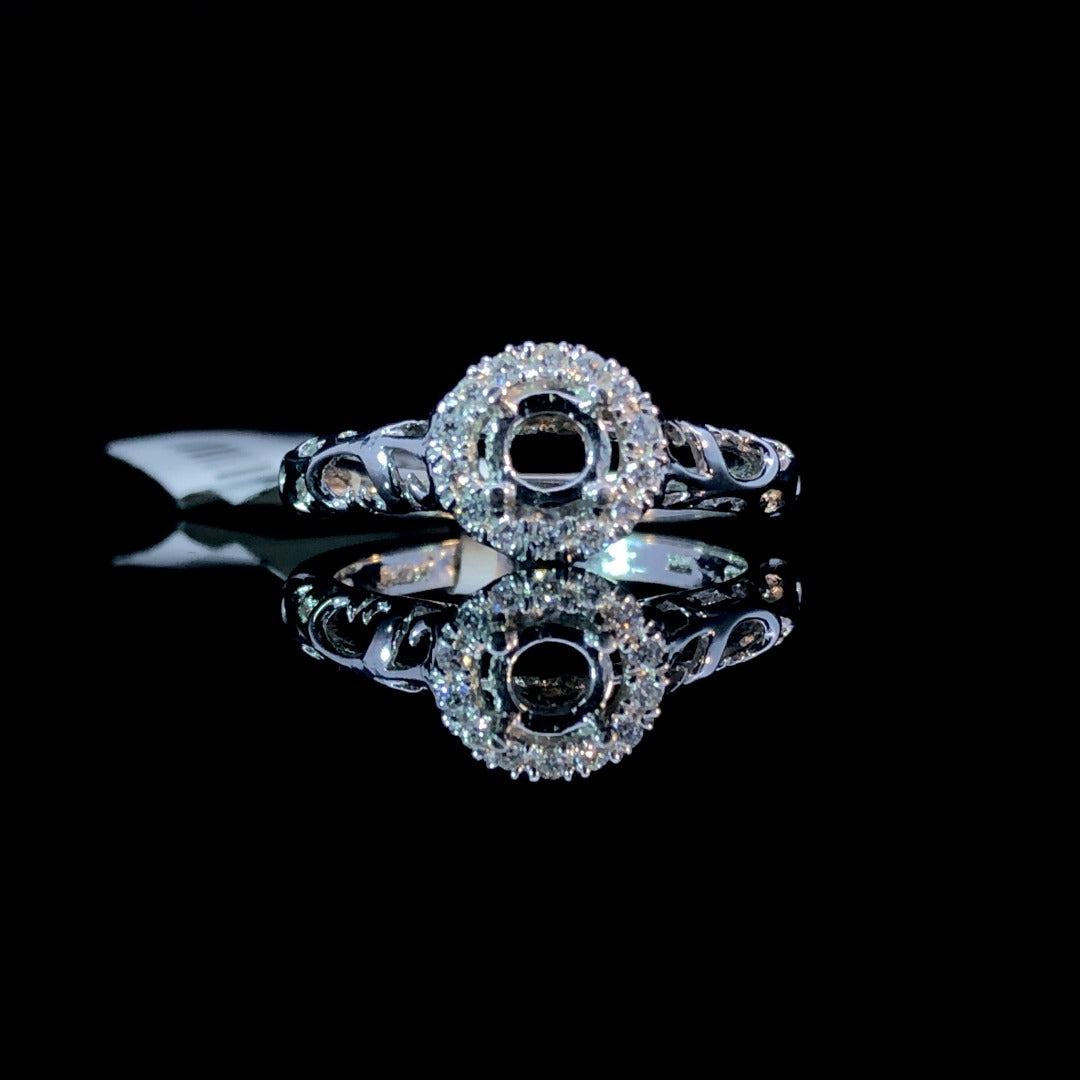 Elevate your style with this exquisite diamond semi mount. The round halo adorned with .12ctw of diamonds exudes luxury, complemented by a 14kt white gold filigree band. Complete the look with your choice of center stone from our unbeatable selection. Immerse yourself in elegance with this one-of-a-kind piece. Price is for the semi mount only. Center stone will be added at an additional cost. This ring is a size 6.25. If that size is not a perfect fit, first time sizing is free at the time purchase. Additional sizing fees may apply.