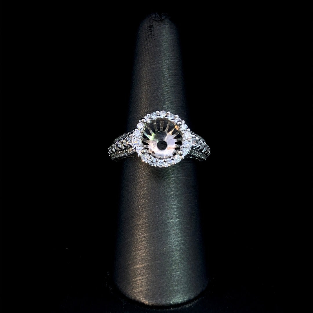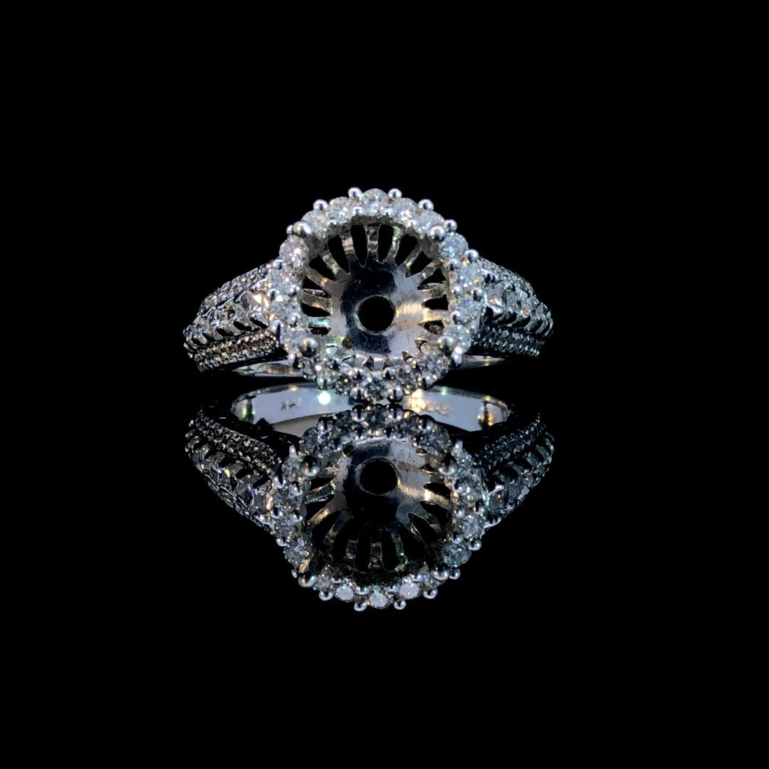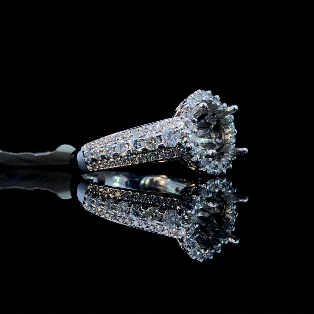 Indulge in luxury with this stunning diamond semi mount. Choose from our unmatched selection of loose stones for the center stone, enveloped by a round halo and a triple row band adorned with 1.03ctw of diamonds set in 14kt white gold. Make a statement that will shine for years to come. Price is for the semi mount only. Center stone will be added at an additional cost. This ring is a size 7. If that size is not a perfect fit, first time sizing is free at the time of purchase. Additional sizing fees may apply.